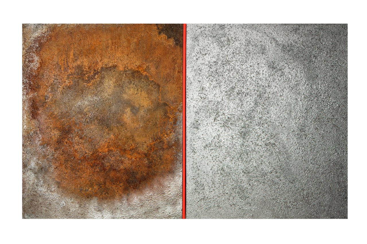 Salton Sea barnacles and fish bones, desert sand, salt, flagging tape, metallic enamel with acidic conversion on wood composite