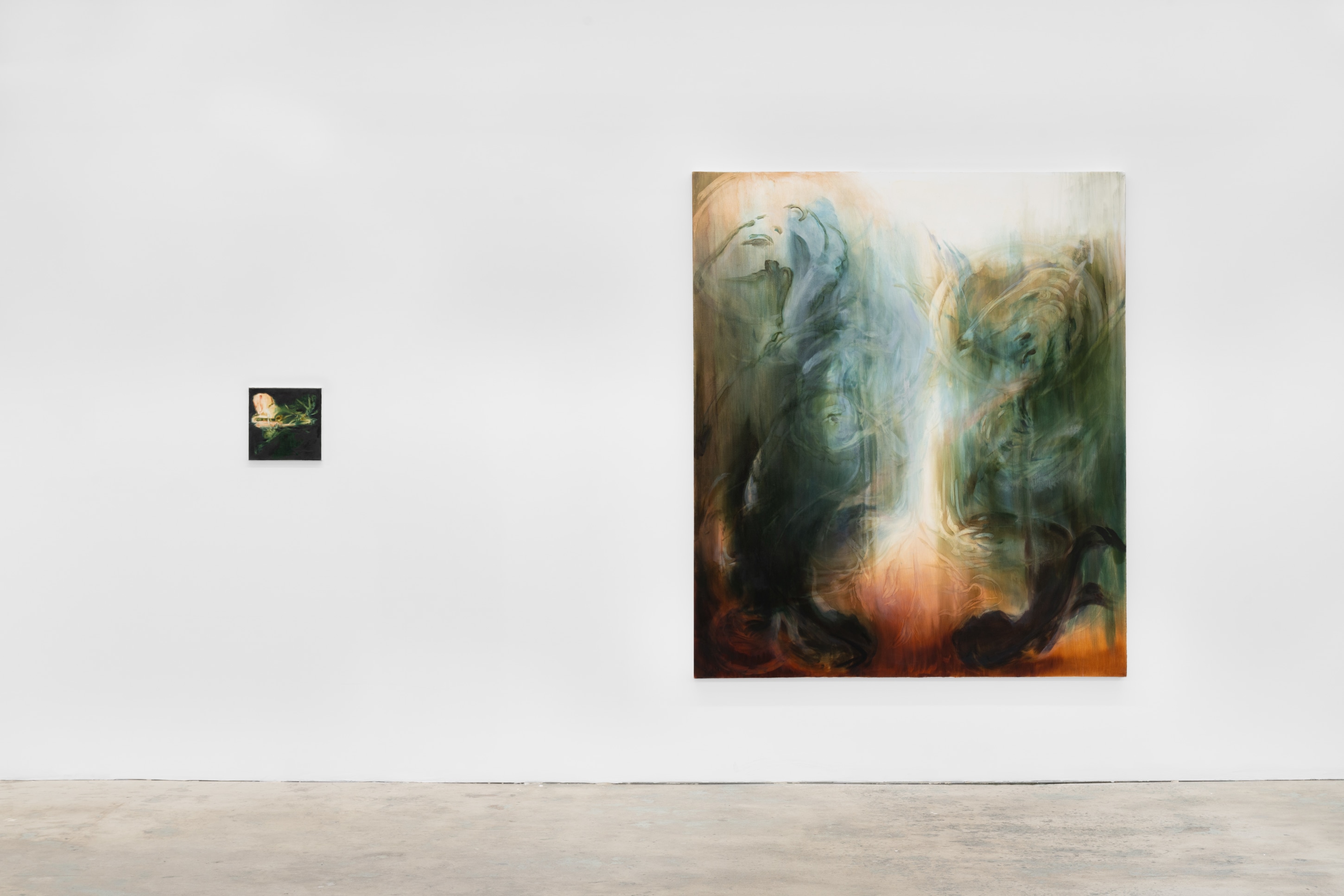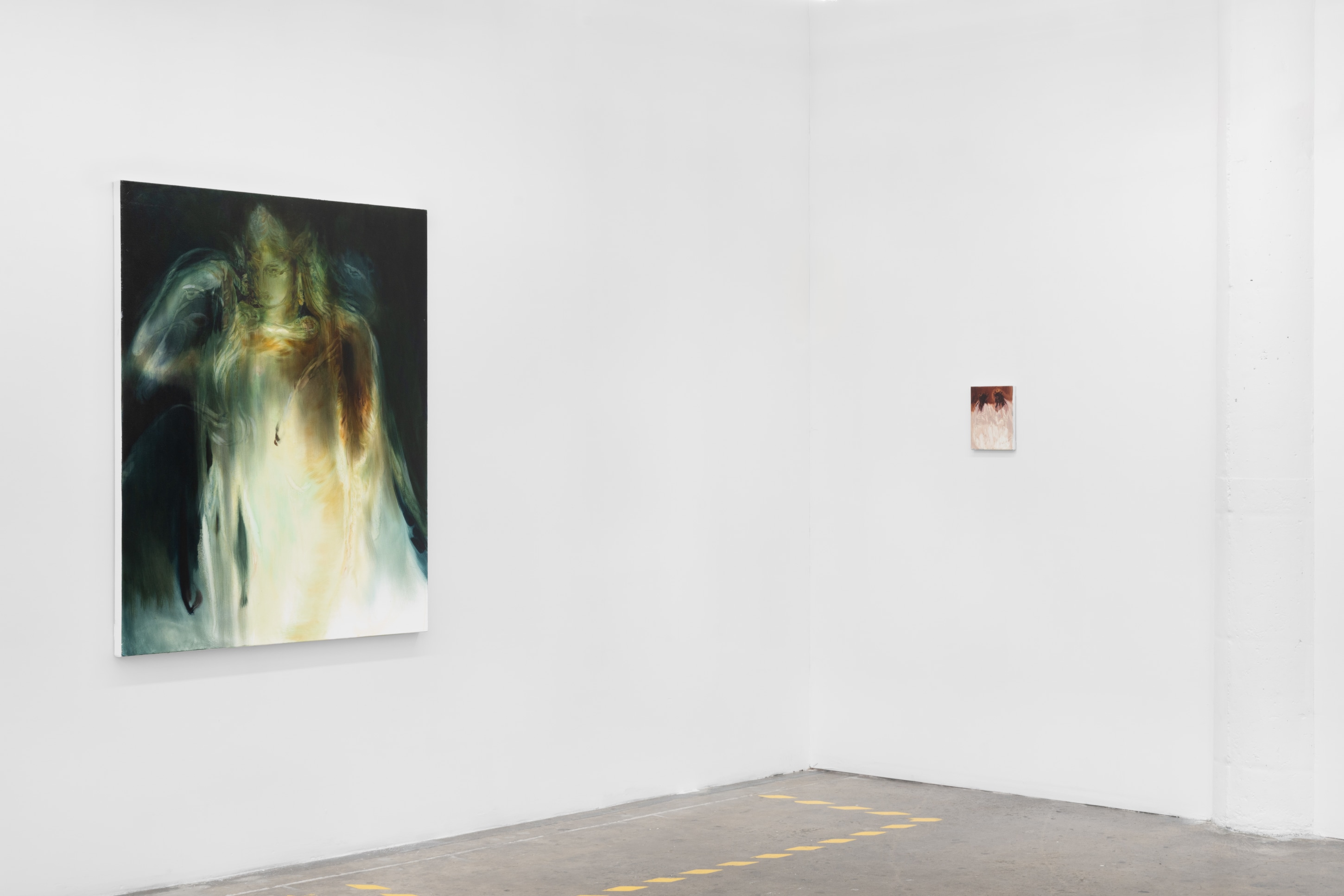 Raised between Roman Catholic and Greek Orthodox communities, Khoury recognizes that the religious figurines, antique vessels, fabrics, finger bowls, candlesticks, and various other tchotchkes that surrounded her in the homes of her grandparents and extended family, represent a connection to, and simultaneous withdrawal from, their home countries. The traces of recognizable subjects found in Khoury’s work, such as the Virgin Mary in MaryMary (2023), or perhaps a Greco-Roman figurine in She rises from the sea, holding her locks (2023) point to that connection-withdrawal, materially and metaphorically. By referencing items that exist primarily in domestic spaces, Khoury cites a type of intimacy tied specifically to the home. The meaning applied to these objects is constantly shifting, reflecting the intersecting nature of one’s personal heritage. Though she begins with a singular reference, the end result highlights a varied understanding of these broader cultural landscapes and migration stories.
