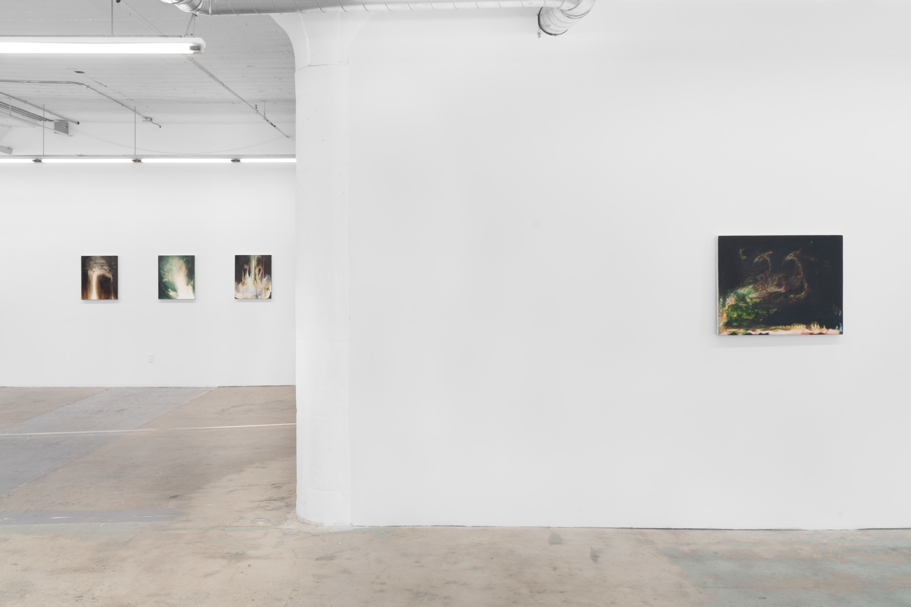 Khoury utilizes a specific approach to abstraction—experimenting with the building up, then breaking down of oil paints and mineral spirits—to conjure memories that are deeply personal, while incorporating forms that feel universal. This method of applying and removing paint articulates a process of transience and transformation, presence and absence. Further, inspired by poet Etal Adnan and her approach to repetition, Khoury readily repeats and abstracts familiar forms, revealing new metaphysical and structural entry points in each painting. Through this process, the artist iterates on the histories of migration, and the deep connections we forge to domestic objects that come to represent our identities. By repeating these signifiers, Khoury contemplates the cultural isolation that can be caused through centuries of migration, war, and ruptures in family histories.