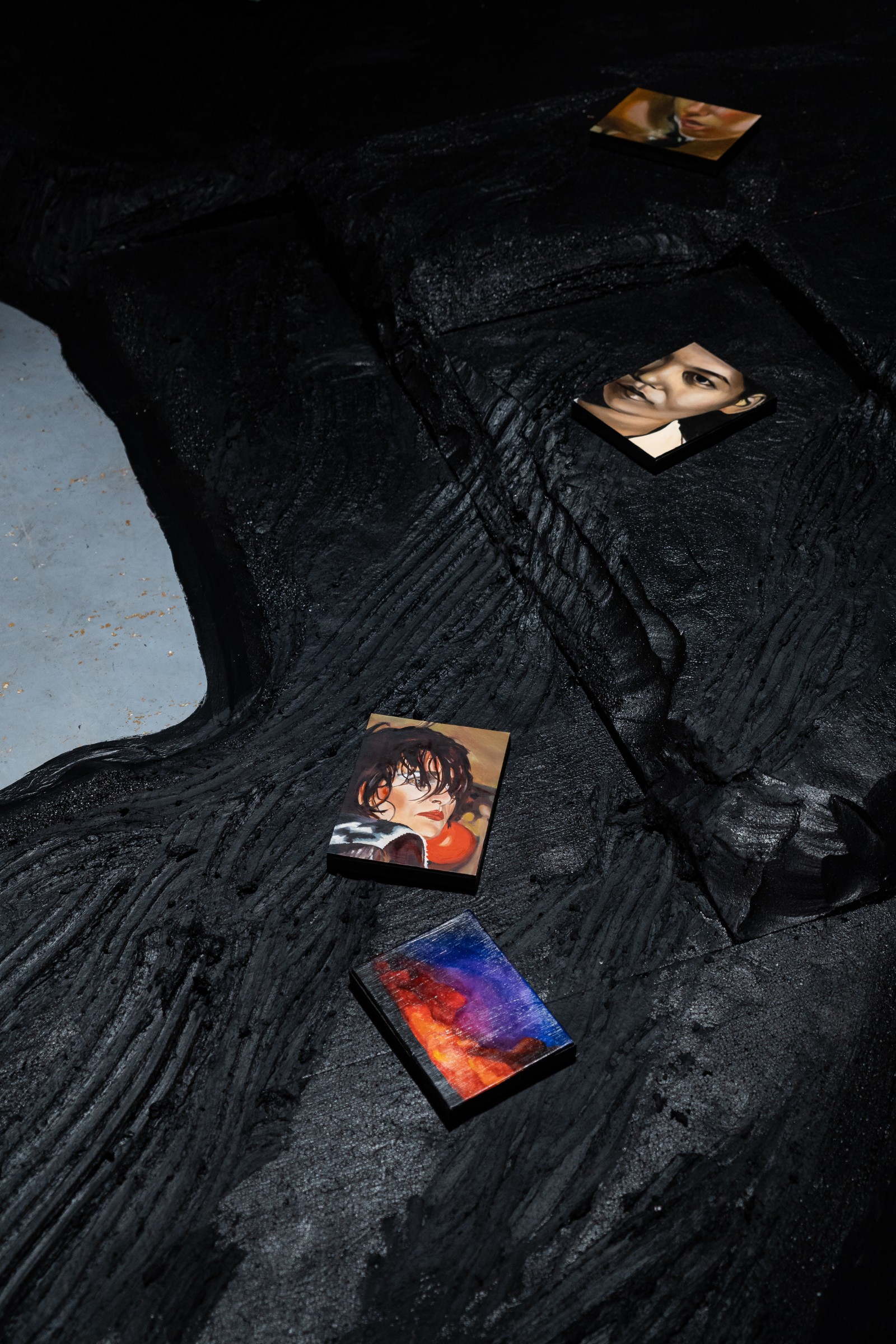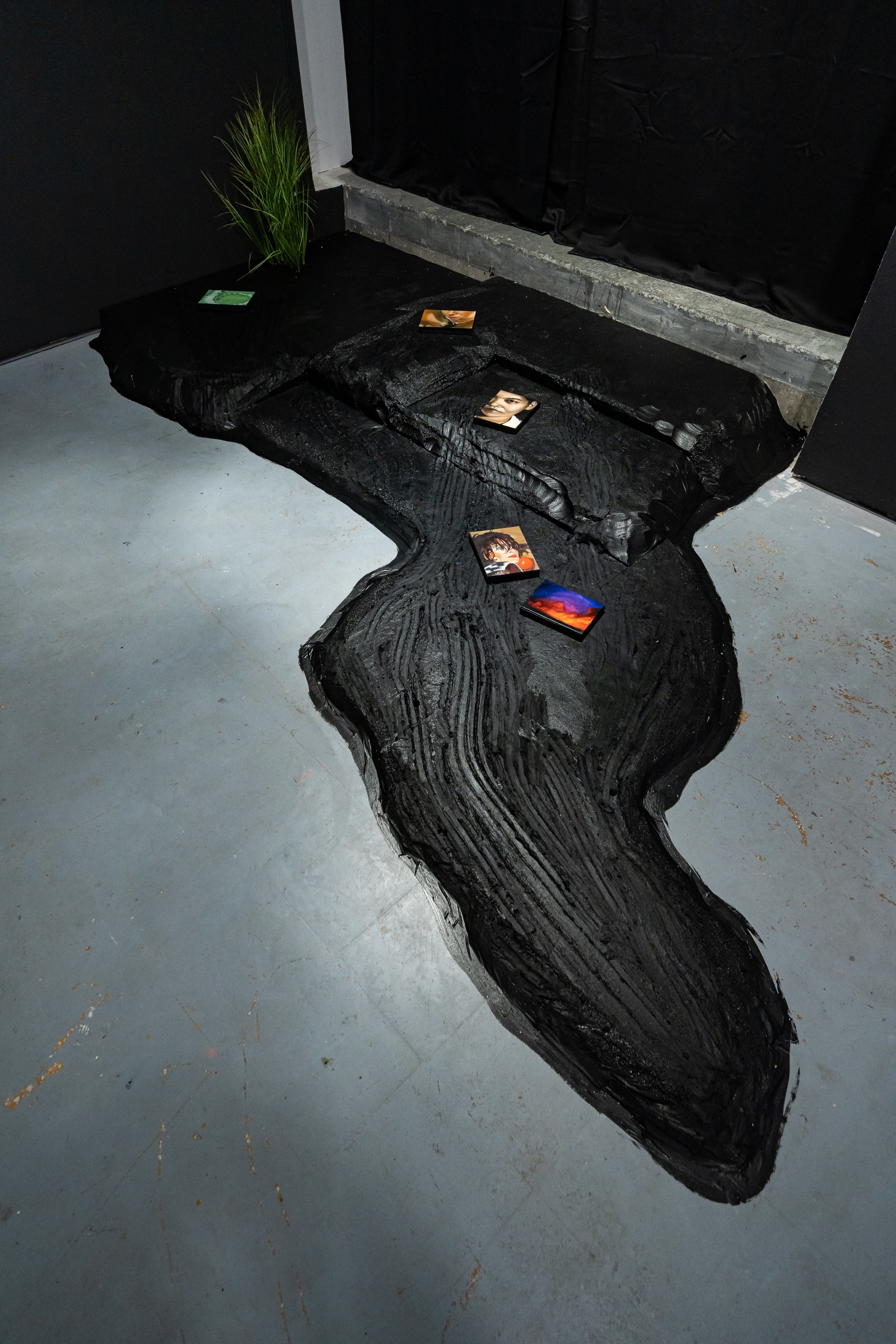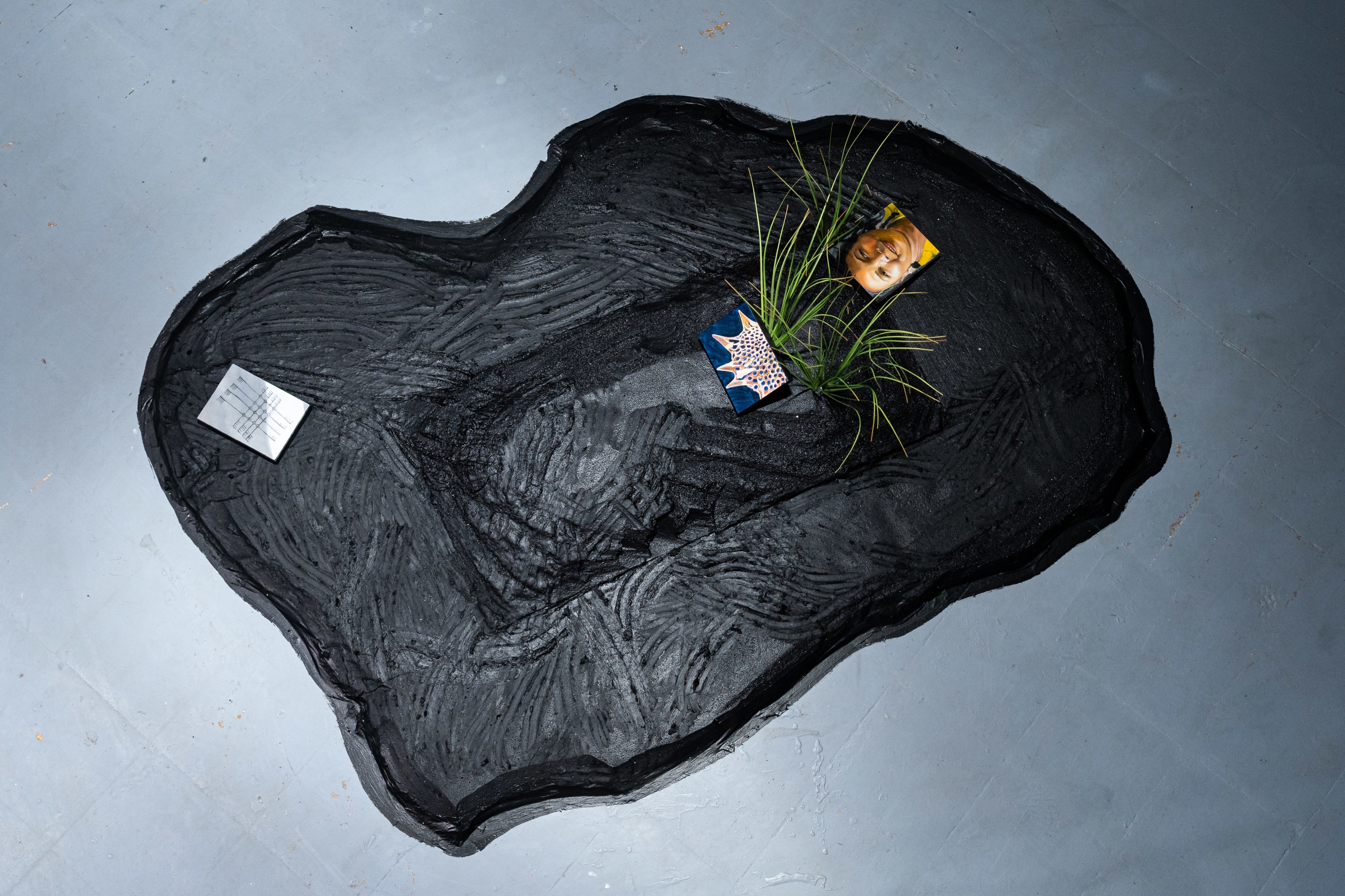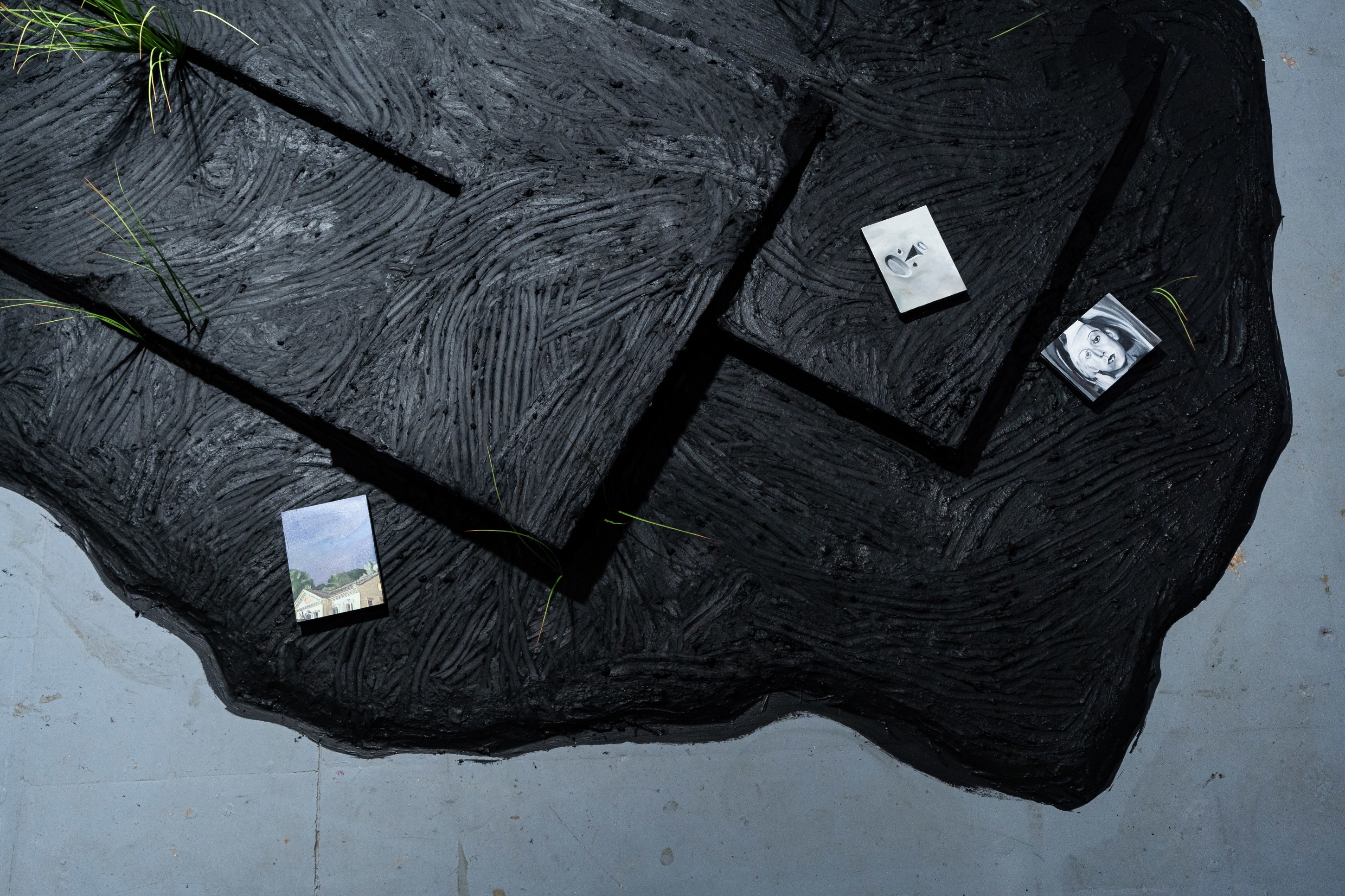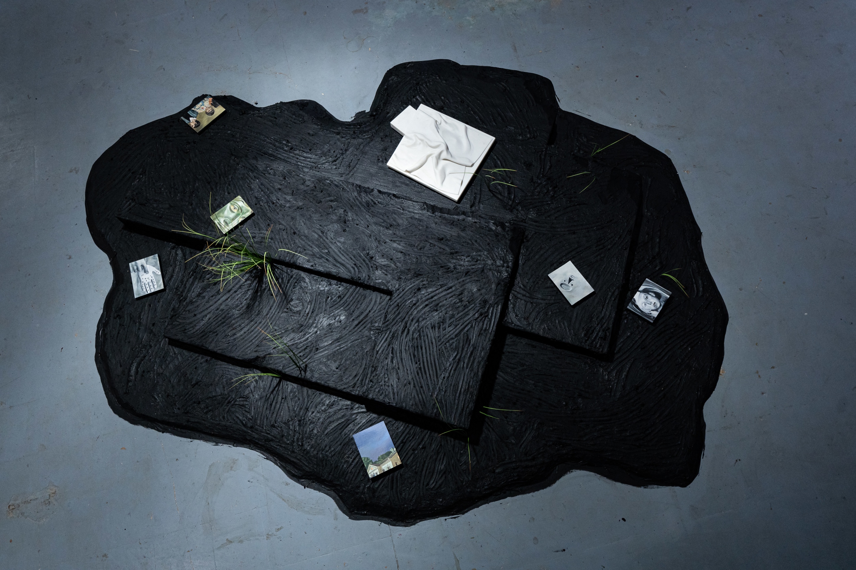 In the centre of the space, as in the centre of the plastic reflection, is the black paste. A boundless puddle, a dark and infinite ocean. It sticks, clings to our flesh, envelops us and overtakes us. We, the terrestrials, the individuals of a transtemporal ecosystem. The black paste is our immensity. It agglomerates the memories, the secrets, the silences that constitute us, in the present, as well as in the past and the future. The black paste is in us, around us, yet, often, it escapes us. It binds us to others, human and non-human. It is the invisible part of the living, what we have forgotten, what we do not want to see, what overflows and troubles us.