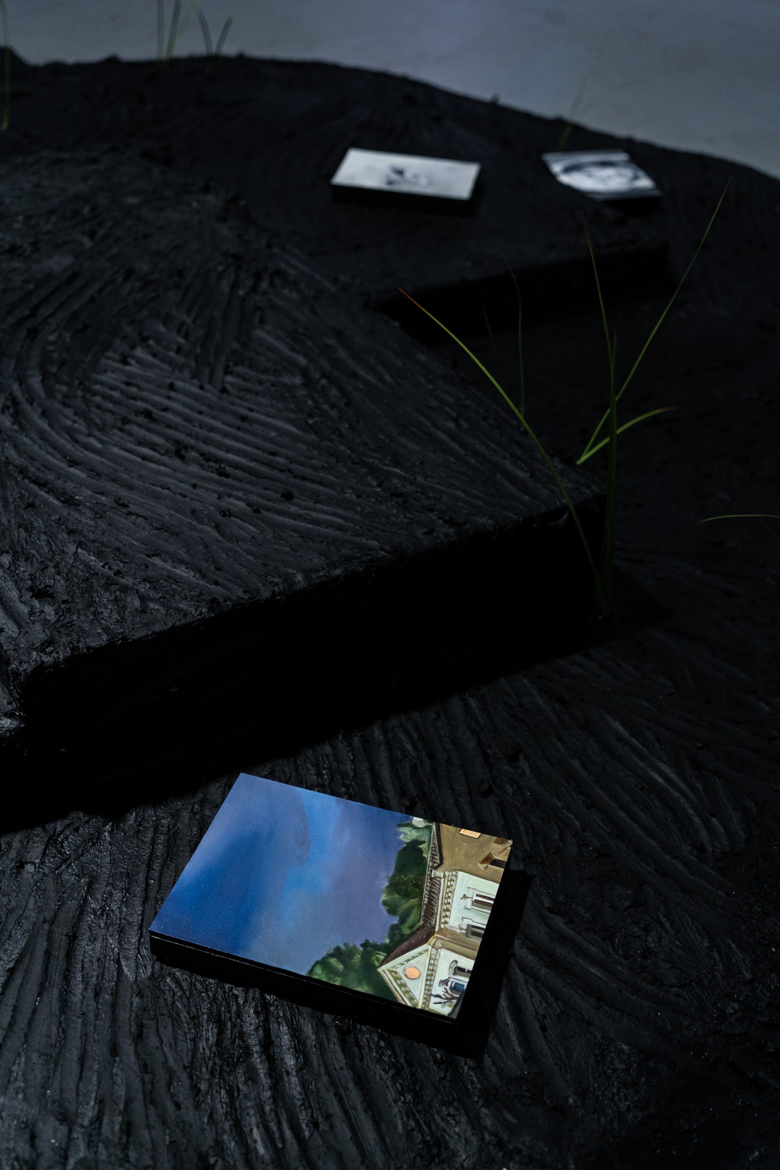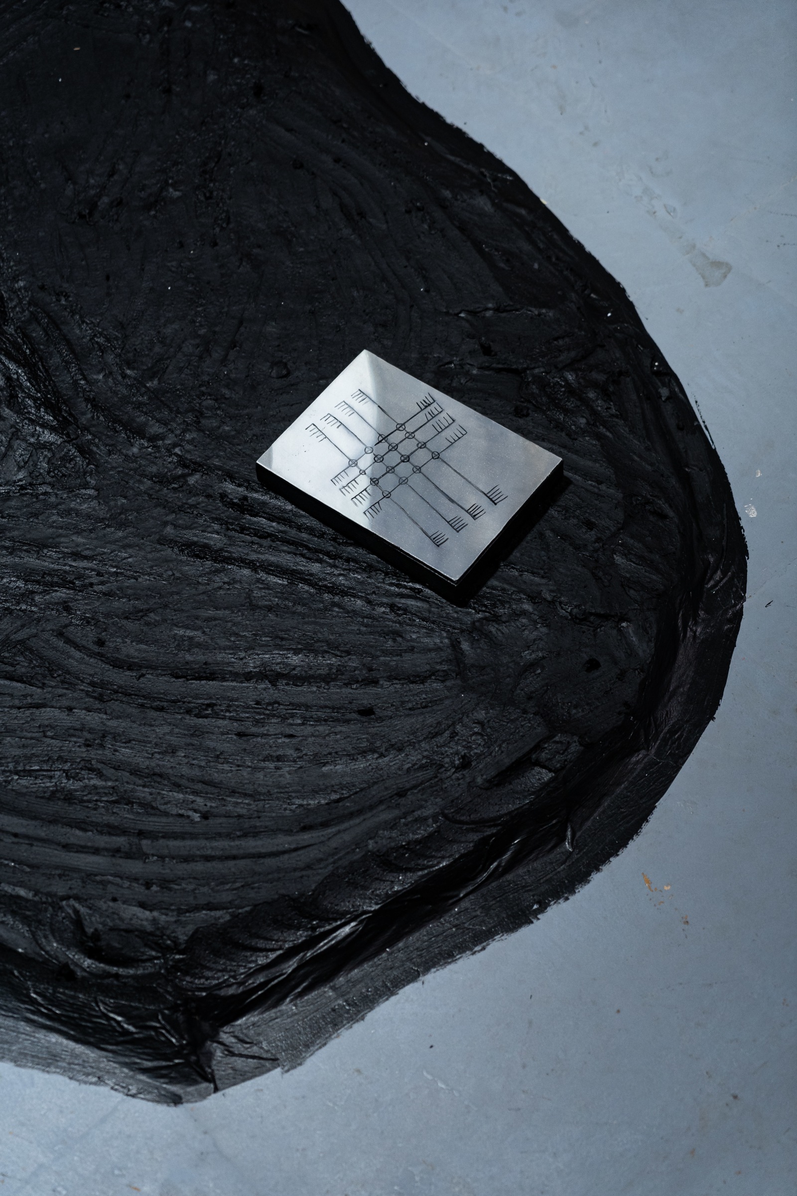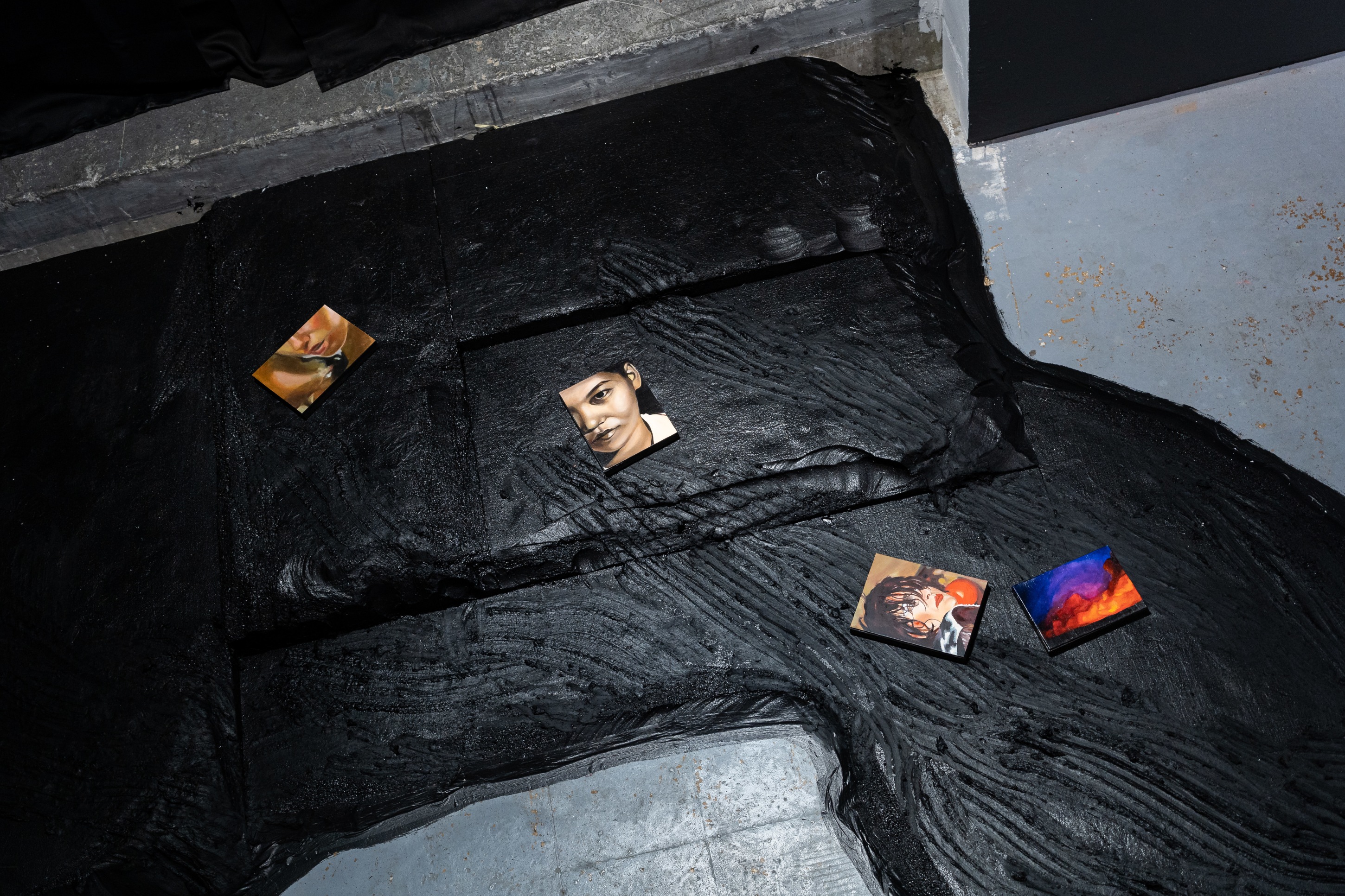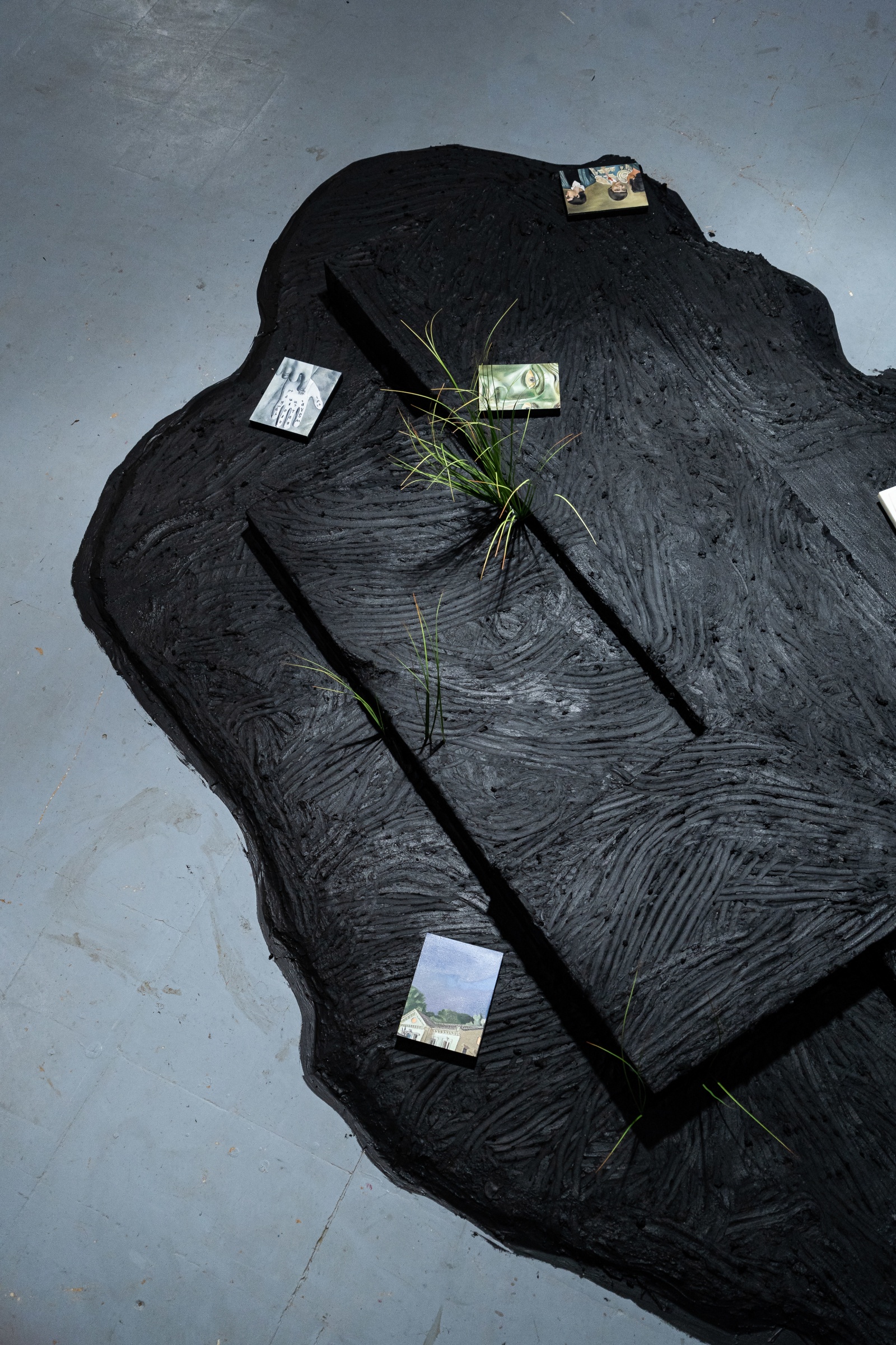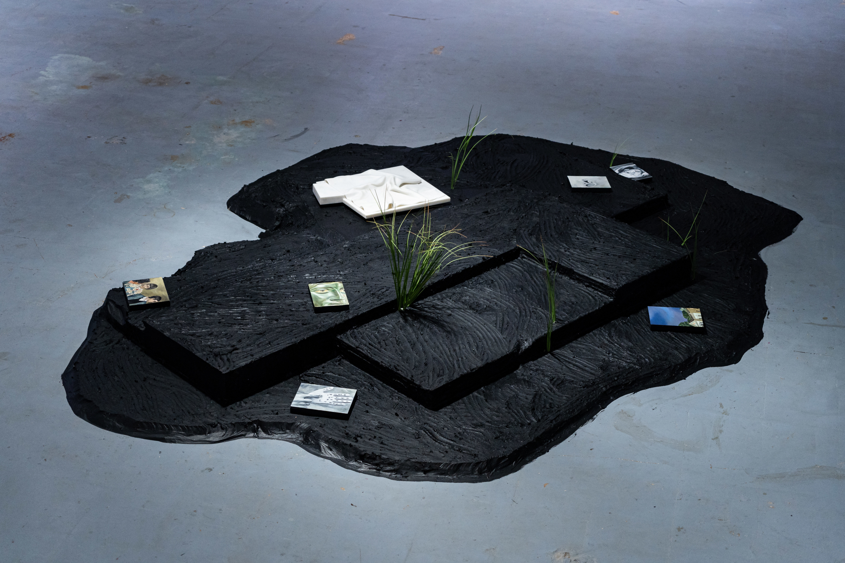 In the centre of the space, as in the centre of the plastic reflection, is the black paste. A boundless puddle, a dark and infinite ocean. It sticks, clings to our flesh, envelops us and overtakes us. We, the terrestrials, the individuals of a transtemporal ecosystem. The black paste is our immensity. It agglomerates the memories, the secrets, the silences that constitute us, in the present, as well as in the past and the future. The black paste is in us, around us, yet, often, it escapes us. It binds us to others, human and non-human. It is the invisible part of the living, what we have forgotten, what we do not want to see, what overflows and troubles us.