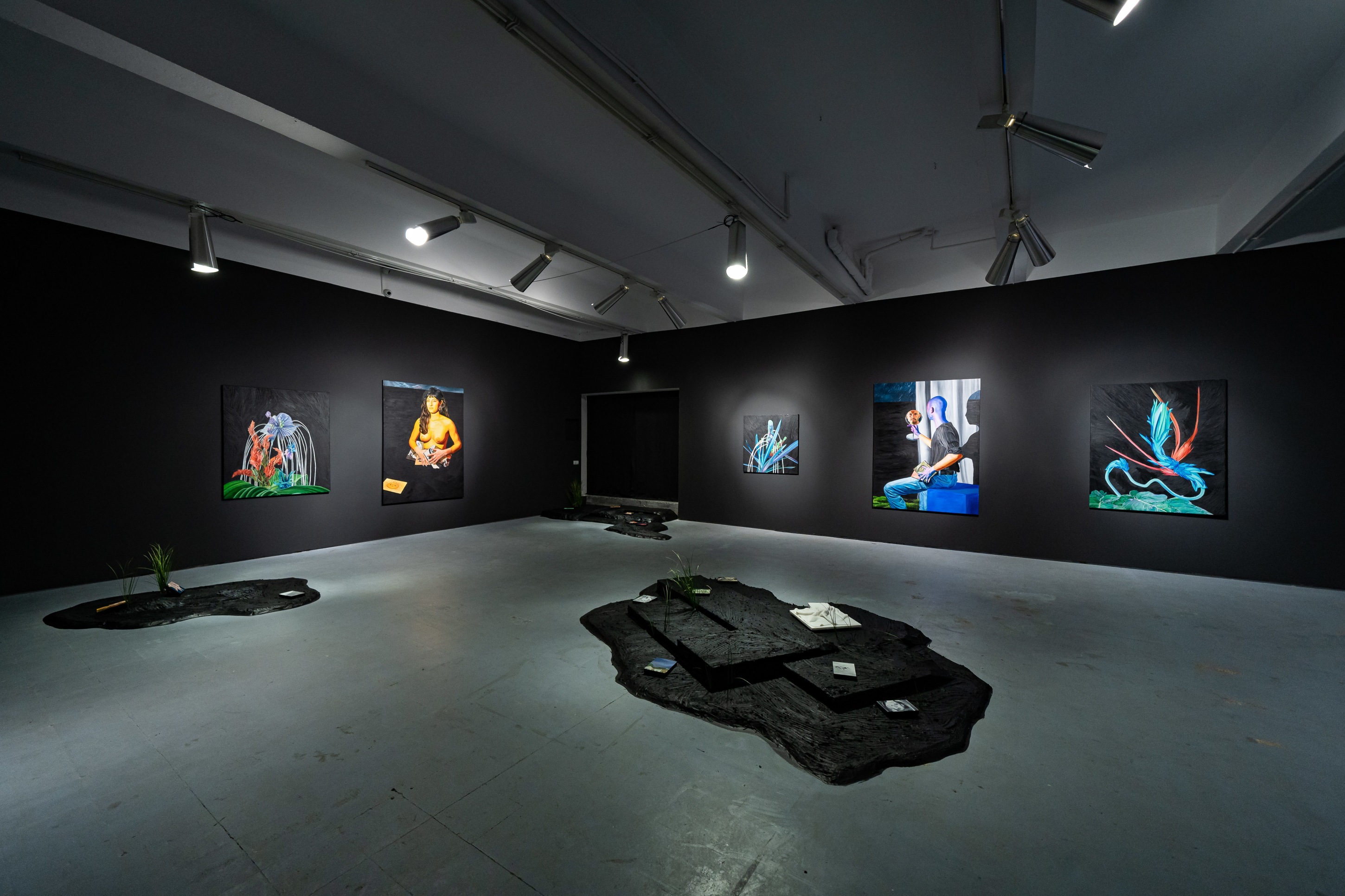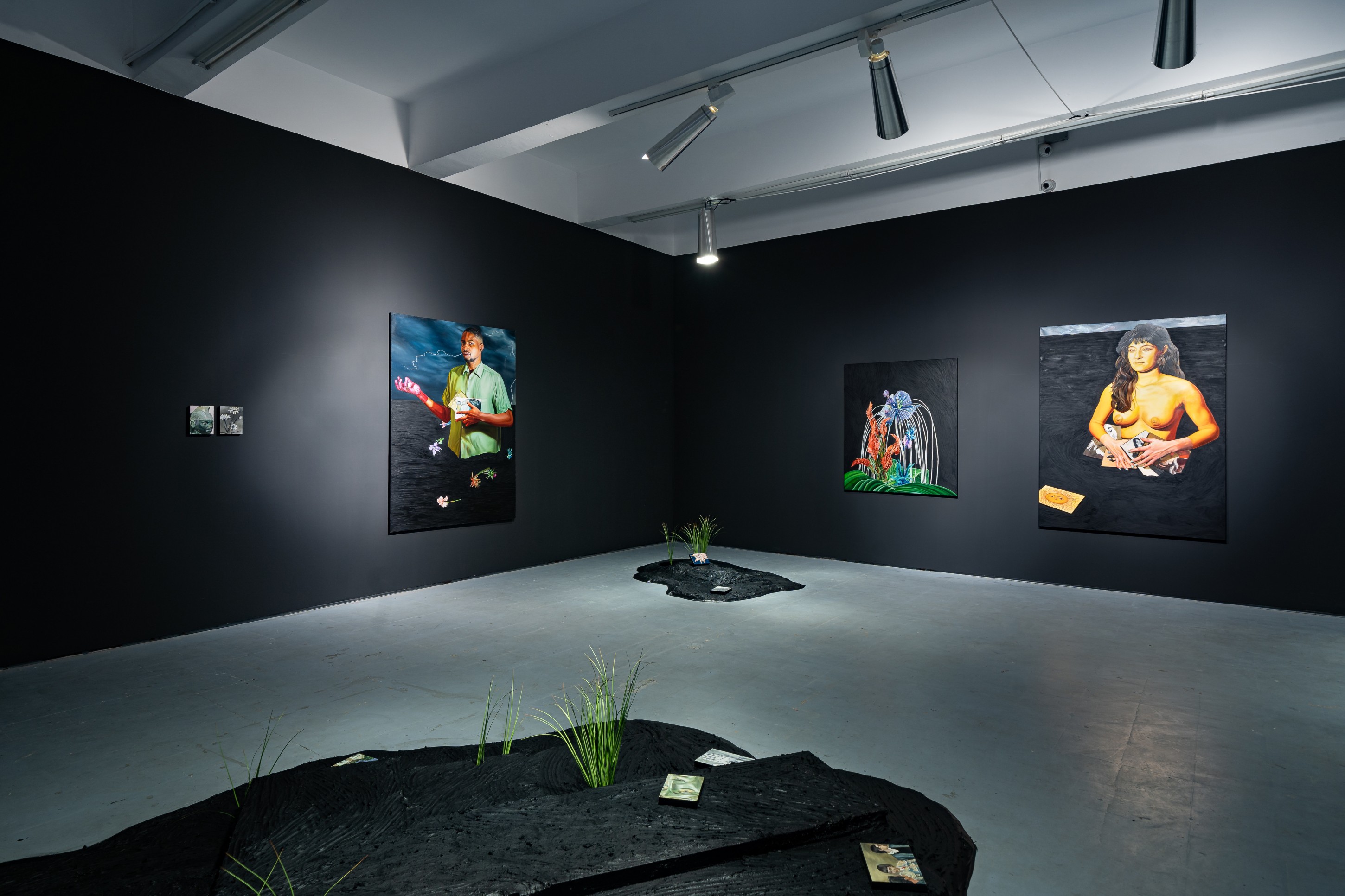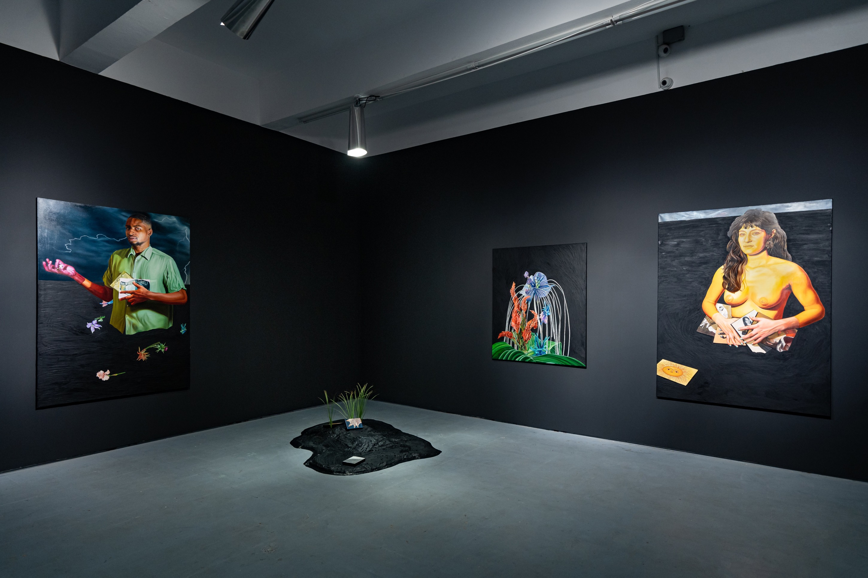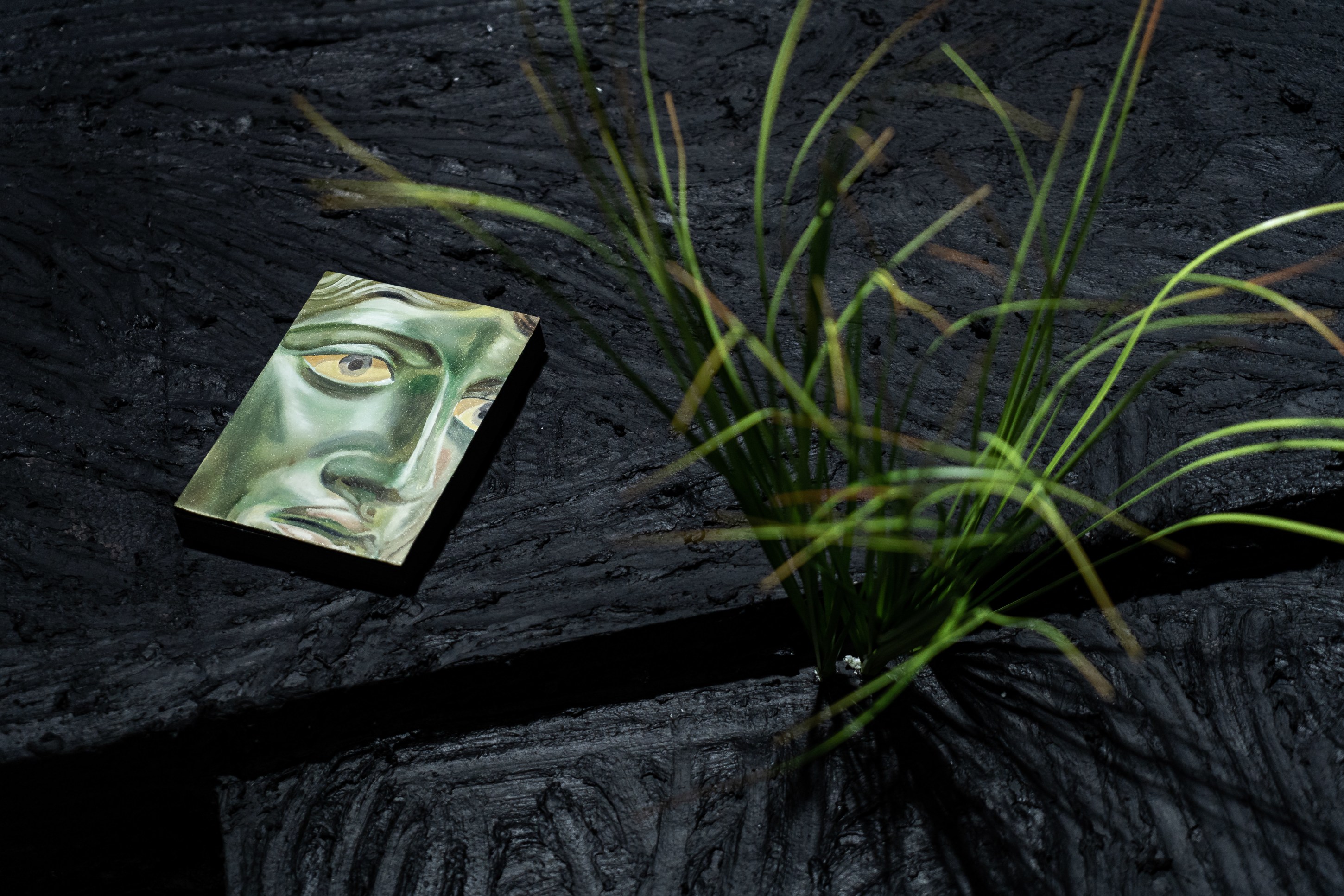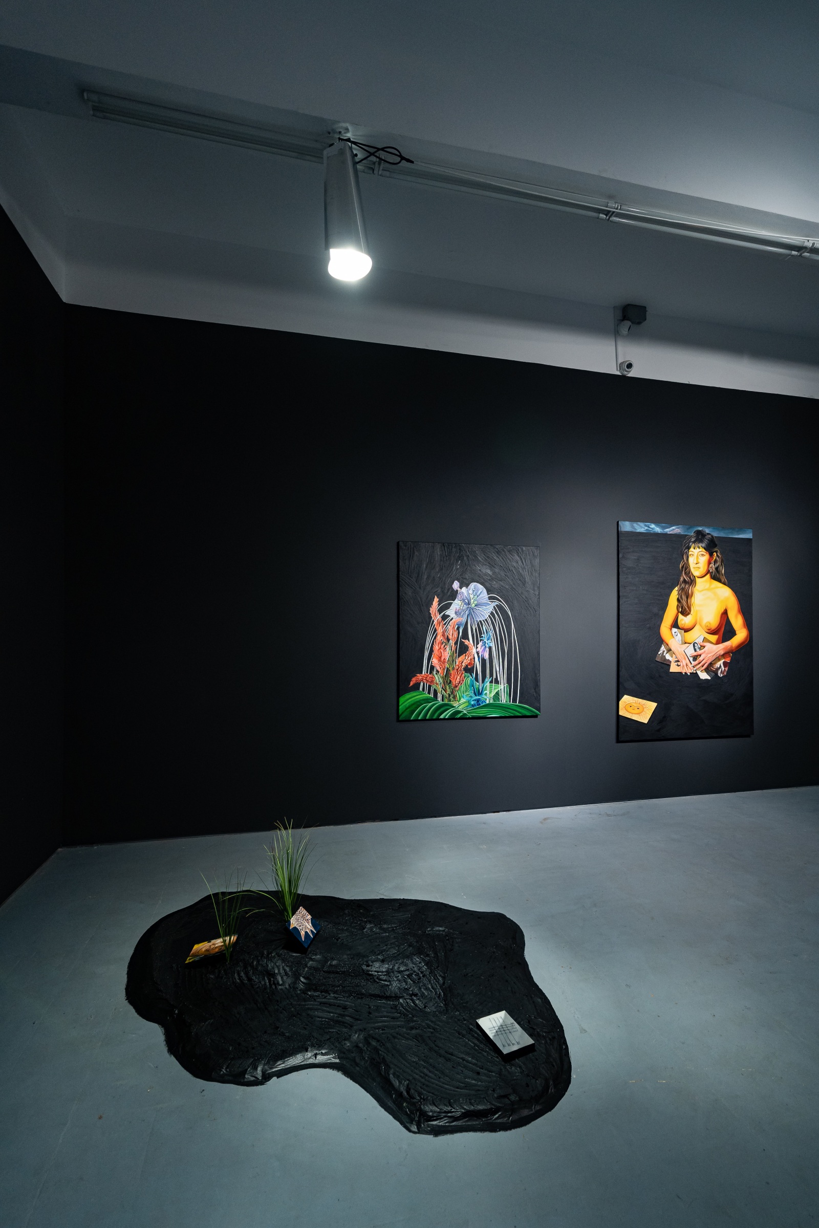 Metaphorically and conceptually, black paste embodies not only what binds Chloë Saï Breil-Dupont to her loved ones and the cyborg plants whose portraits she creates, but also what binds the individuals represented to their own memories, their own experiences, their own existences and interdependencies. The black paste connects everything. ‘It stores the whole, the atoms that constitute the whole. It is the beginning, where we come from and also where we will return. It is the proof, the memento that no matter what we do, I have been you, you have been me and we have been this plant.’¹ Physically, on the canvas as in space, it is the cooked result of a mixture of beeswax, Dammar resin, black pigments obtained by the calcination of materials. The black paste is applied by hand around the figure in the form of plant motifs, water currents or air currents. It is thick and matte. It generates densities. On the canvas, it absorbs light - thus bodies, human and non-human, are their own source of light. The artist explains that black paste is ‘a paint for bats, for beings who see with something other than their eyes’. The black paste tells us that there are a multitude of ways to see, to remember, to feel an image, a light, an object, a body, a texture.