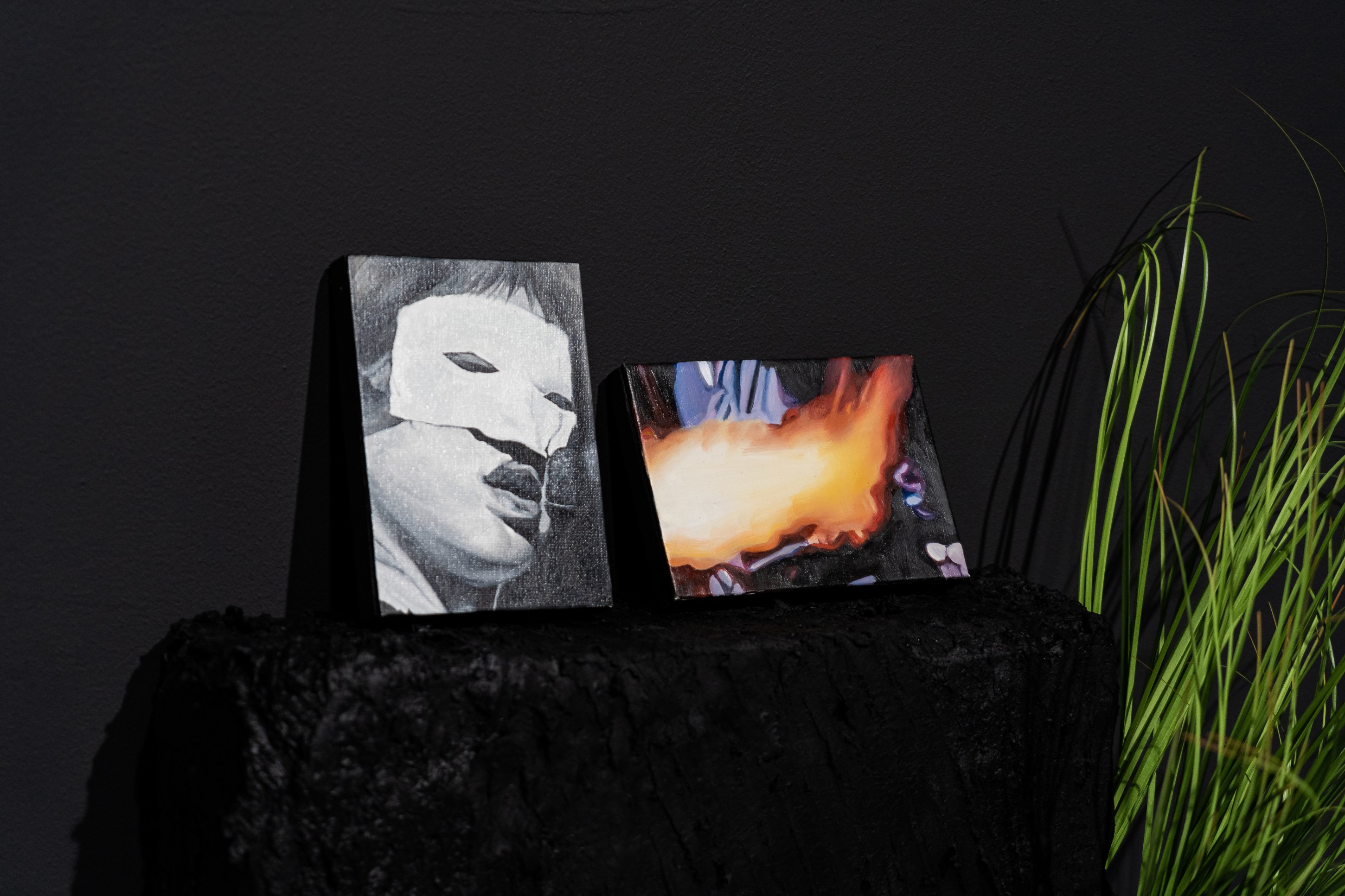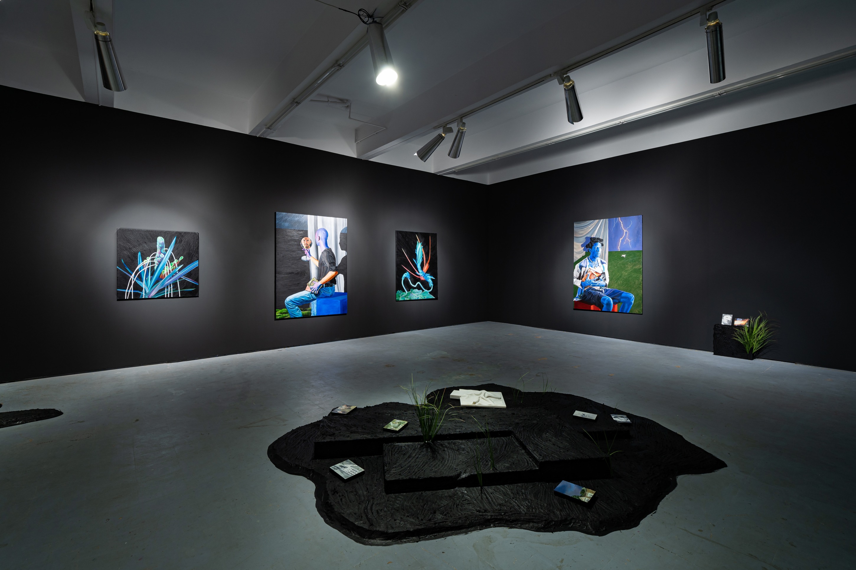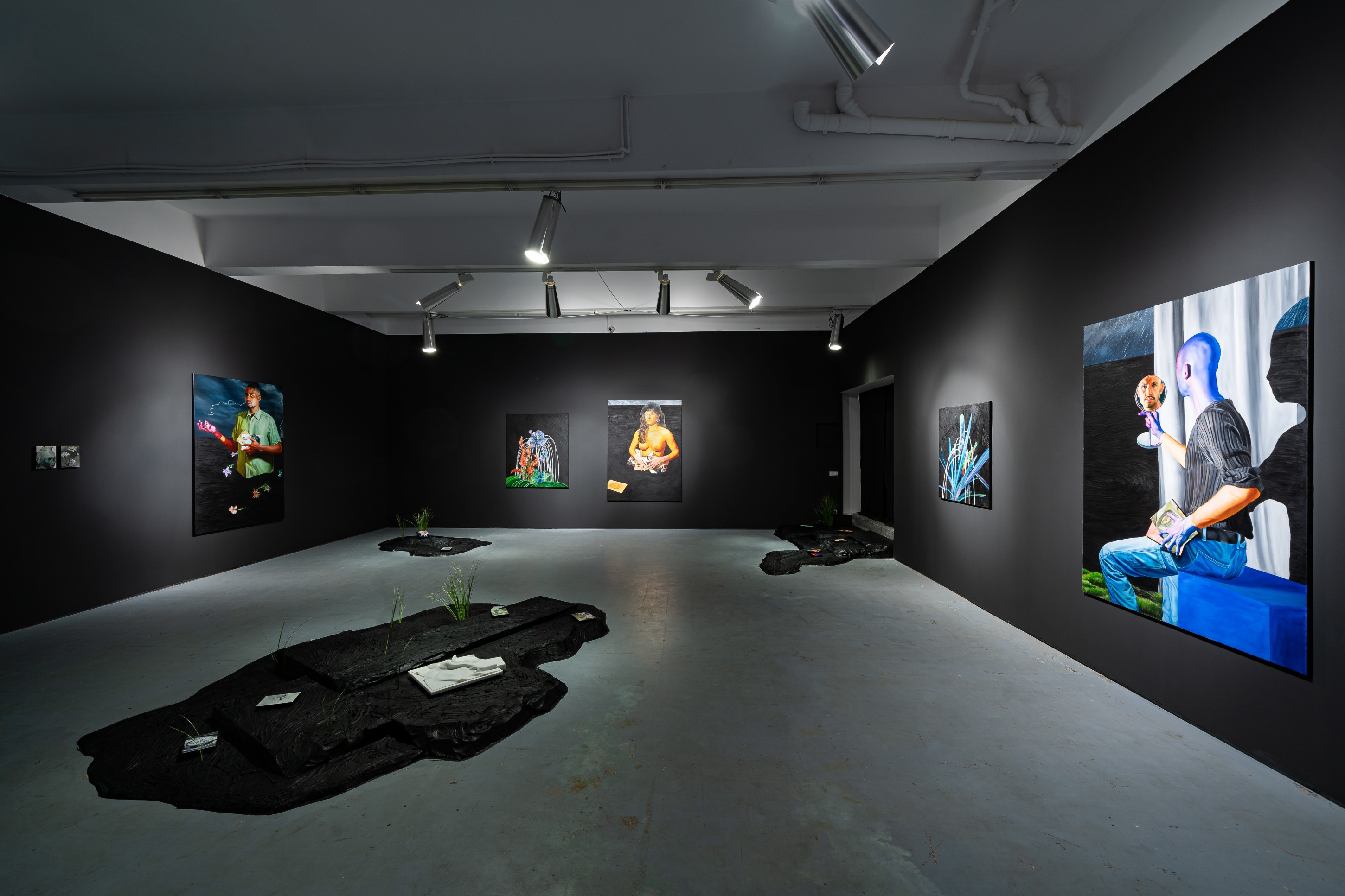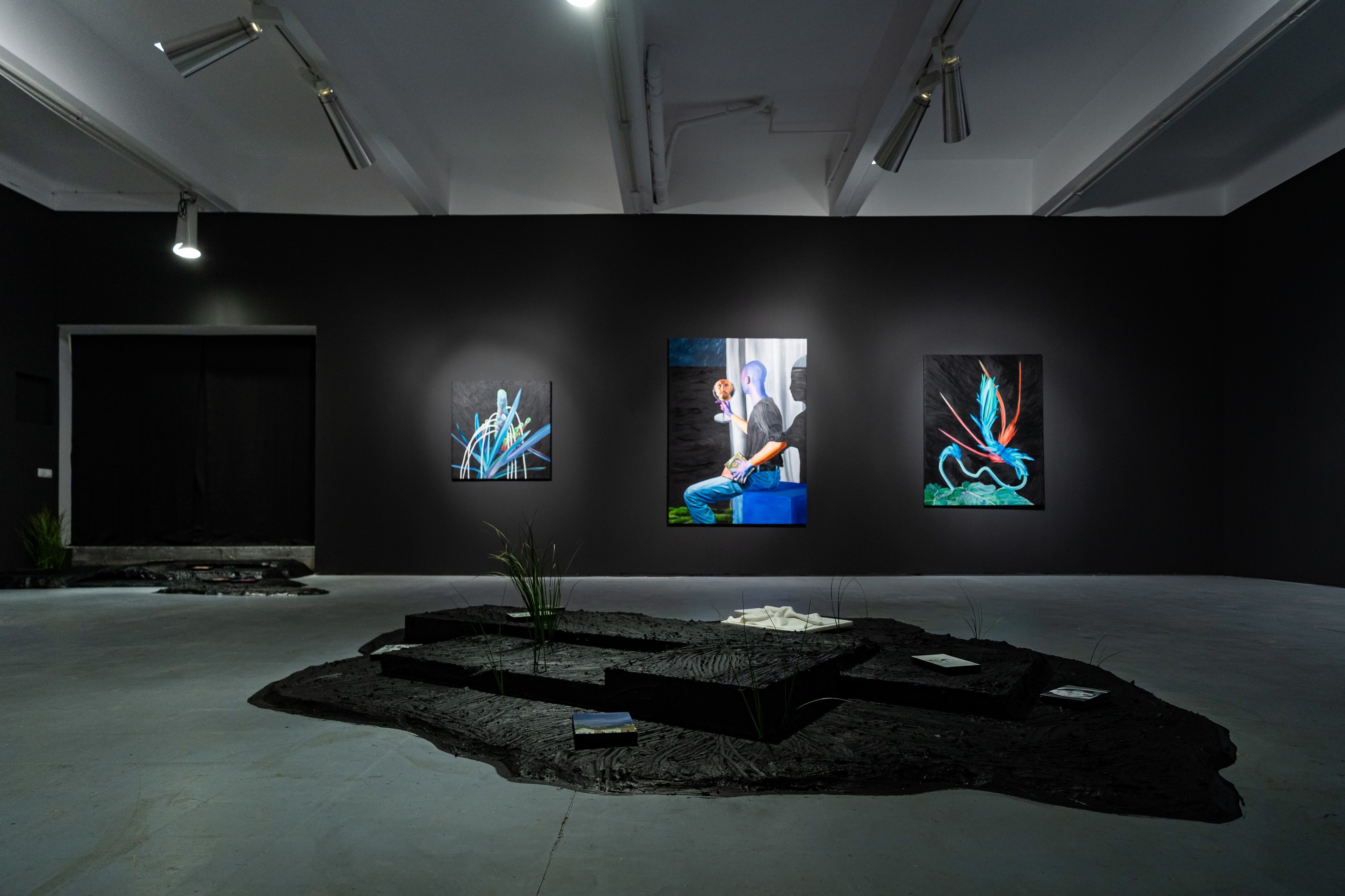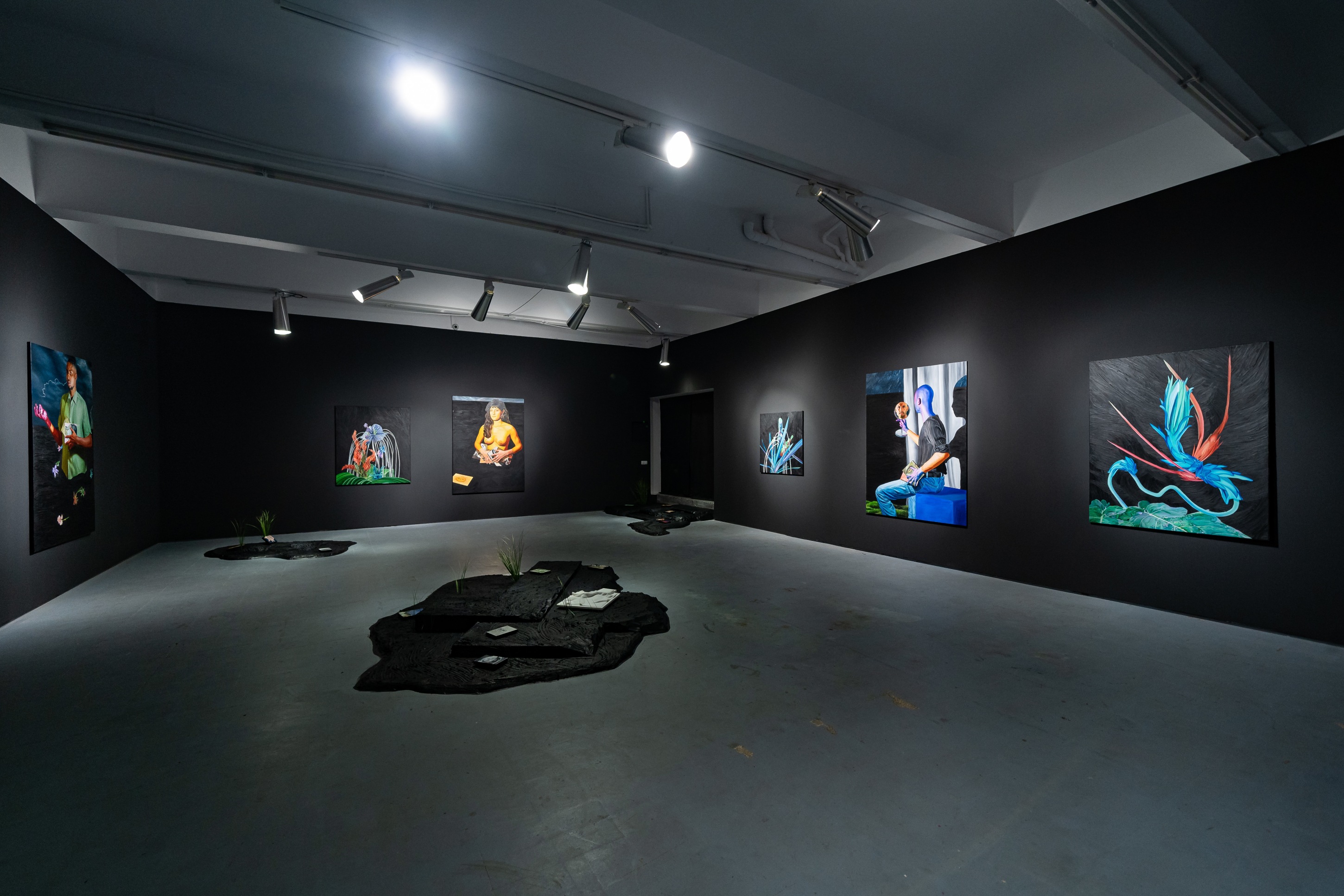 Metaphorically and conceptually, black paste embodies not only what binds Chloë Saï Breil-Dupont to her loved ones and the cyborg plants whose portraits she creates, but also what binds the individuals represented to their own memories, their own experiences, their own existences and interdependencies. The black paste connects everything. ‘It stores the whole, the atoms that constitute the whole. It is the beginning, where we come from and also where we will return. It is the proof, the memento that no matter what we do, I have been you, you have been me and we have been this plant.’¹ Physically, on the canvas as in space, it is the cooked result of a mixture of beeswax, Dammar resin, black pigments obtained by the calcination of materials. The black paste is applied by hand around the figure in the form of plant motifs, water currents or air currents. It is thick and matte. It generates densities. On the canvas, it absorbs light - thus bodies, human and non-human, are their own source of light. The artist explains that black paste is ‘a paint for bats, for beings who see with something other than their eyes’. The black paste tells us that there are a multitude of ways to see, to remember, to feel an image, a light, an object, a body, a texture.
