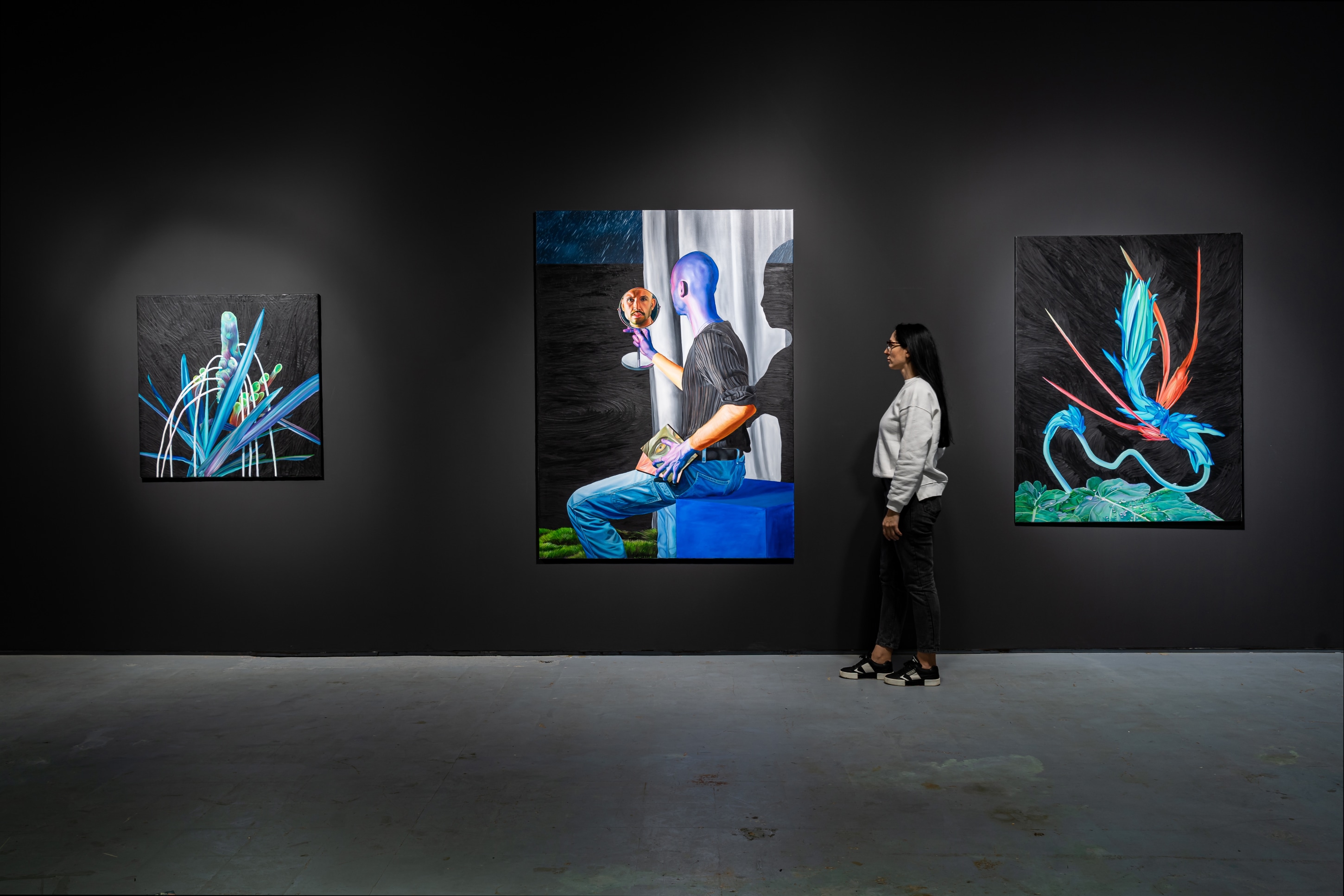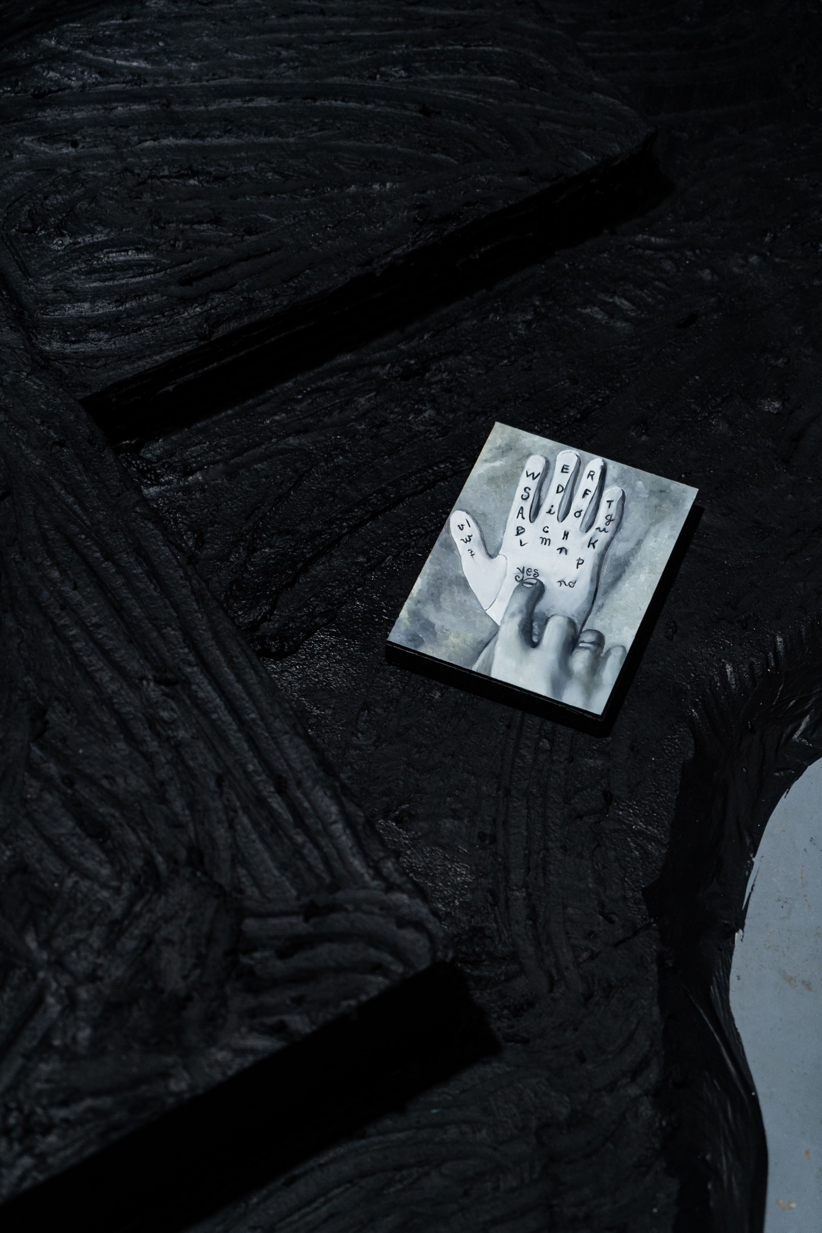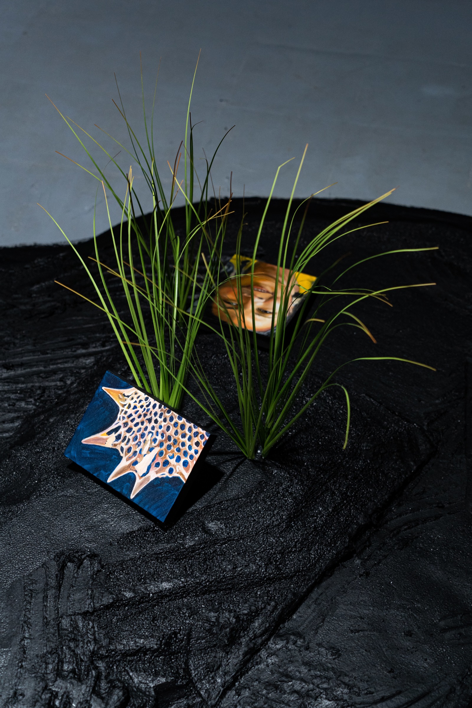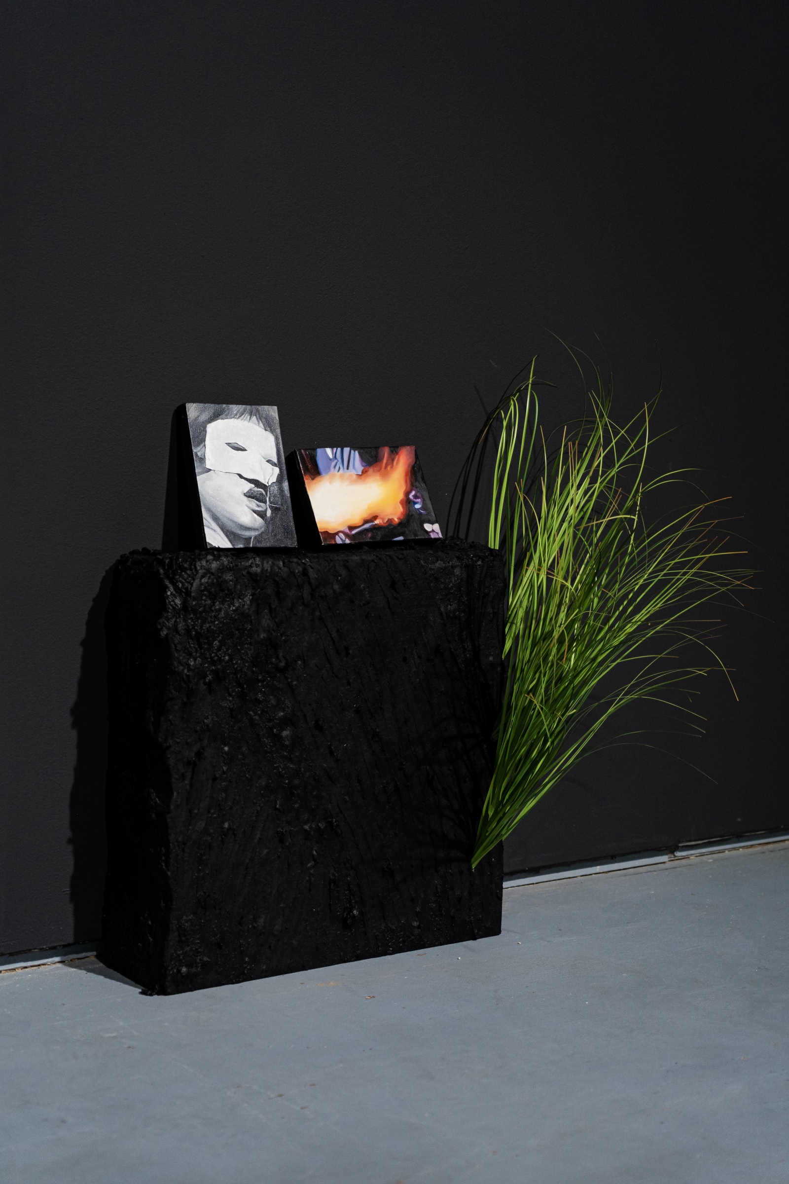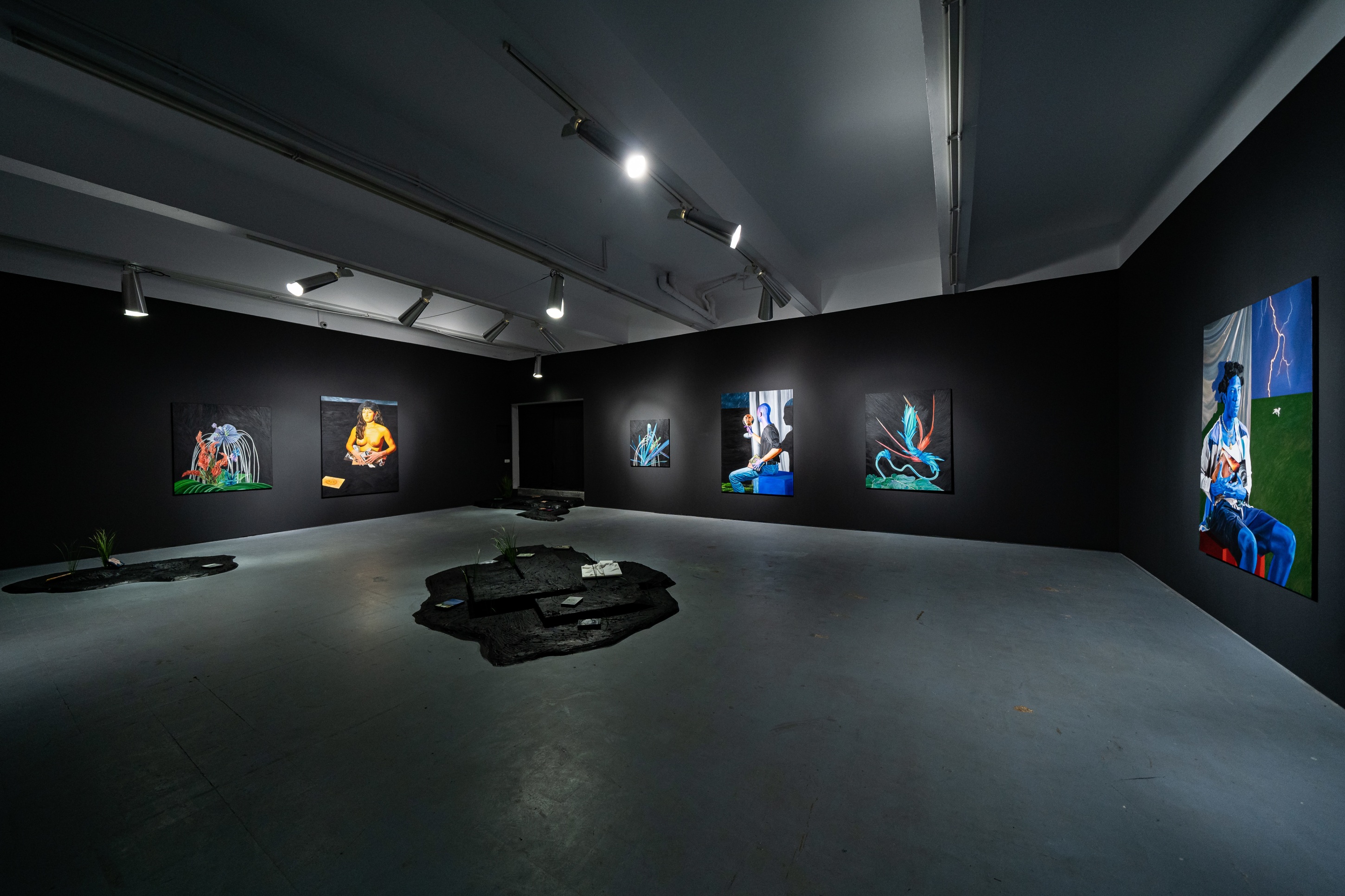 Metaphorically and conceptually, black paste embodies not only what binds Chloë Saï Breil-Dupont to her loved ones and the cyborg plants whose portraits she creates, but also what binds the individuals represented to their own memories, their own experiences, their own existences and interdependencies. The black paste connects everything. ‘It stores the whole, the atoms that constitute the whole. It is the beginning, where we come from and also where we will return. It is the proof, the memento that no matter what we do, I have been you, you have been me and we have been this plant.’¹ Physically, on the canvas as in space, it is the cooked result of a mixture of beeswax, Dammar resin, black pigments obtained by the calcination of materials. The black paste is applied by hand around the figure in the form of plant motifs, water currents or air currents. It is thick and matte. It generates densities. On the canvas, it absorbs light - thus bodies, human and non-human, are their own source of light. The artist explains that black paste is ‘a paint for bats, for beings who see with something other than their eyes’. The black paste tells us that there are a multitude of ways to see, to remember, to feel an image, a light, an object, a body, a texture.