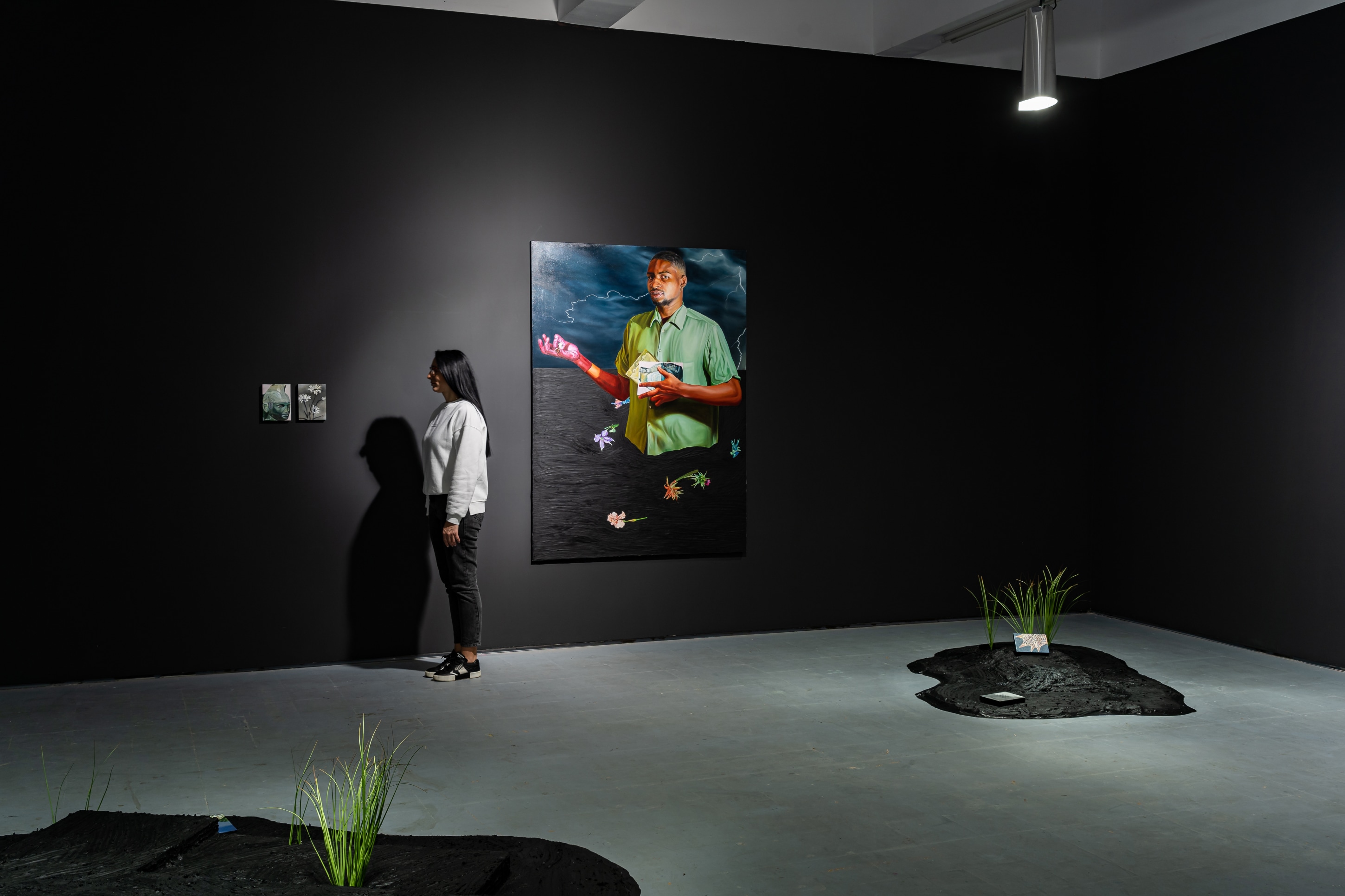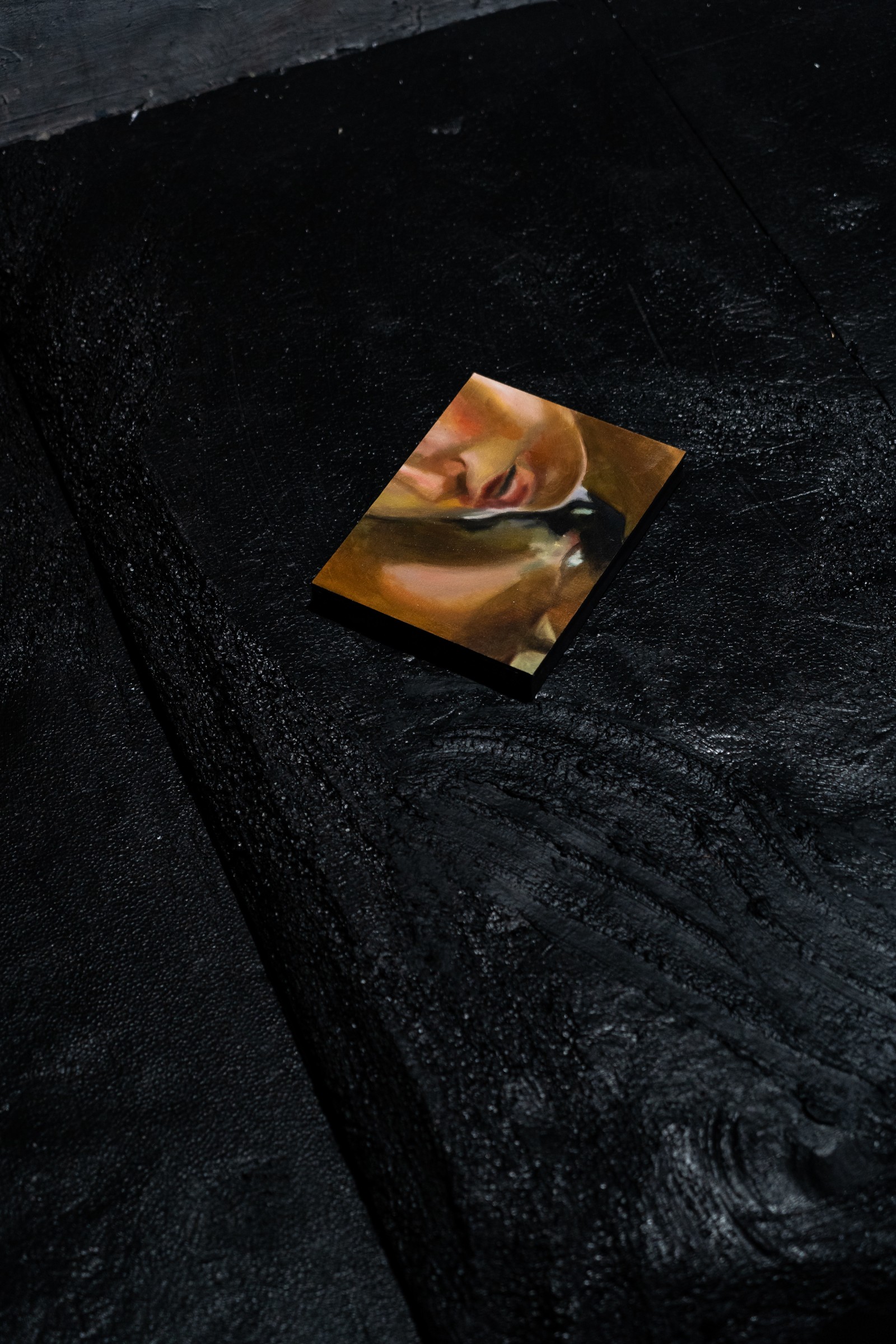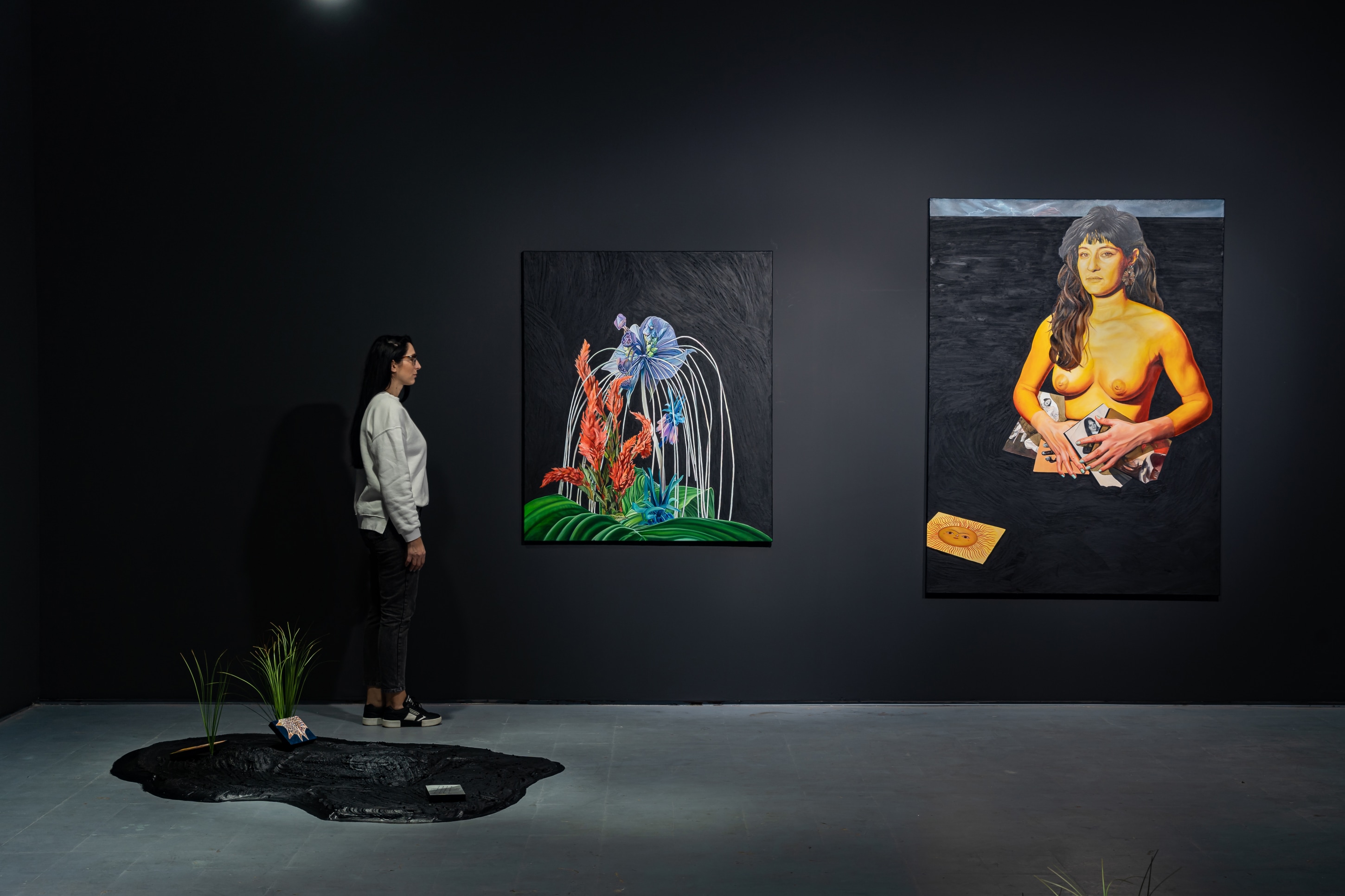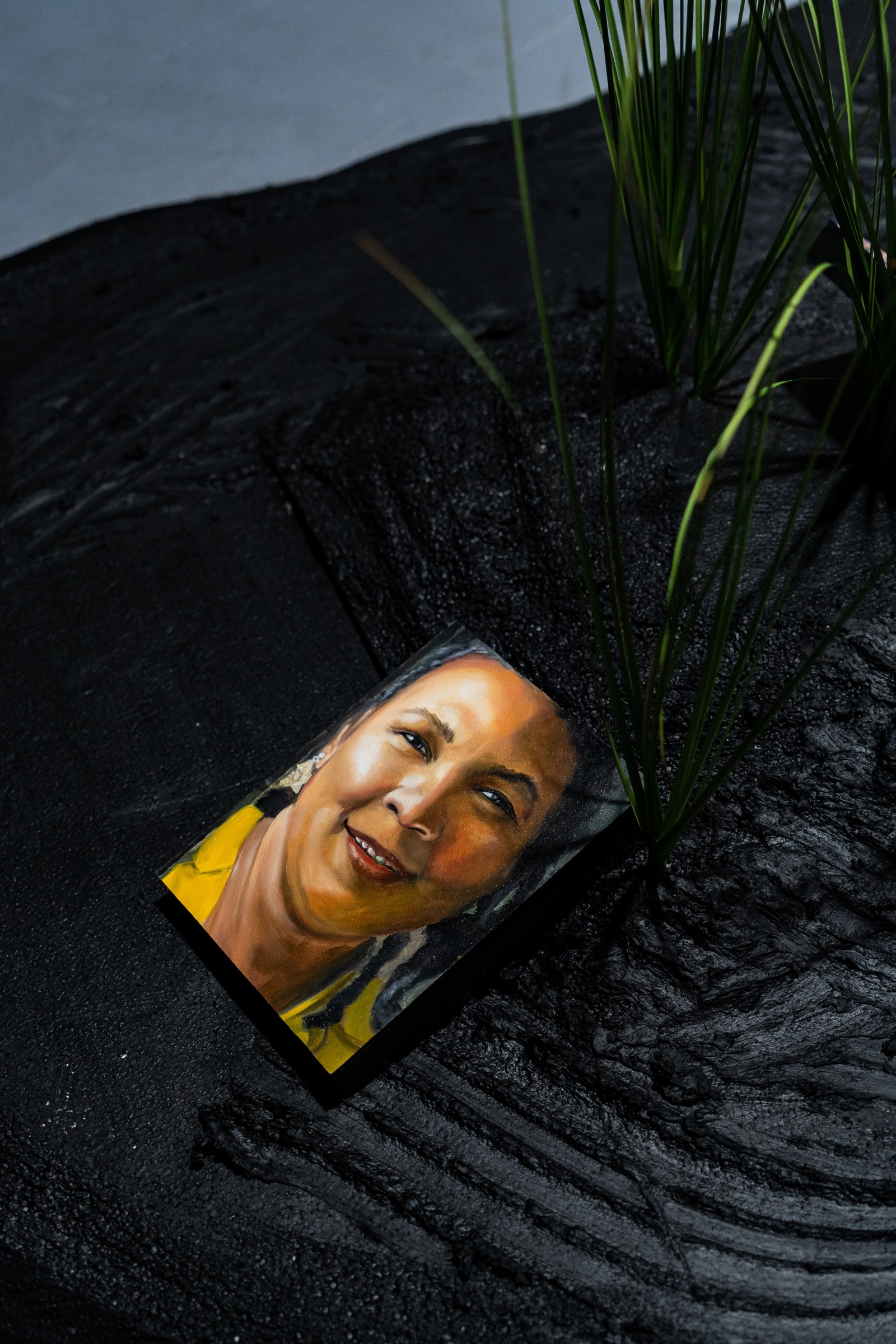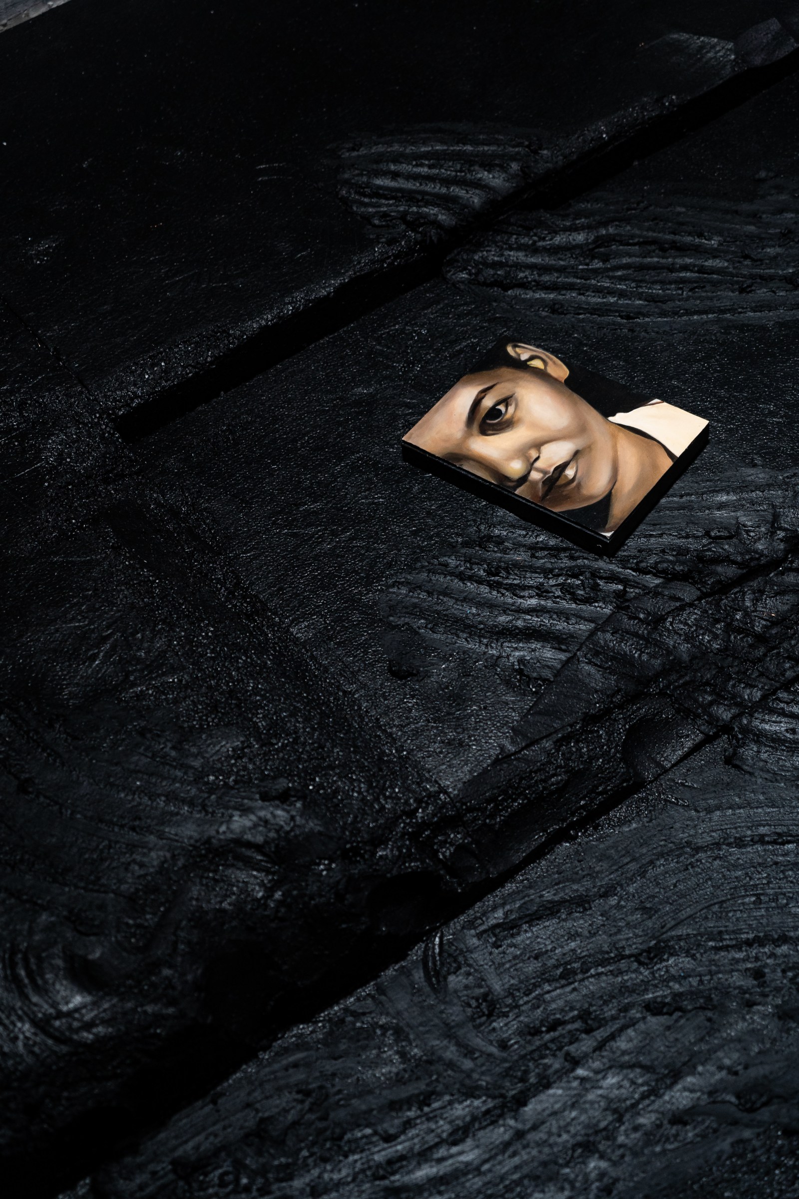 It is the compost by which it becomes possible for us to dream the obscure, to think beneath flesh, beneath surfaces and appearances. ‘What we believe shapes the world.’ In the exhibition space as in the painting surface, the artist sculpts the black paste with her fingers to form swampy areas, riptides, torrents, paths or even mounds. She looks for what is buried, everything that is difficult for us to say or to show. The mounds, hillocks of black paste, conceal what has been buried. Graves, buried cities, swallowed up by the earth and by time. On the canvas, Chloë Saï Breil-Dupont buries elements beneath black paste. Like tightly-closed chests, the paintings contain an obscure part, an invisible part. Starhawk, a Californian witchand ecofeminist activist, speaks of the inner power: ‘Yes, the inner power is the power of the low, the dark, the earth; the power that comes from our blood, our lives, and our passionate desire for the living body of the other.’² Chloë Saï Breil-Dupont manifests through painting this ‘passionate desire for the living body of the other’. A desire freed from binary and alienating thoughts. A desire generated by a vital impulse that leads her to a deep encounter with the other, that guides her as much towards darkness, rich in dissimulations and troubles, as towards a light, a colour, a ‘meta-surreal’ interior of the individuals whose lives she explores. So perhaps the artist manages to manifest some of the inner power of those she chooses to represent. She also speaks of the ‘fire from within’. The portraits challenge certitudes, fixities and rigidities in order, on the contrary, to present individuals in becoming, beings in movement who evolve within an ecosystem, which also occurs over a long period of time, invariably mutating and becoming an ancestral metamorphosis of the living. ‘And, little by little, extend a map. Make the rest disappear. Not to pronounce any more in order to forget. Then pronounce only what is sure and move forward by feeling with the throat to pronounce a little more.'