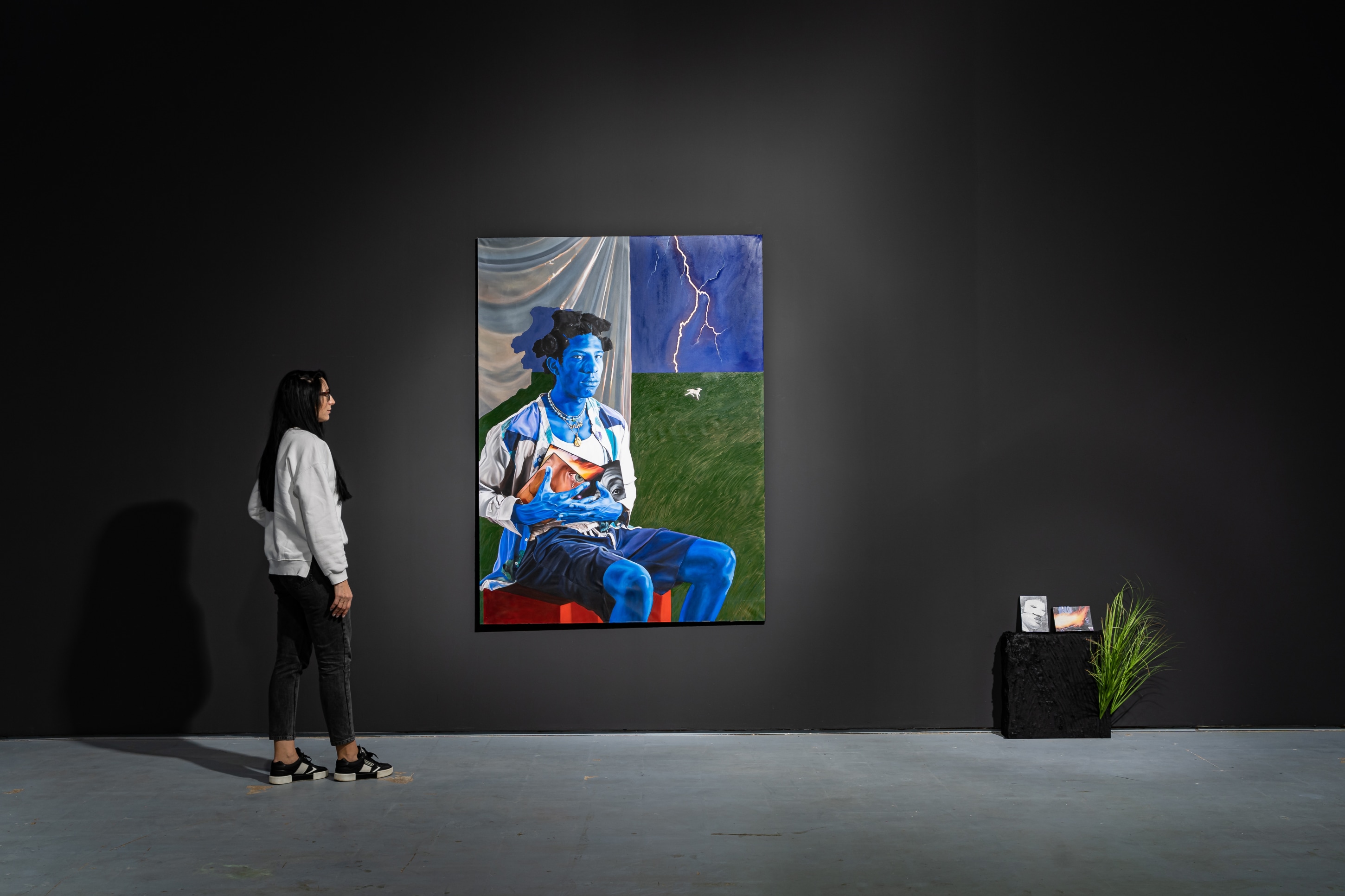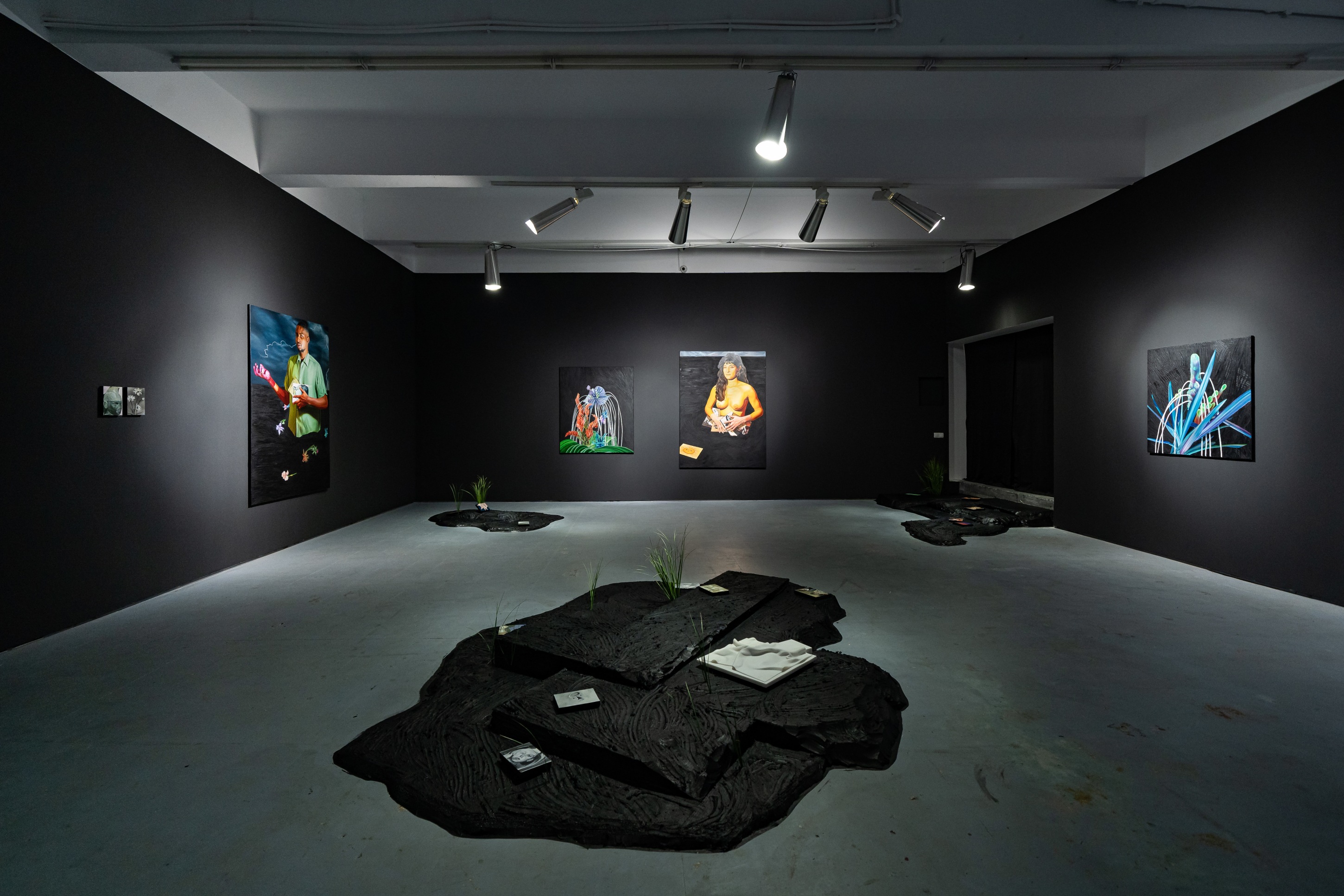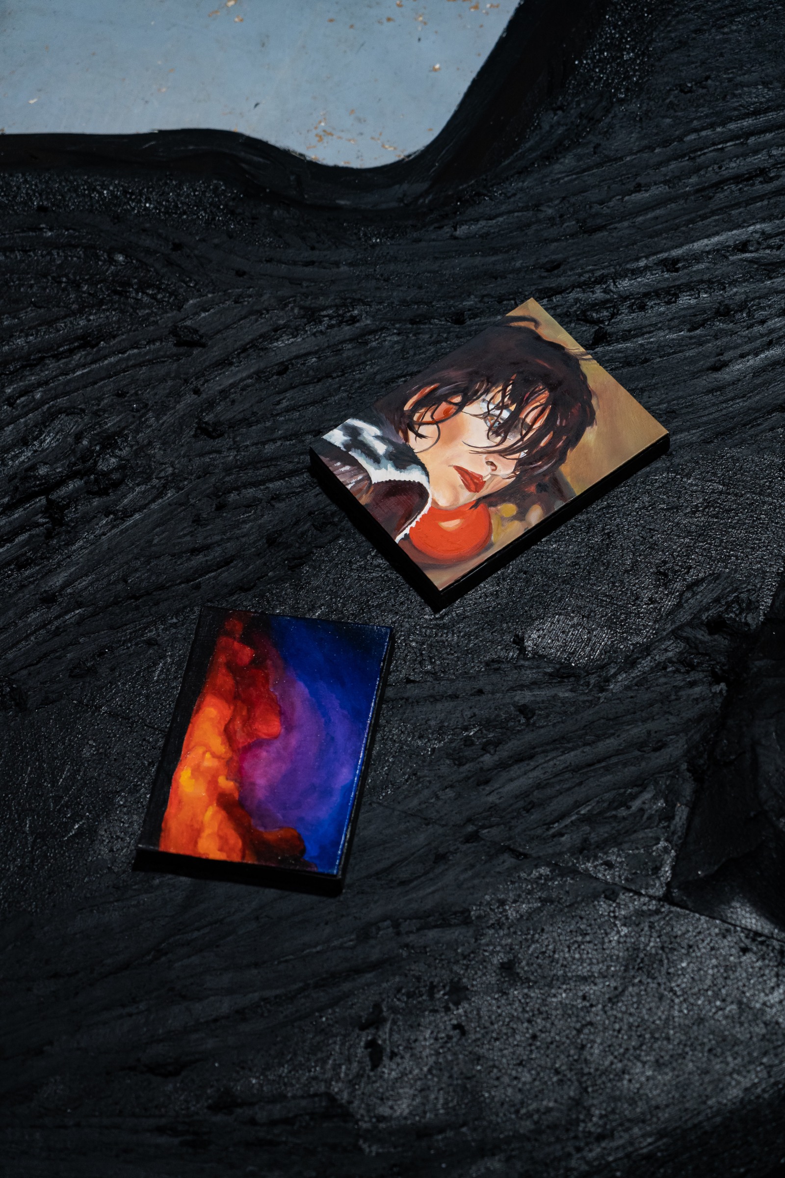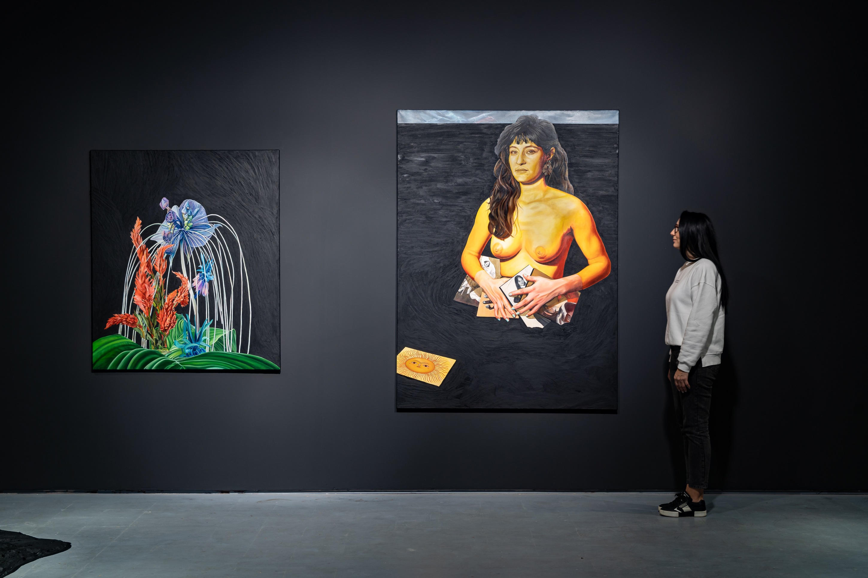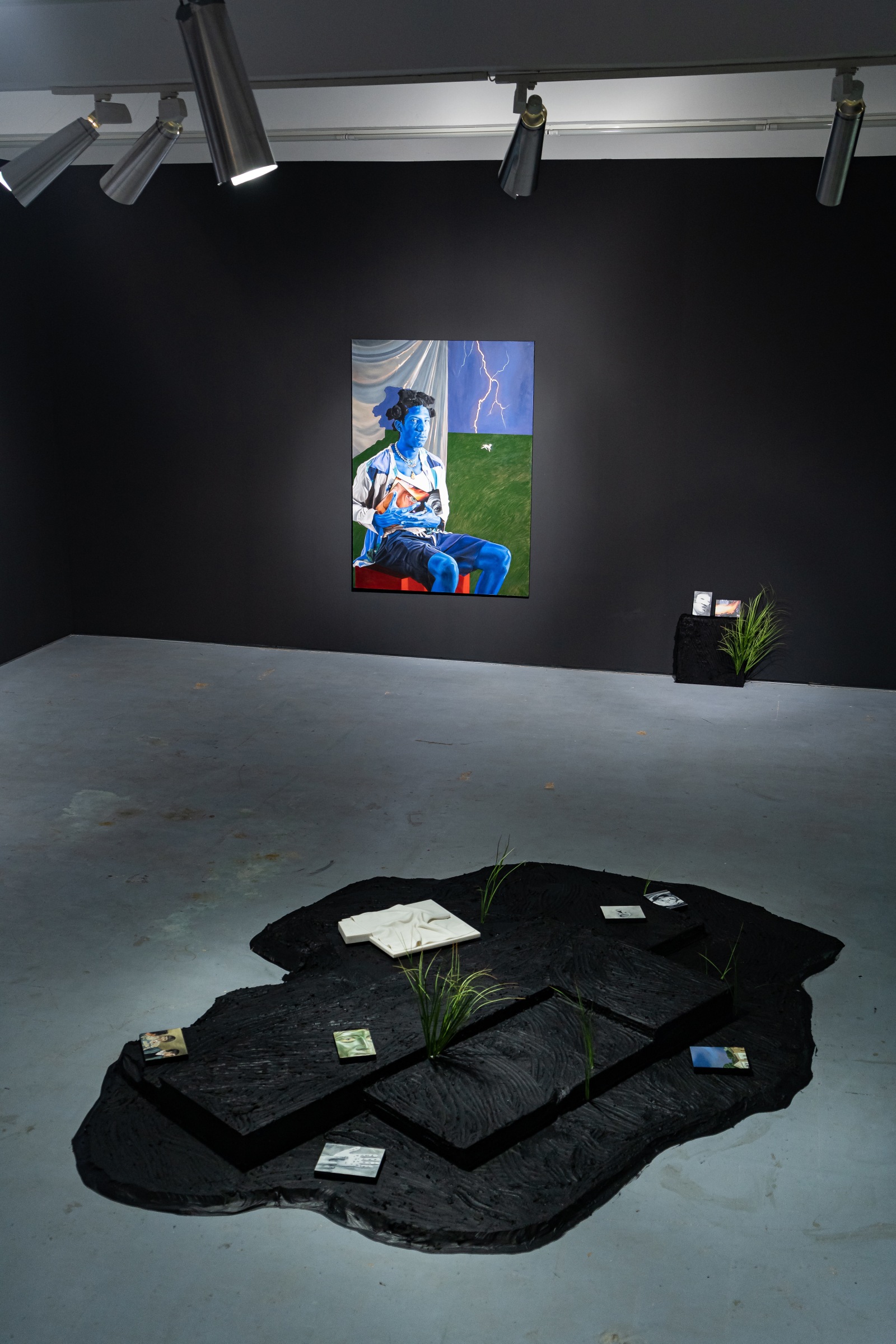 It is the compost by which it becomes possible for us to dream the obscure, to think beneath flesh, beneath surfaces and appearances. ‘What we believe shapes the world.’ In the exhibition space as in the painting surface, the artist sculpts the black paste with her fingers to form swampy areas, riptides, torrents, paths or even mounds. She looks for what is buried, everything that is difficult for us to say or to show. The mounds, hillocks of black paste, conceal what has been buried. Graves, buried cities, swallowed up by the earth and by time. On the canvas, Chloë Saï Breil-Dupont buries elements beneath black paste. Like tightly-closed chests, the paintings contain an obscure part, an invisible part. Starhawk, a Californian witchand ecofeminist activist, speaks of the inner power: ‘Yes, the inner power is the power of the low, the dark, the earth; the power that comes from our blood, our lives, and our passionate desire for the living body of the other.’² Chloë Saï Breil-Dupont manifests through painting this ‘passionate desire for the living body of the other’. A desire freed from binary and alienating thoughts. A desire generated by a vital impulse that leads her to a deep encounter with the other, that guides her as much towards darkness, rich in dissimulations and troubles, as towards a light, a colour, a ‘meta-surreal’ interior of the individuals whose lives she explores. So perhaps the artist manages to manifest some of the inner power of those she chooses to represent. She also speaks of the ‘fire from within’. The portraits challenge certitudes, fixities and rigidities in order, on the contrary, to present individuals in becoming, beings in movement who evolve within an ecosystem, which also occurs over a long period of time, invariably mutating and becoming an ancestral metamorphosis of the living. ‘And, little by little, extend a map. Make the rest disappear. Not to pronounce any more in order to forget. Then pronounce only what is sure and move forward by feeling with the throat to pronounce a little more.'