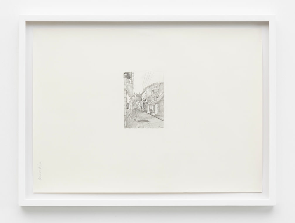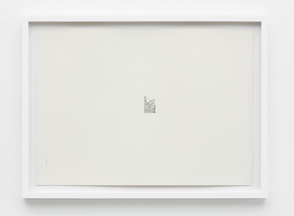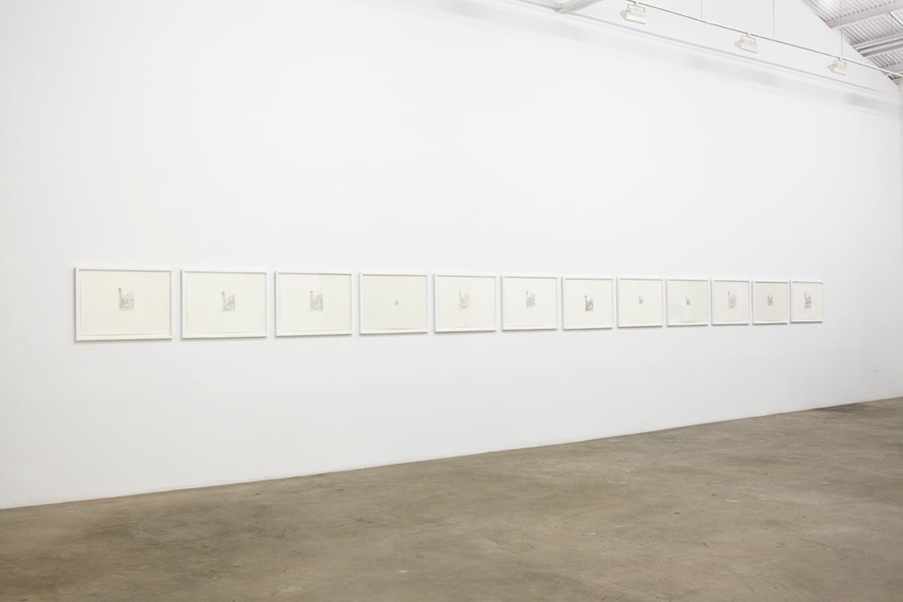 For his new exhibition, Muresan has created a series of drawings in two parts. First is a set of twelve drawings taken specifically from press the artist received upon the debut of his photograph, ‘Leap Into The Void (Three Seconds Later)” (2004). The work was direct reference to Yves Klein’s seminal photograph ‘Leap Into the Void’ (1960), picturing the artist mid-flight, swan-diving into a cobble-stoned Parisian street. Muresan’s image re-stages the photograph, post-flight: the artist is face down in a similar looking Romanian street, seemingly a corpse. Muresan’s re-interpretation of the work is an allusion to the freedom and scope of Klein’s artistic environs transposed against the infinitesimal breadth of his own in Romania.