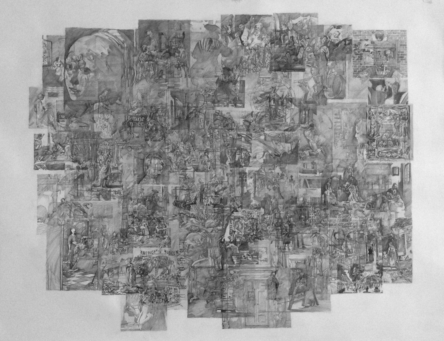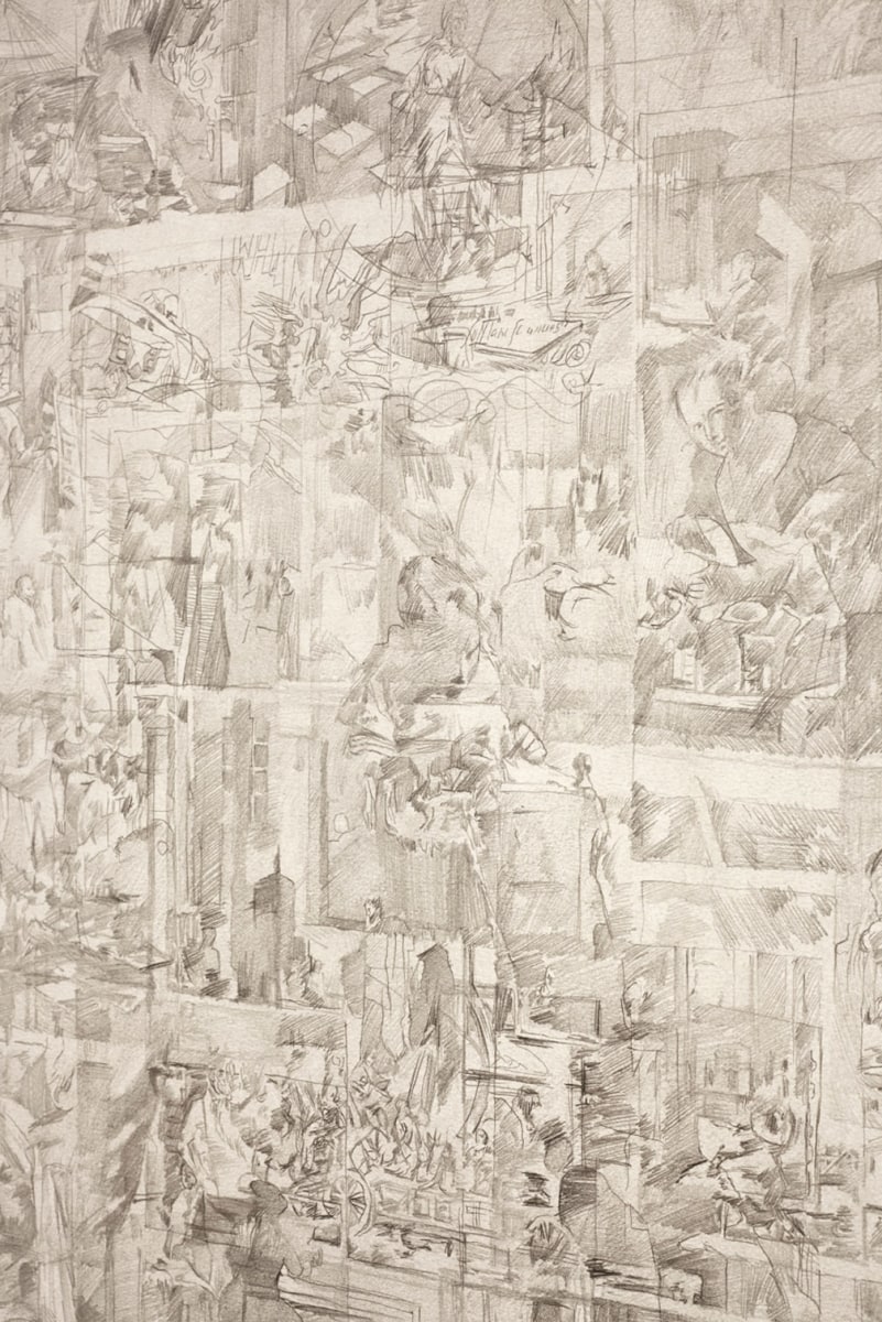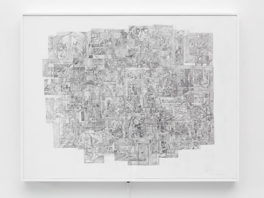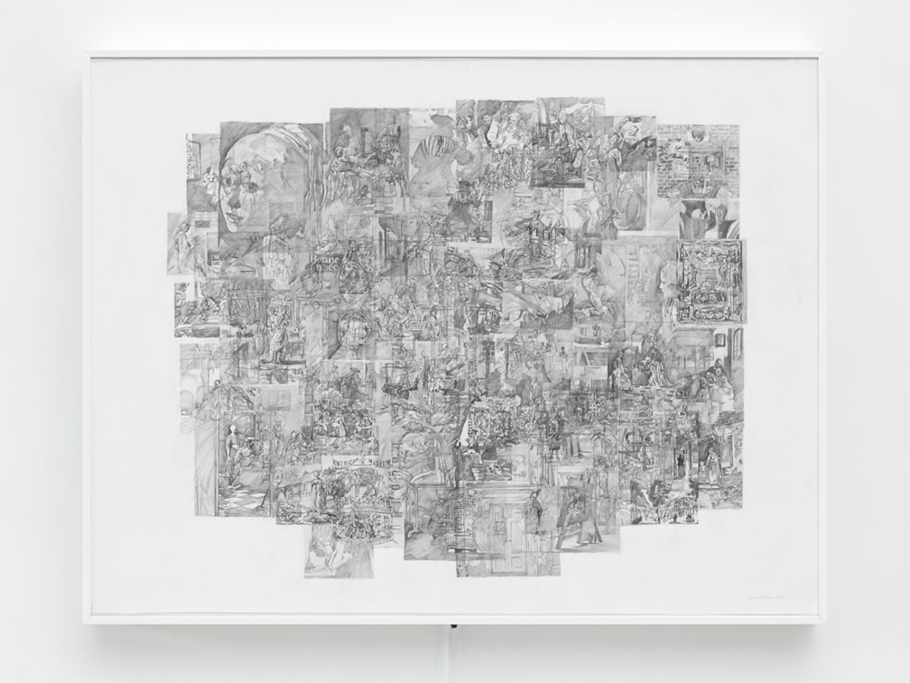 The second part of Muresan’s new exhibition is a series of larger drawings created through layered graphite montage. Super-imposing multiple renderings from monographs into large, one-page macro-texts, Muresan creates a new history for the storied visuals he copies. Unable while growing up to have encountered first-hand the Masters’ works he now copies, Muresan’s current practice further reflects upon realities that most imitation is done from an already second-hand source. Such distance and disassociation imbues Muresan’s drawings with an uncanny sense of being without place. Borrowing both from populist comic stylings as well as early Renaissance drawings, the lushness of his cosmologies are as seductive as they are inhibited. These second and third-hand resources have become a staple within Muresan’s process, compiling visual bastions of information culled from books on artists and theorists such as Bas Jan Ader and Martin Kippenberger. For his current exhibition, Muresan has made two drawings extracted from academic texts on Western Art History. Loaded layers of imagery intersect with text and grey matter within these new works, reflecting the artist’s ongoing search to collate the disconnect between ourselves, our present and the history that defines us.