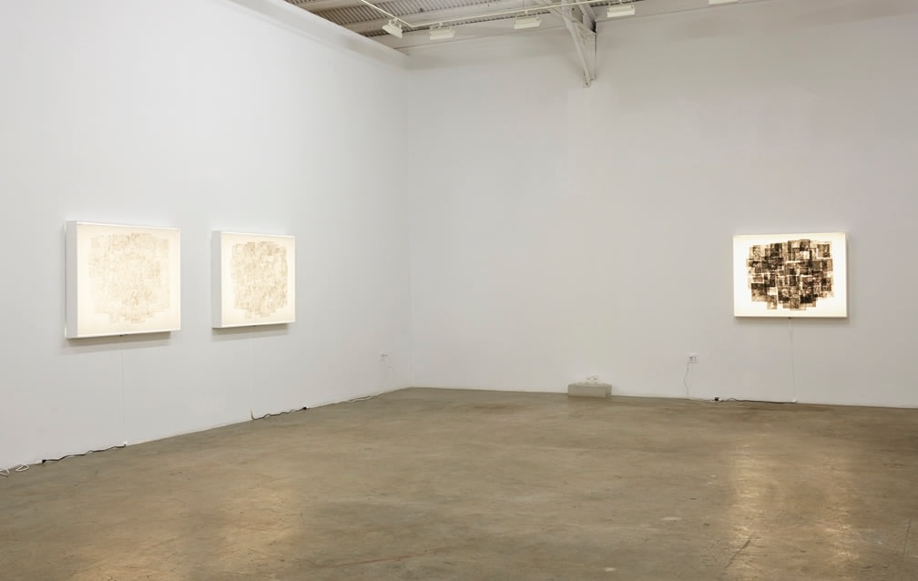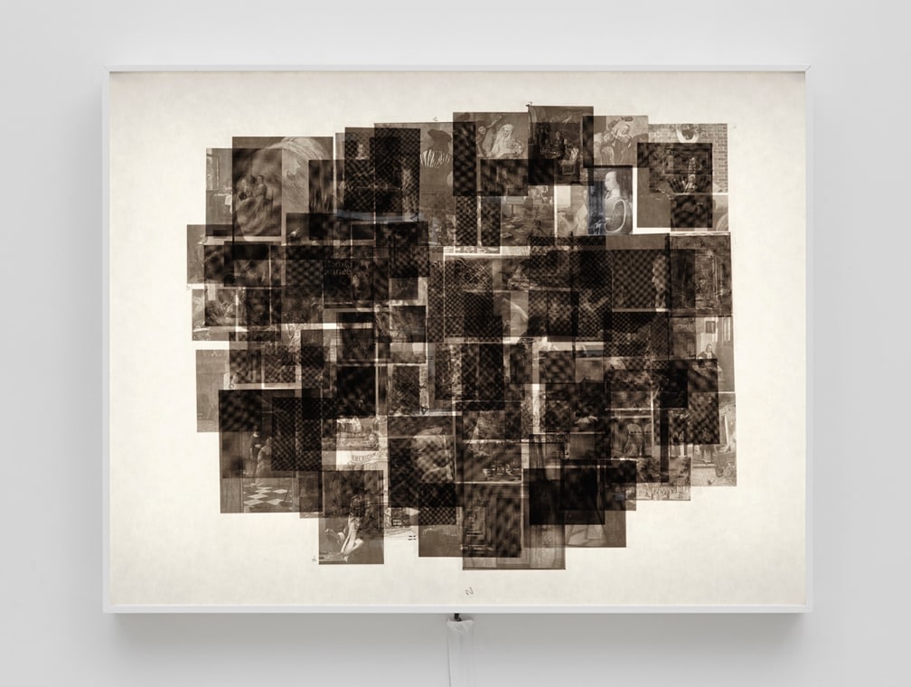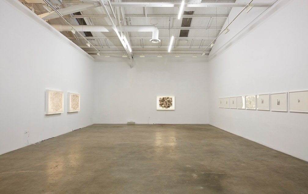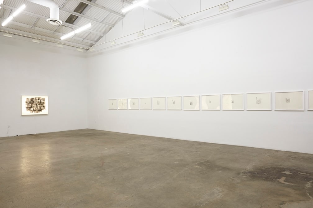 The second part of Muresan’s new exhibition is a series of larger drawings created through layered graphite montage. Super-imposing multiple renderings from monographs into large, one-page macro-texts, Muresan creates a new history for the storied visuals he copies. Unable while growing up to have encountered first-hand the Masters’ works he now copies, Muresan’s current practice further reflects upon realities that most imitation is done from an already second-hand source. Such distance and disassociation imbues Muresan’s drawings with an uncanny sense of being without place. Borrowing both from populist comic stylings as well as early Renaissance drawings, the lushness of his cosmologies are as seductive as they are inhibited. These second and third-hand resources have become a staple within Muresan’s process, compiling visual bastions of information culled from books on artists and theorists such as Bas Jan Ader and Martin Kippenberger. For his current exhibition, Muresan has made two drawings extracted from academic texts on Western Art History. Loaded layers of imagery intersect with text and grey matter within these new works, reflecting the artist’s ongoing search to collate the disconnect between ourselves, our present and the history that defines us.