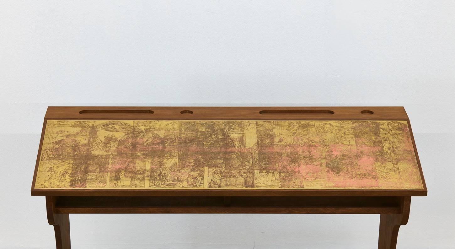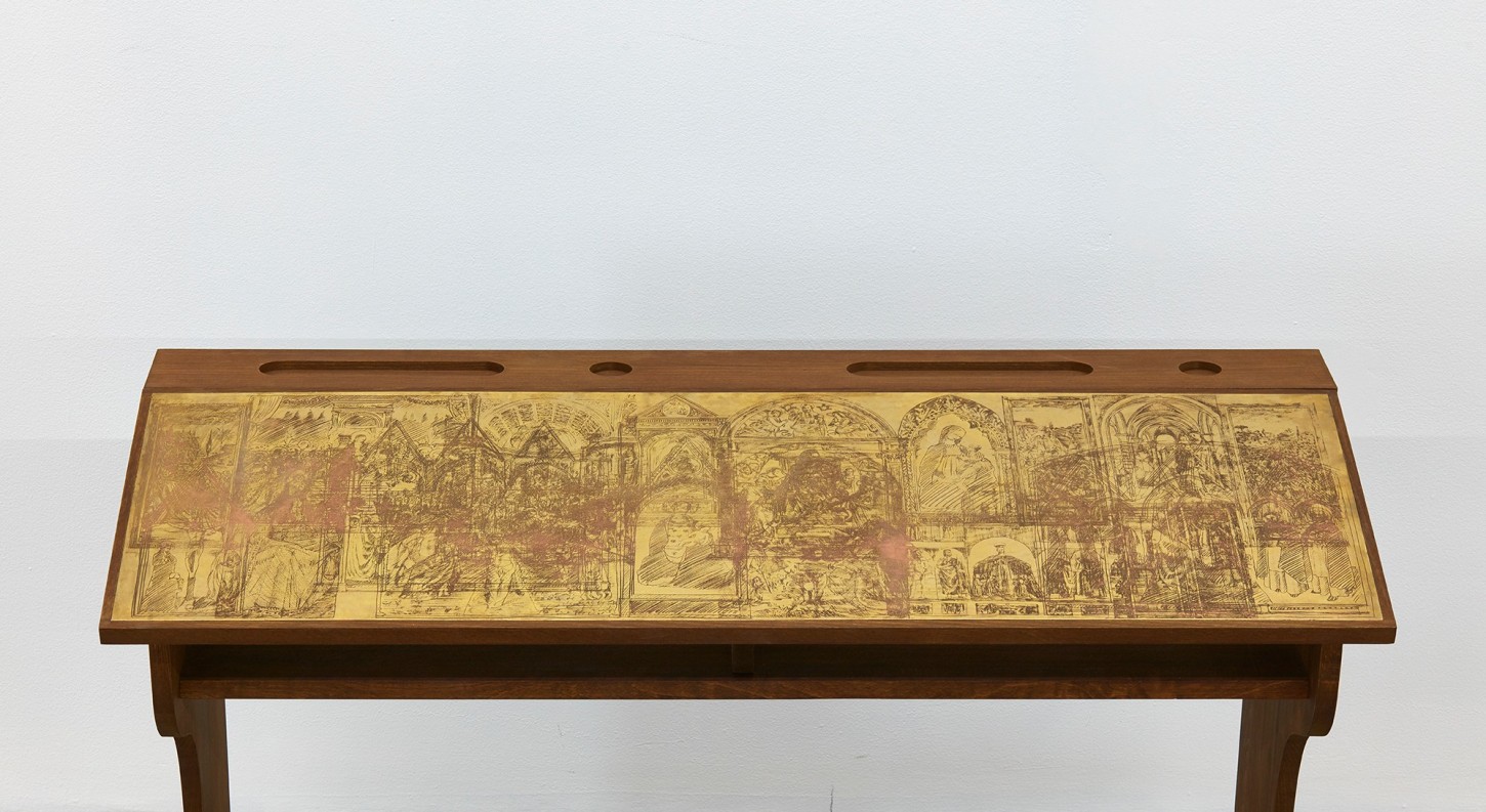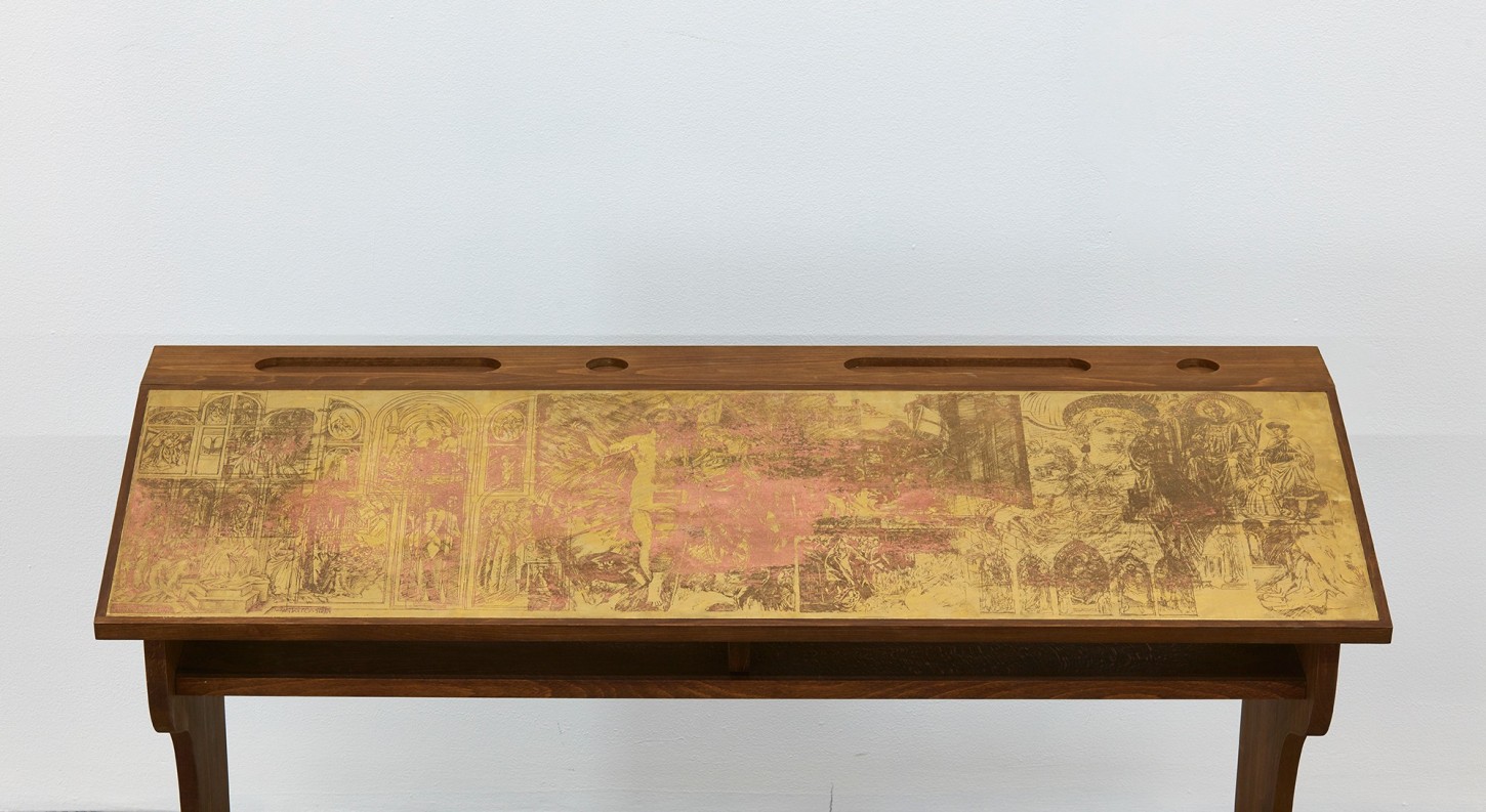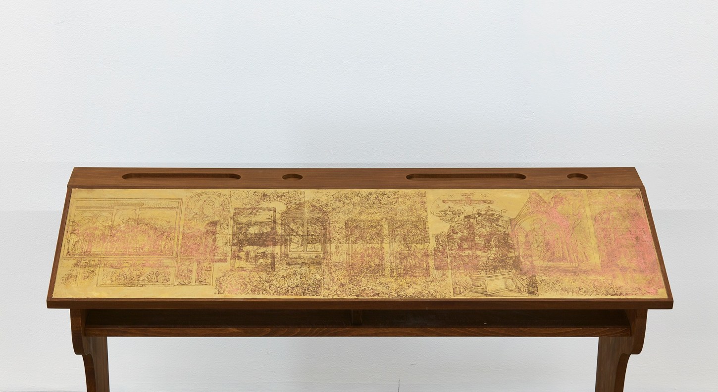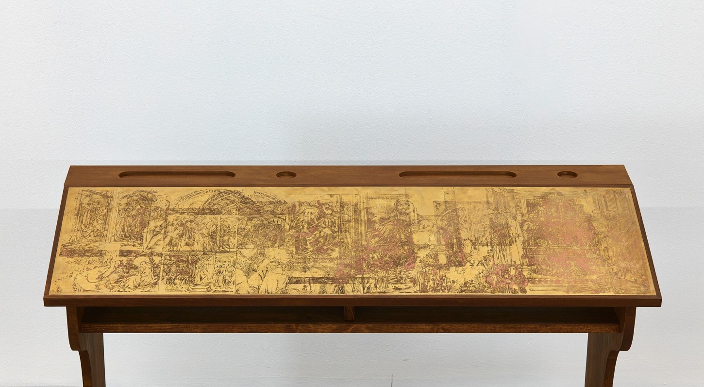 The artist copies various images depicting altar pieces from catalogues of Gothic, Renaissance and Baroque art – art which is characterized by strong cannons and rules. The 150 resulting drawings are then engraved on the brass panels of school benches, in subsequent layers which by multiple superimposition start to deteriorate the drawing itself.