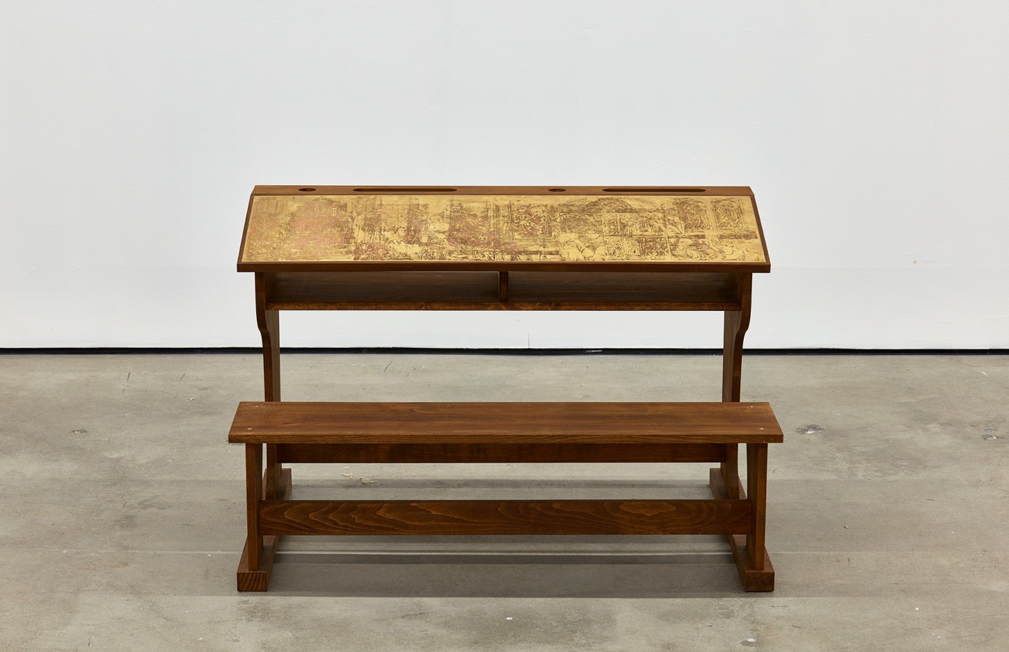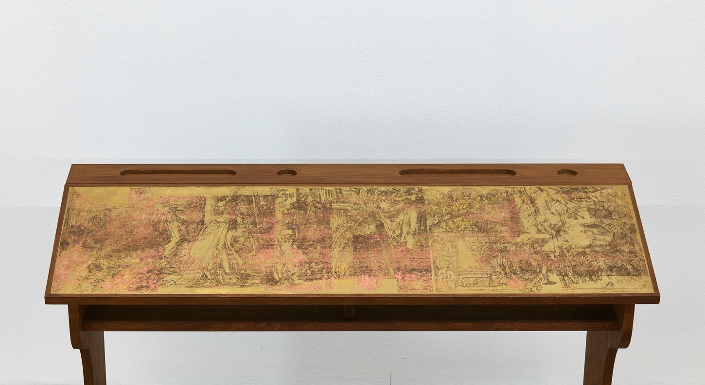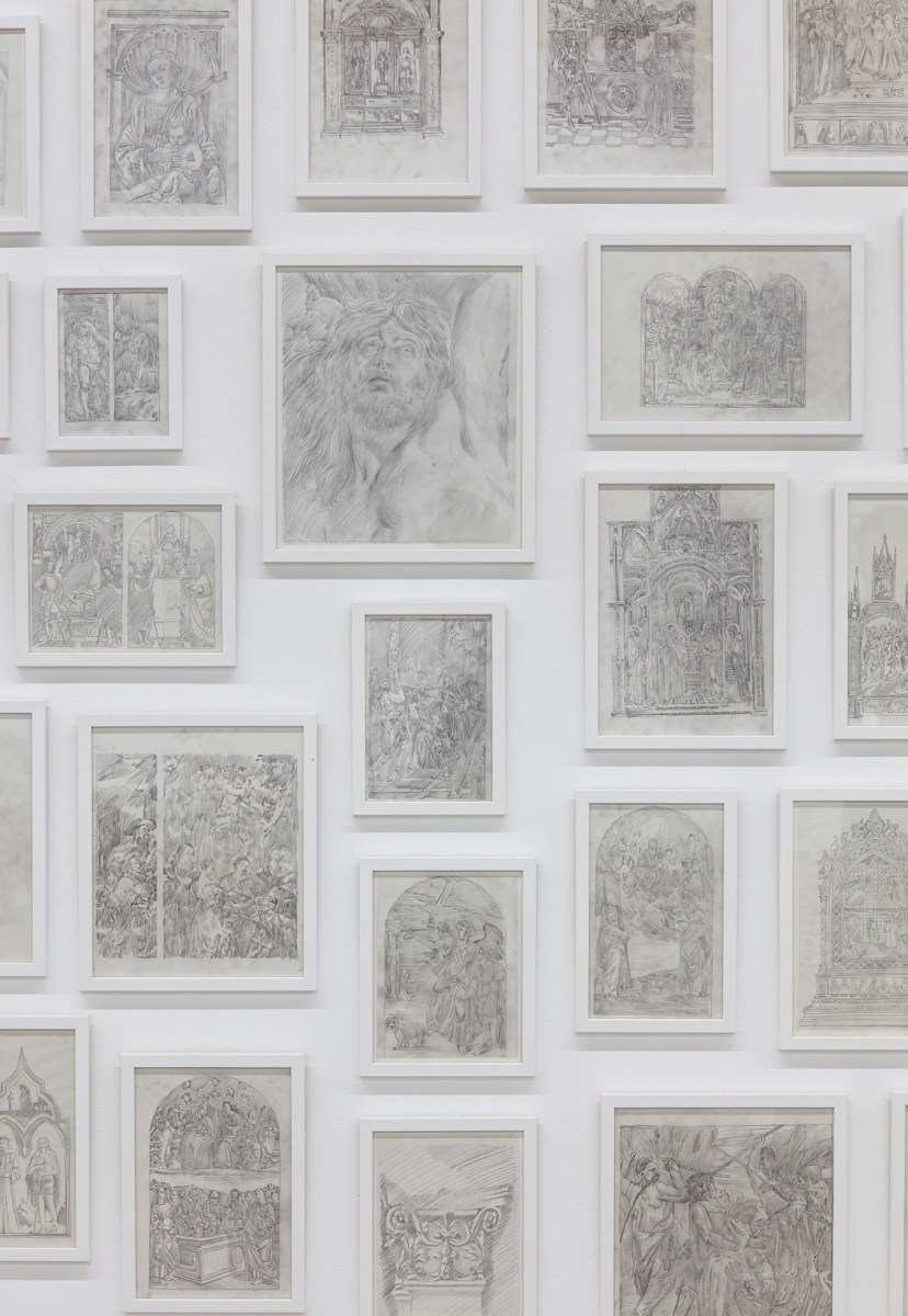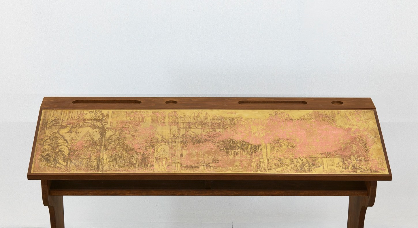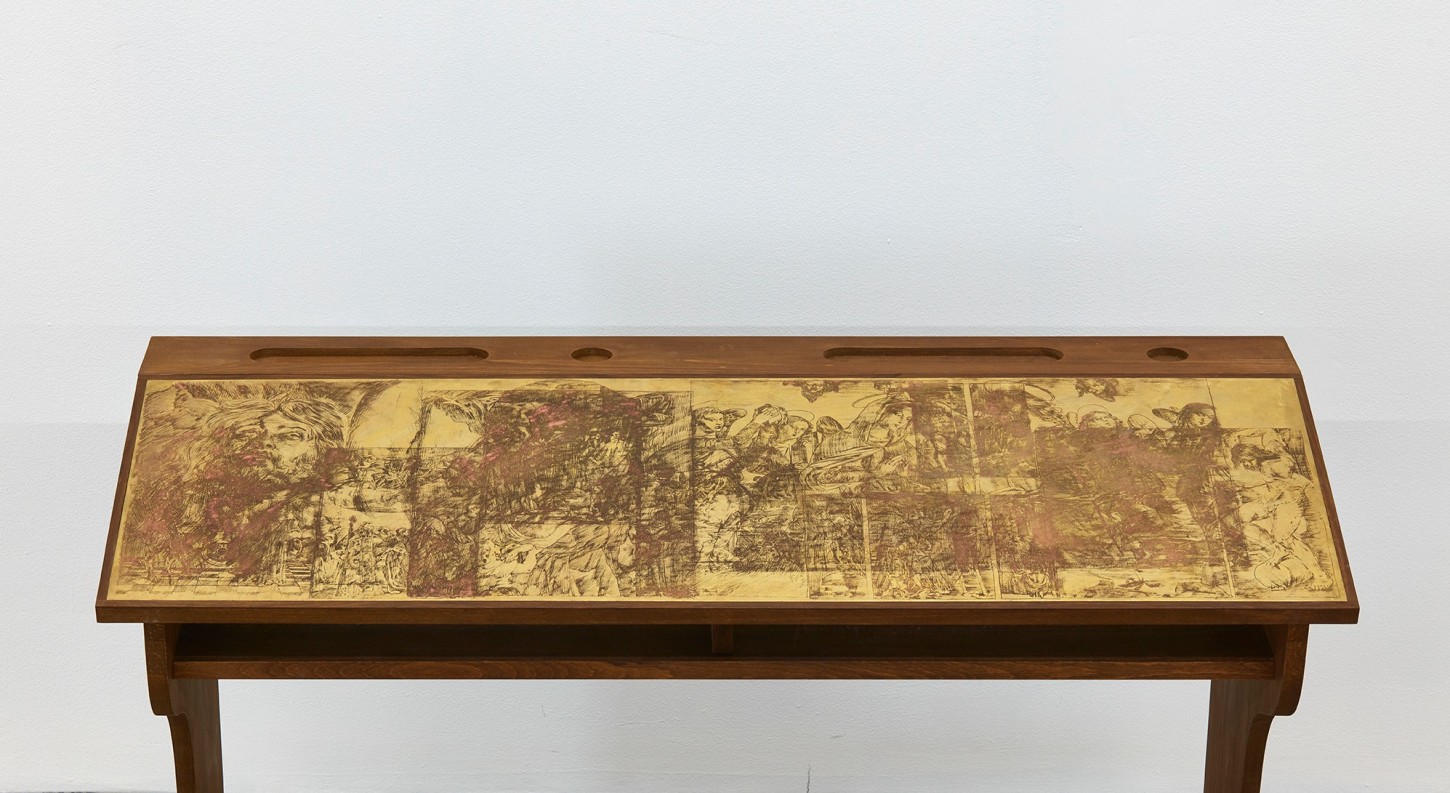 The artist copies various images depicting altar pieces from catalogues of Gothic, Renaissance and Baroque art – art which is characterized by strong cannons and rules. The 150 resulting drawings are then engraved on the brass panels of school benches, in subsequent layers which by multiple superimposition start to deteriorate the drawing itself.