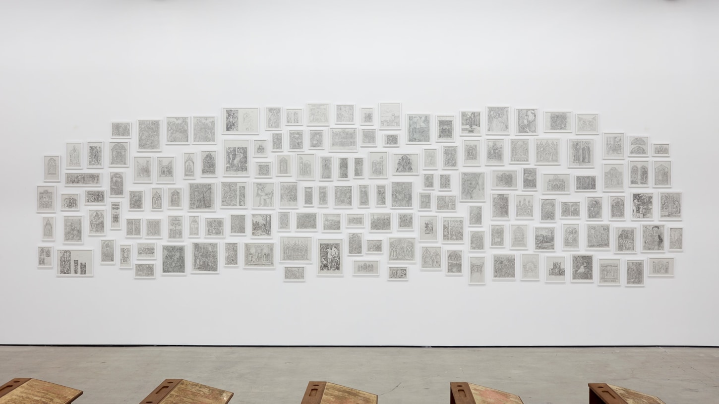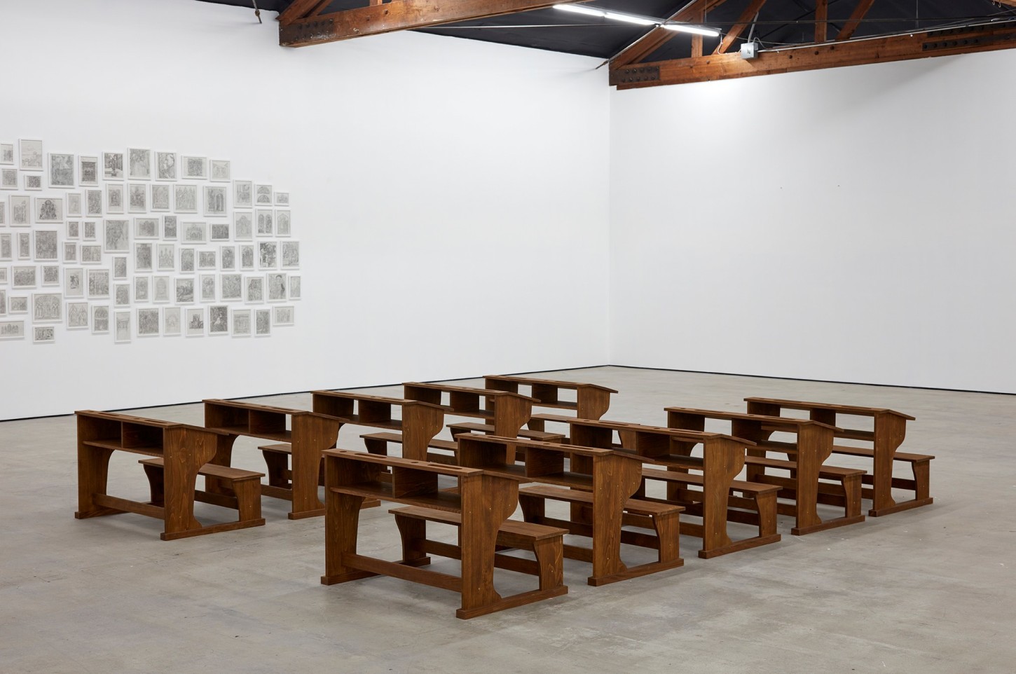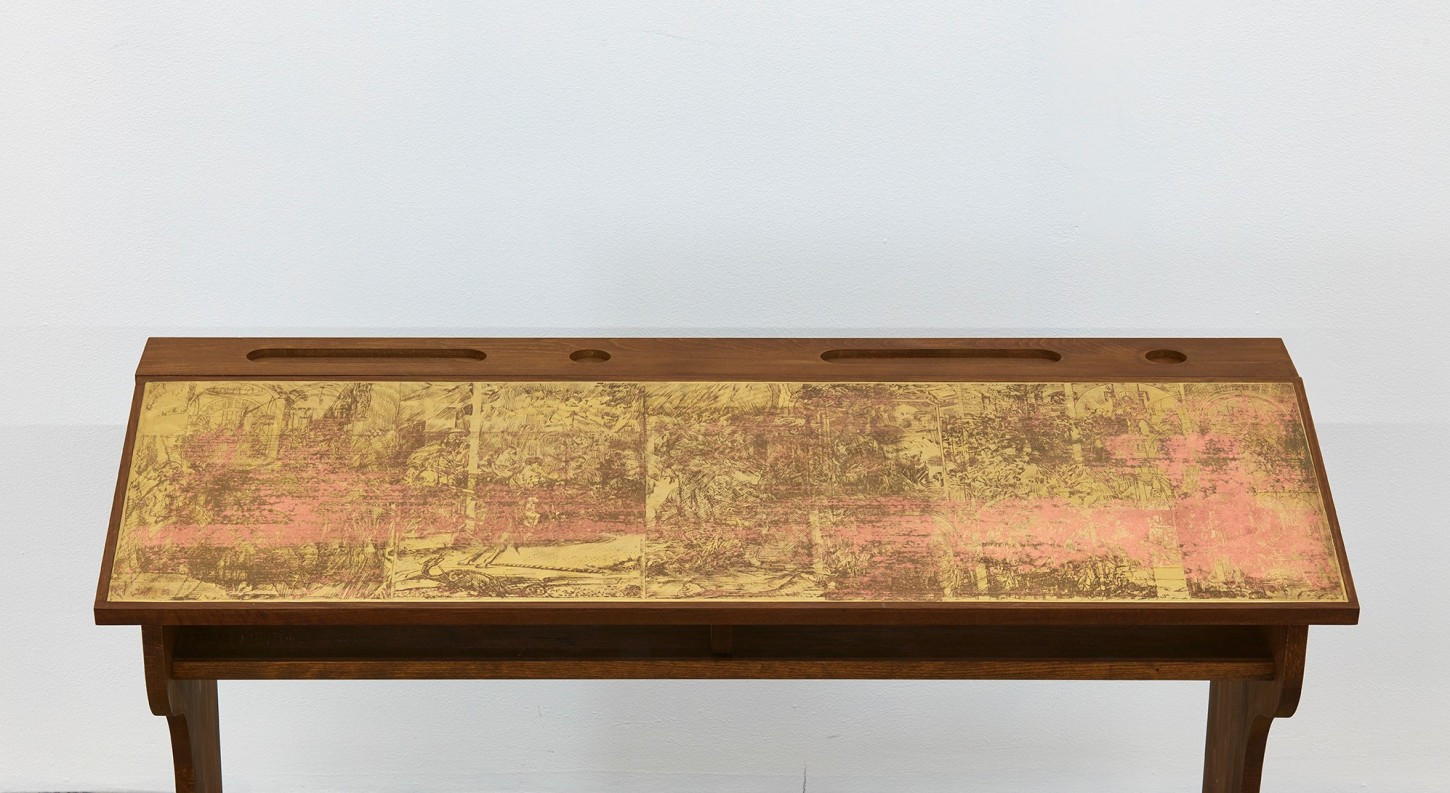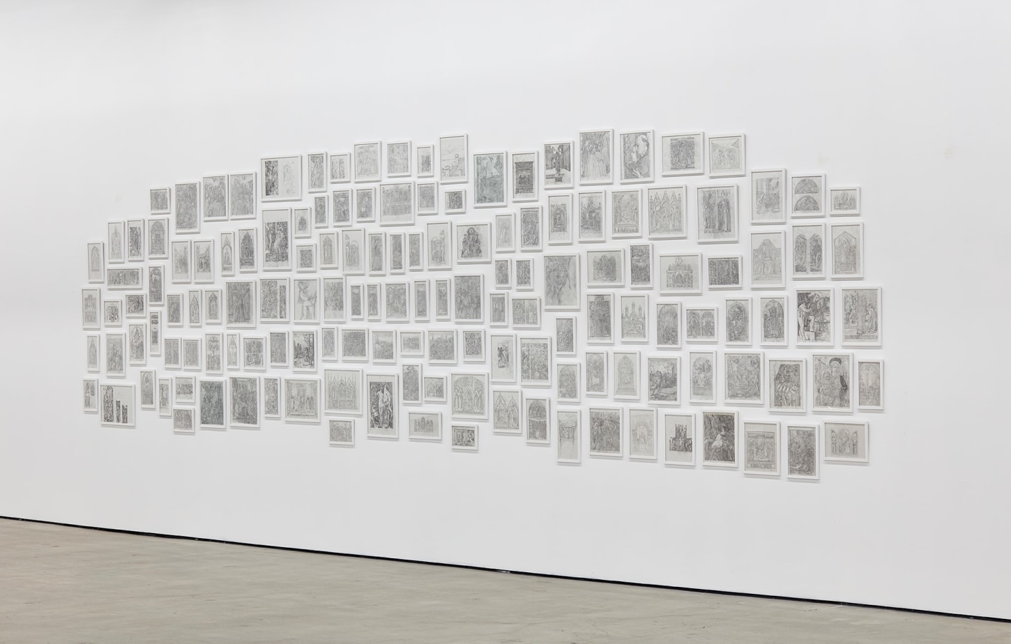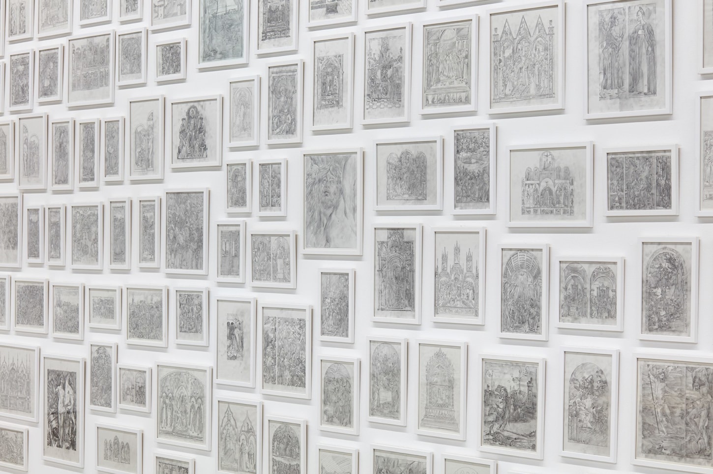 The artist copies various images depicting altar pieces from catalogues of Gothic, Renaissance and Baroque art – art which is characterized by strong cannons and rules. The 150 resulting drawings are then engraved on the brass panels of school benches, in subsequent layers which by multiple superimposition start to deteriorate the drawing itself.