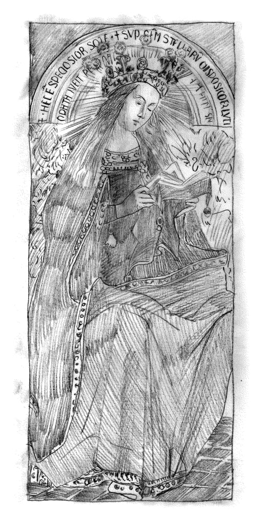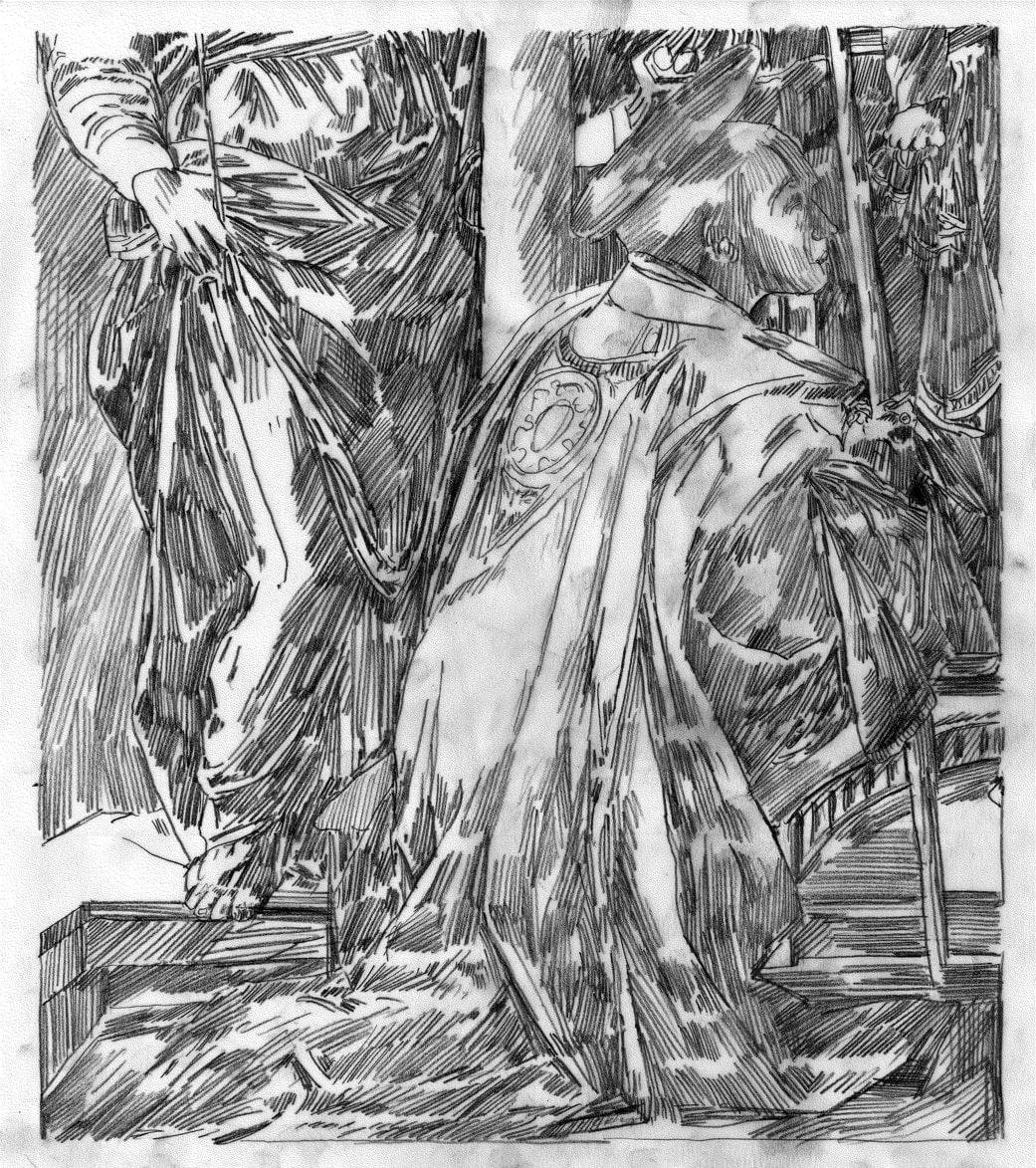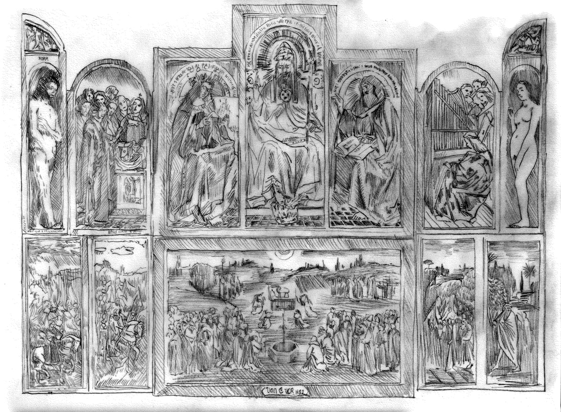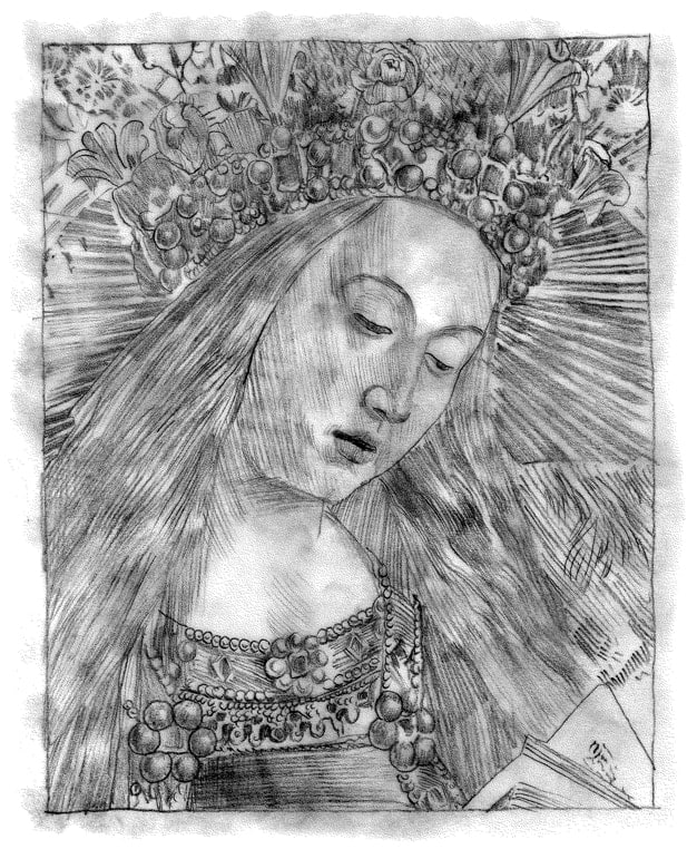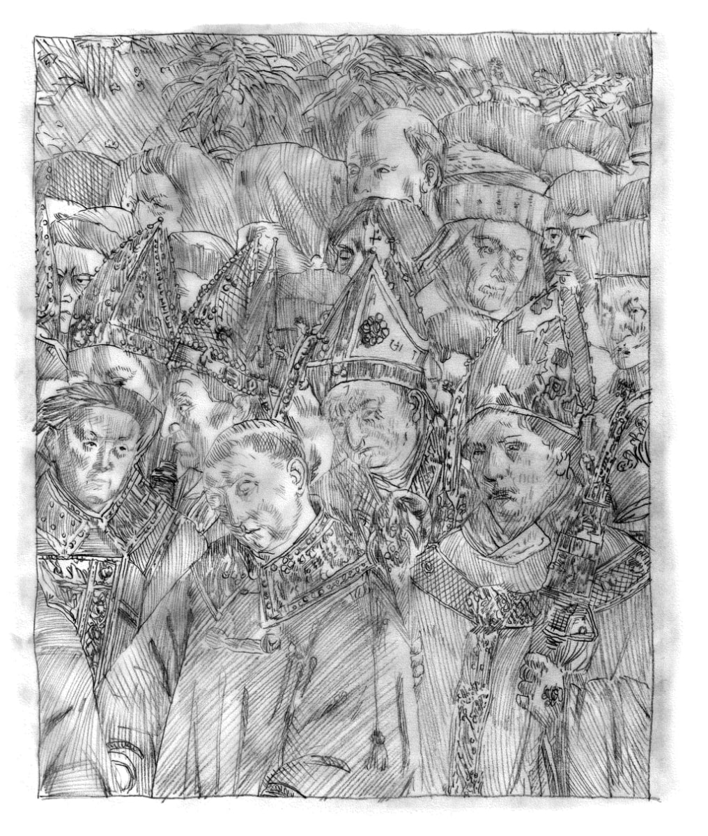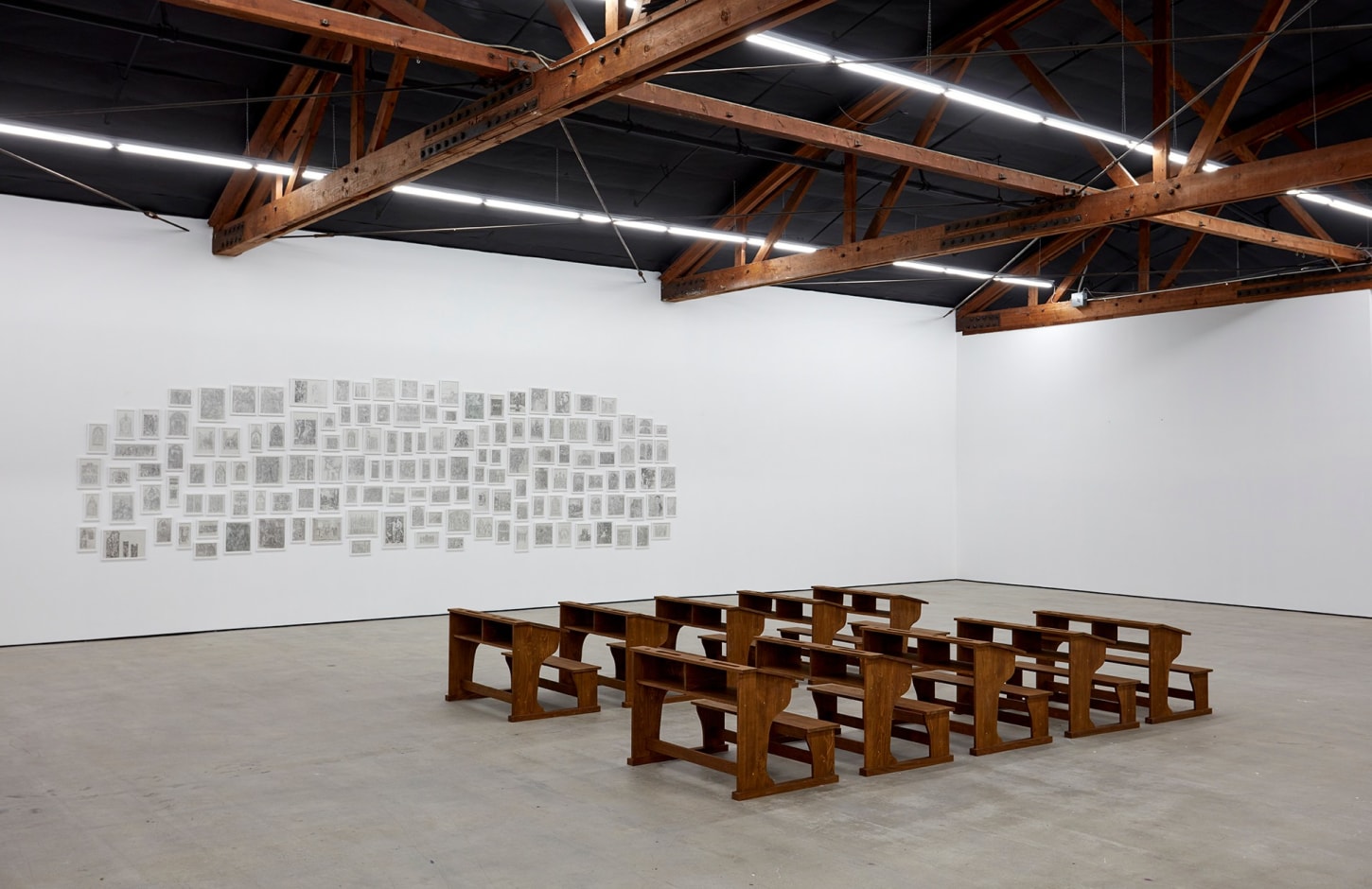 The artist copies various images depicting altar pieces from catalogues of Gothic, Renaissance and Baroque art – art which is characterized by strong cannons and rules. The 150 resulting drawings are then engraved on the brass panels of school benches, in subsequent layers which by multiple superimposition start to deteriorate the drawing itself.