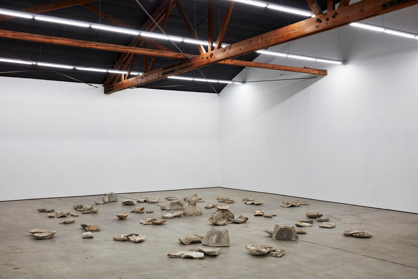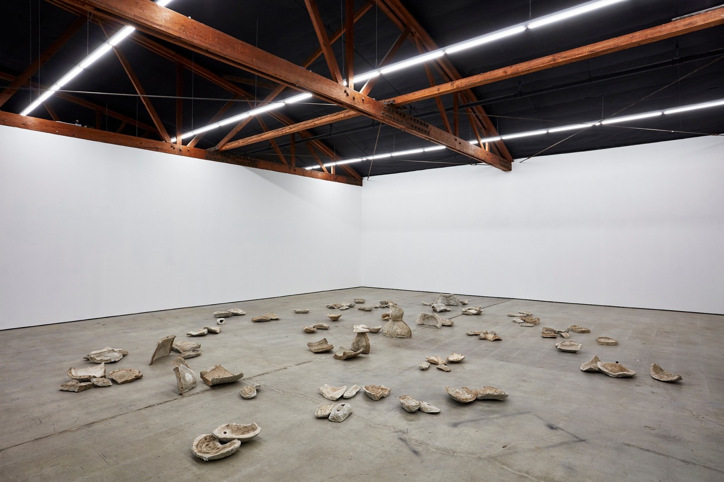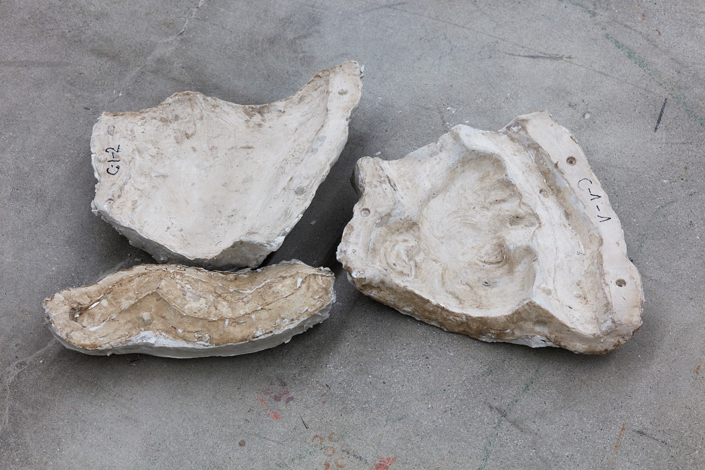 and absurd mechanism, a generator of objects deceptively functional. Representing imaginary rings of time, the installation resembles sections of a tree trunk, where each layer of the casting process becomes more diluted and detached from the original, becoming more and more abstract, as if the levels of interpretation, the diverse contexts added in time, detach the original from its initial function of propaganda and slowly transform it into a museum object.