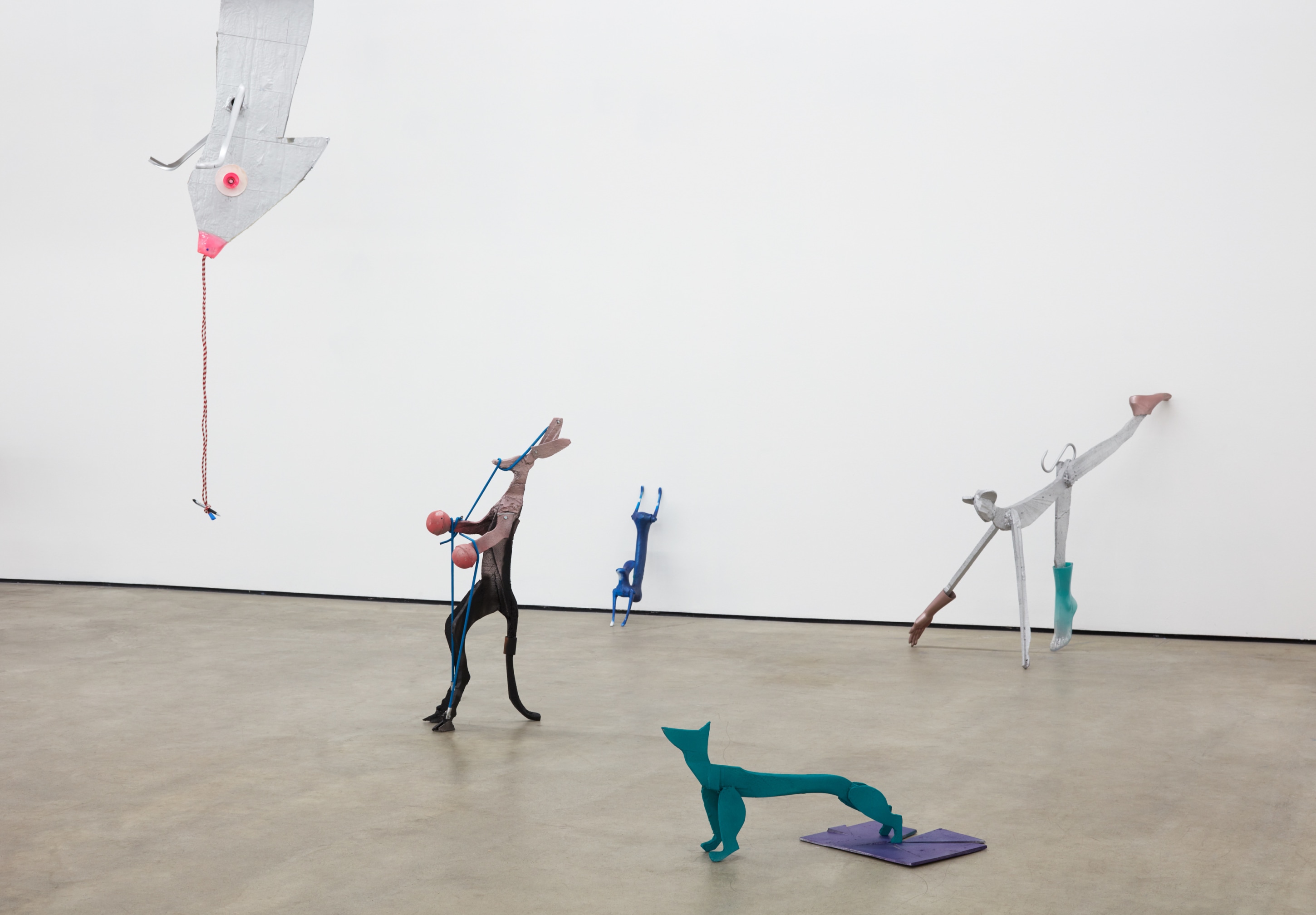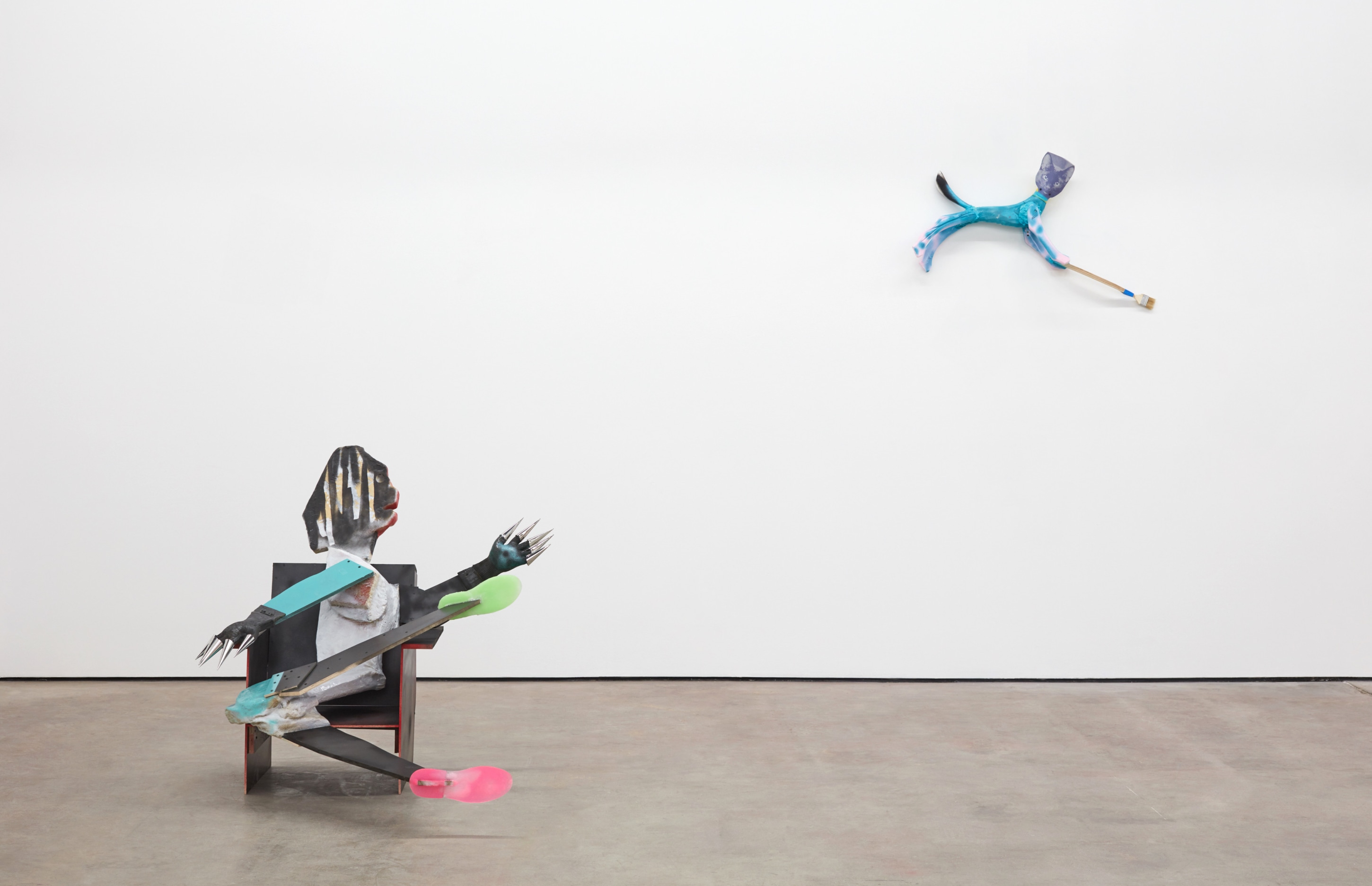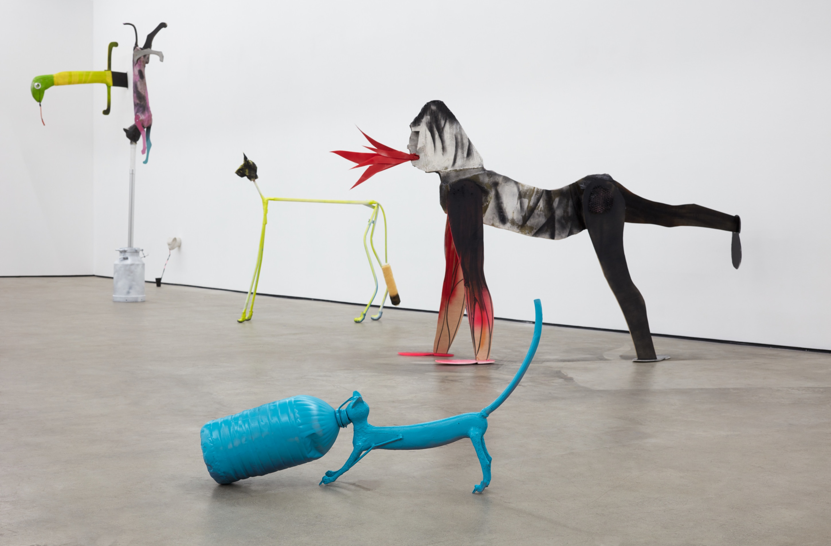 We learn quickly that the primordial soup is not a pulsing mitosis gasping for air, but instead a Home Depot rich in opportunities, crude and visionary, like cast shadows on a cave wall, actualities of some alternate reality—a more real reality. In Răduță’s world, the metaphor becomes literal: a chair’s leg is a hominid’s leg; the gorilla’s sharp purple “pipe” is erected from a circumcised sink pipe. An intimate knowledge of these resources is not necessary, however. They are preverbal and intuitive. Naming them would somehow discourage their being, shaming them from the garden towards an unwanted conformity.