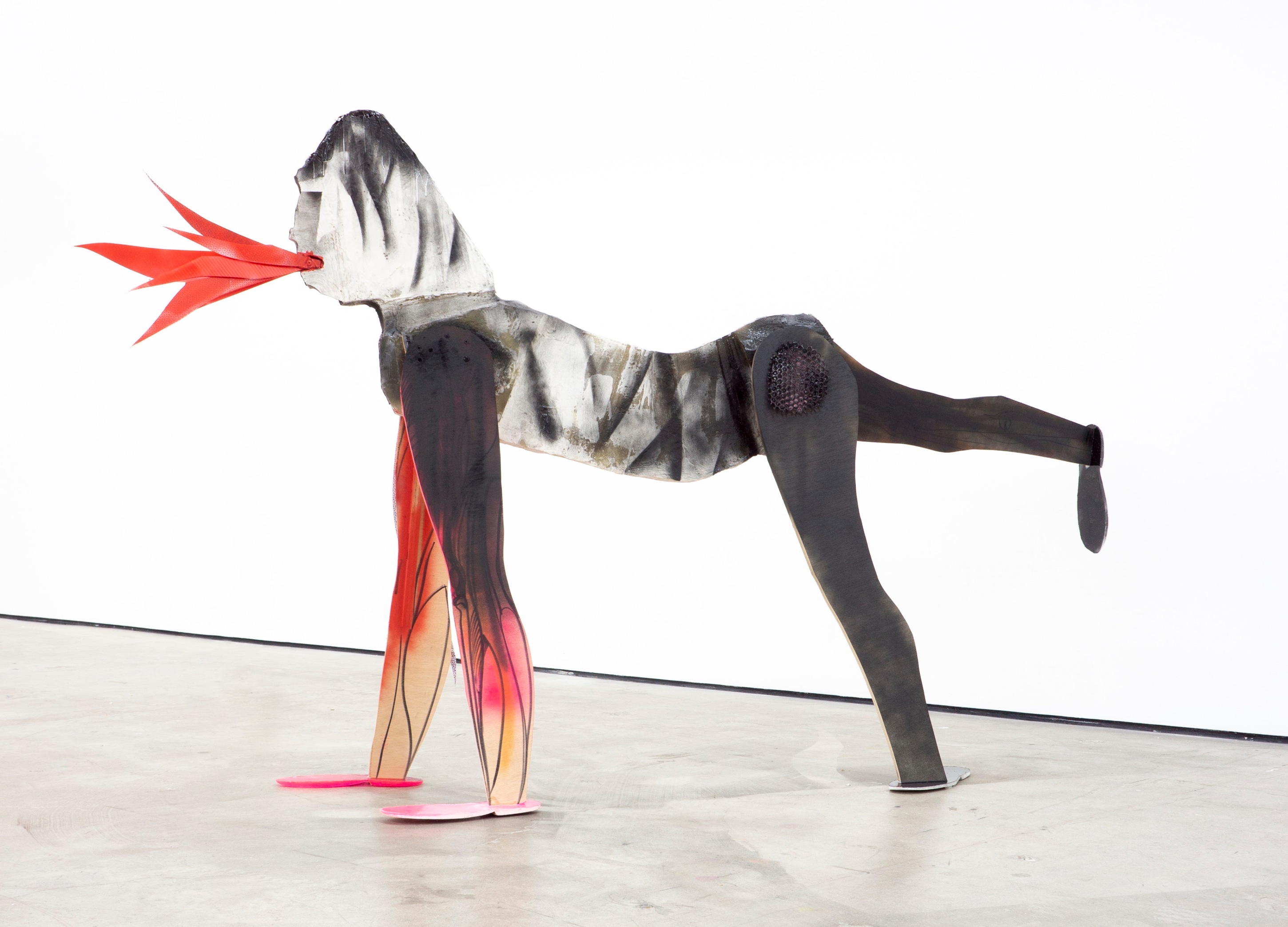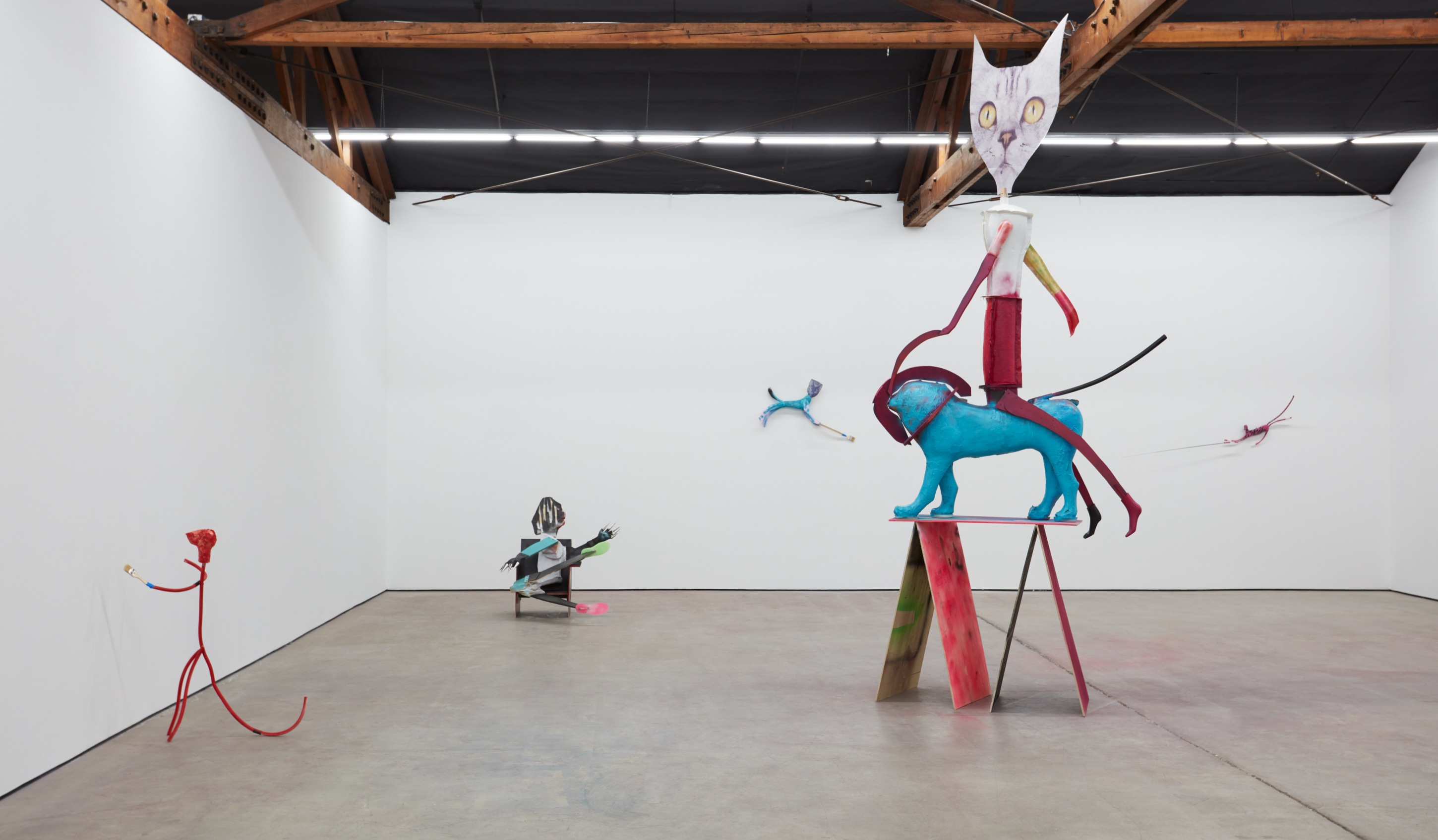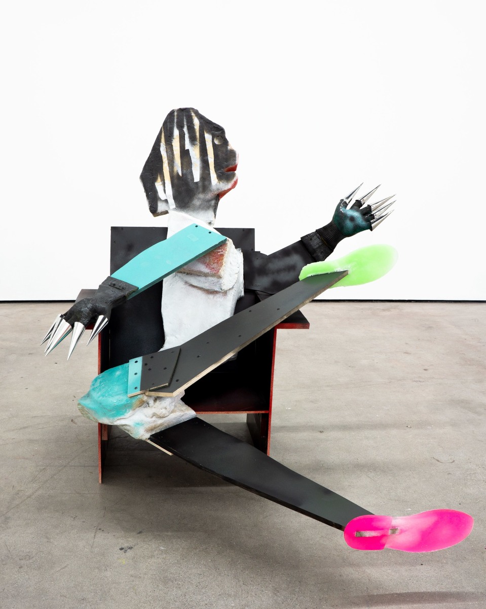 We learn quickly that the primordial soup is not a pulsing mitosis gasping for air, but instead a Home Depot rich in opportunities, crude and visionary, like cast shadows on a cave wall, actualities of some alternate reality—a more real reality. In Răduță’s world, the metaphor becomes literal: a chair’s leg is a hominid’s leg; the gorilla’s sharp purple “pipe” is erected from a circumcised sink pipe. An intimate knowledge of these resources is not necessary, however. They are preverbal and intuitive. Naming them would somehow discourage their being, shaming them from the garden towards an unwanted conformity.