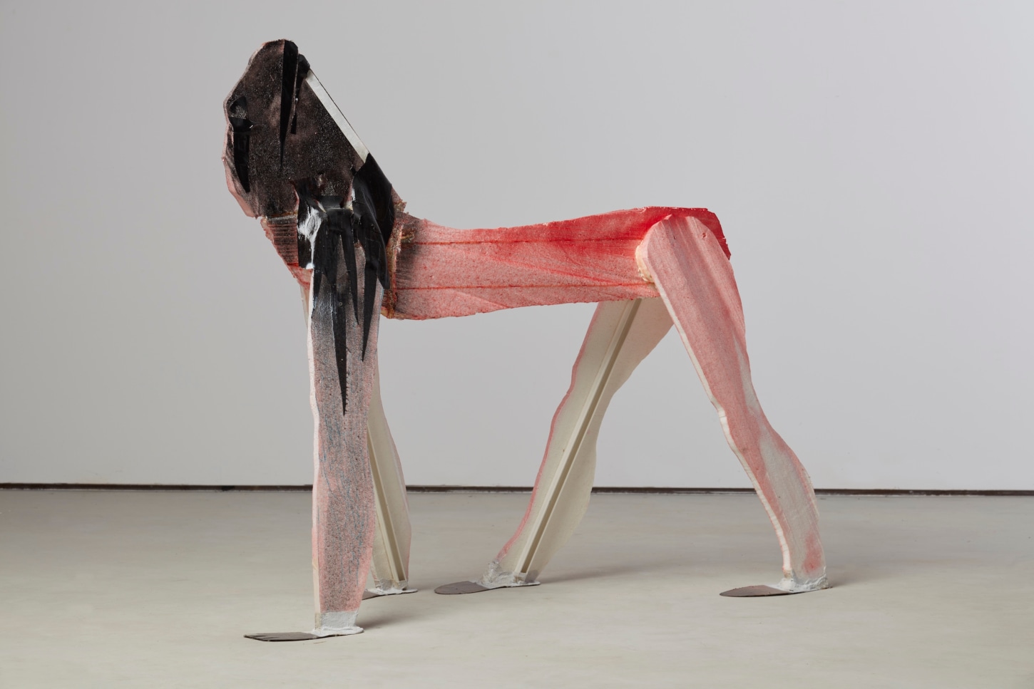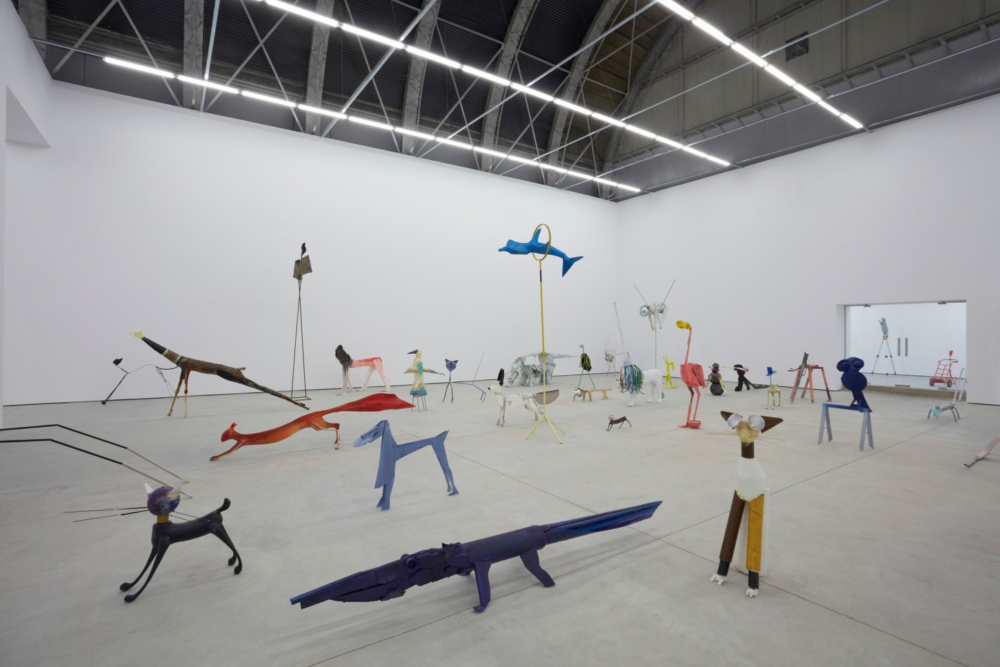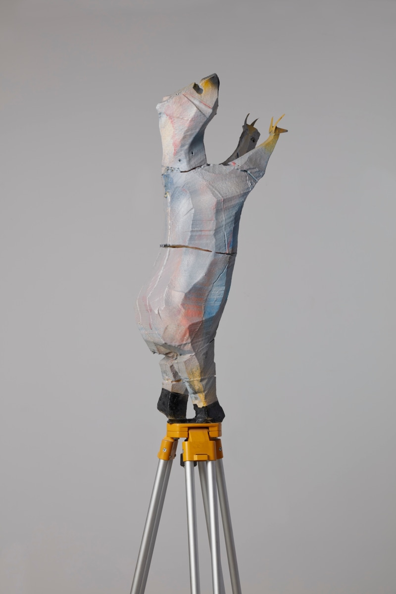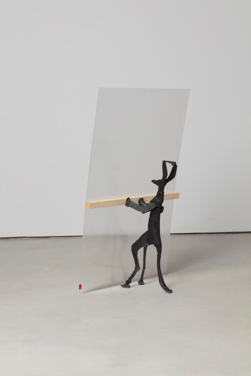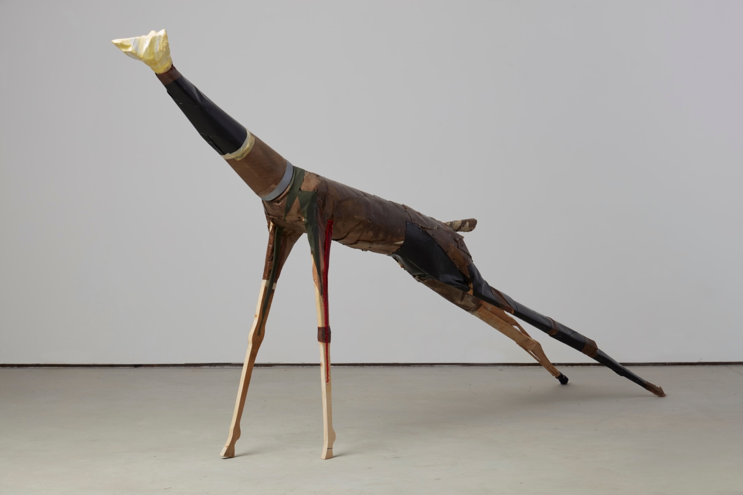 A row of exhausted pseudo-animals seems to be in the homestretch of a marathon. With their long polystyrene necks, they remain in-line, civilized, desperately glancing ahead without even noticing us. They are convinced that they will find their answers and their liberation on the other side of the wall, and they are ready to do anything to get there.
