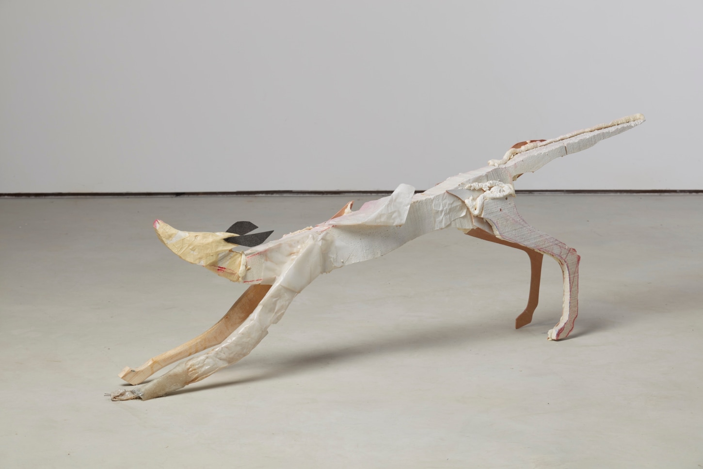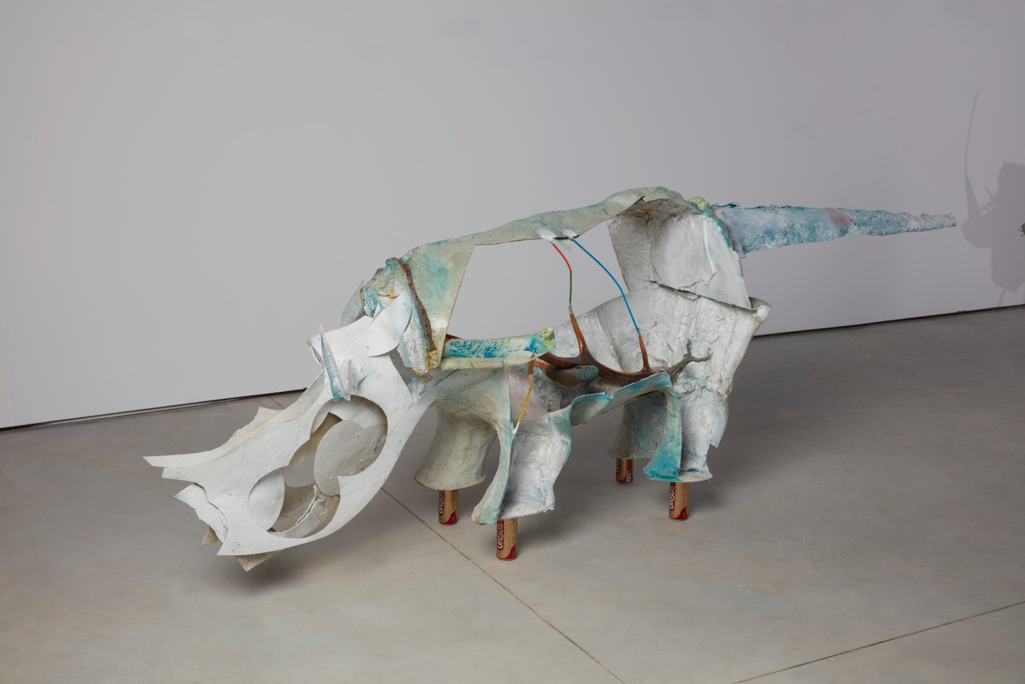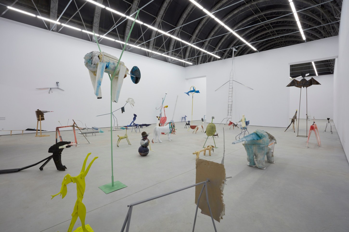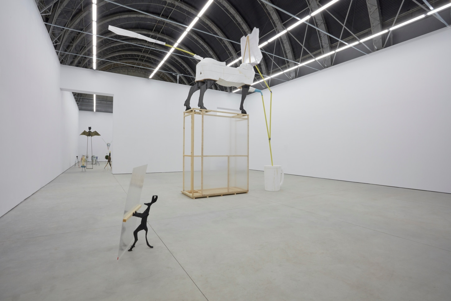 A row of exhausted pseudo-animals seems to be in the homestretch of a marathon. With their long polystyrene necks, they remain in-line, civilized, desperately glancing ahead without even noticing us. They are convinced that they will find their answers and their liberation on the other side of the wall, and they are ready to do anything to get there.