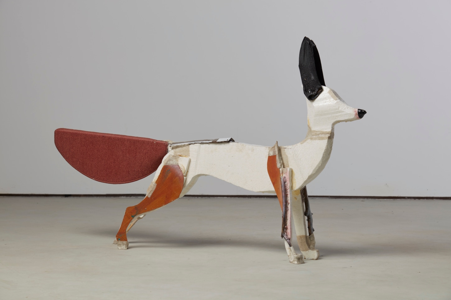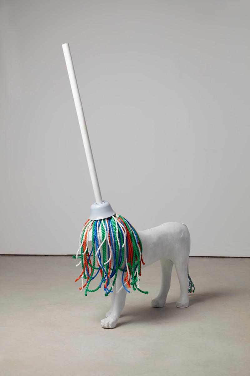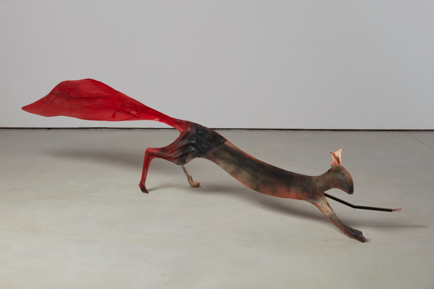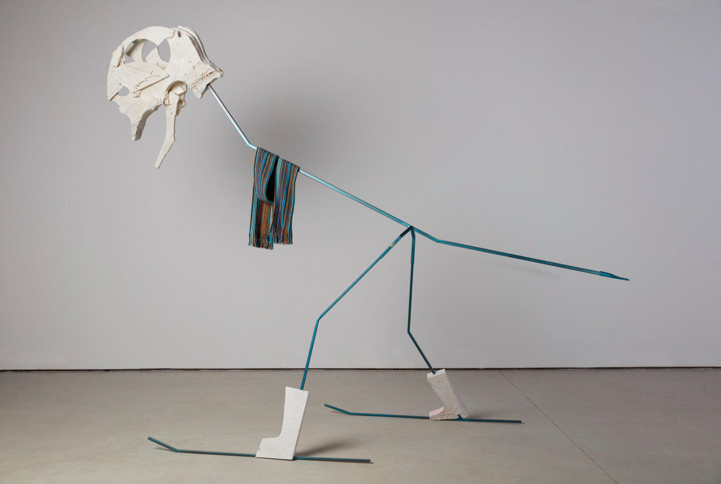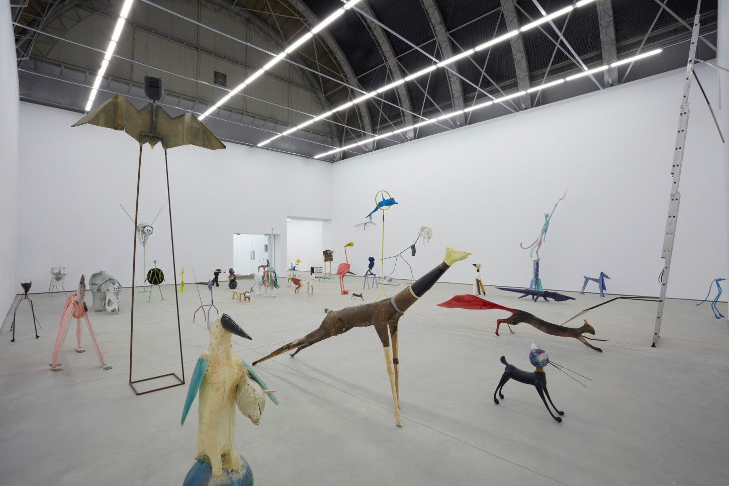 A row of exhausted pseudo-animals seems to be in the homestretch of a marathon. With their long polystyrene necks, they remain in-line, civilized, desperately glancing ahead without even noticing us. They are convinced that they will find their answers and their liberation on the other side of the wall, and they are ready to do anything to get there.
