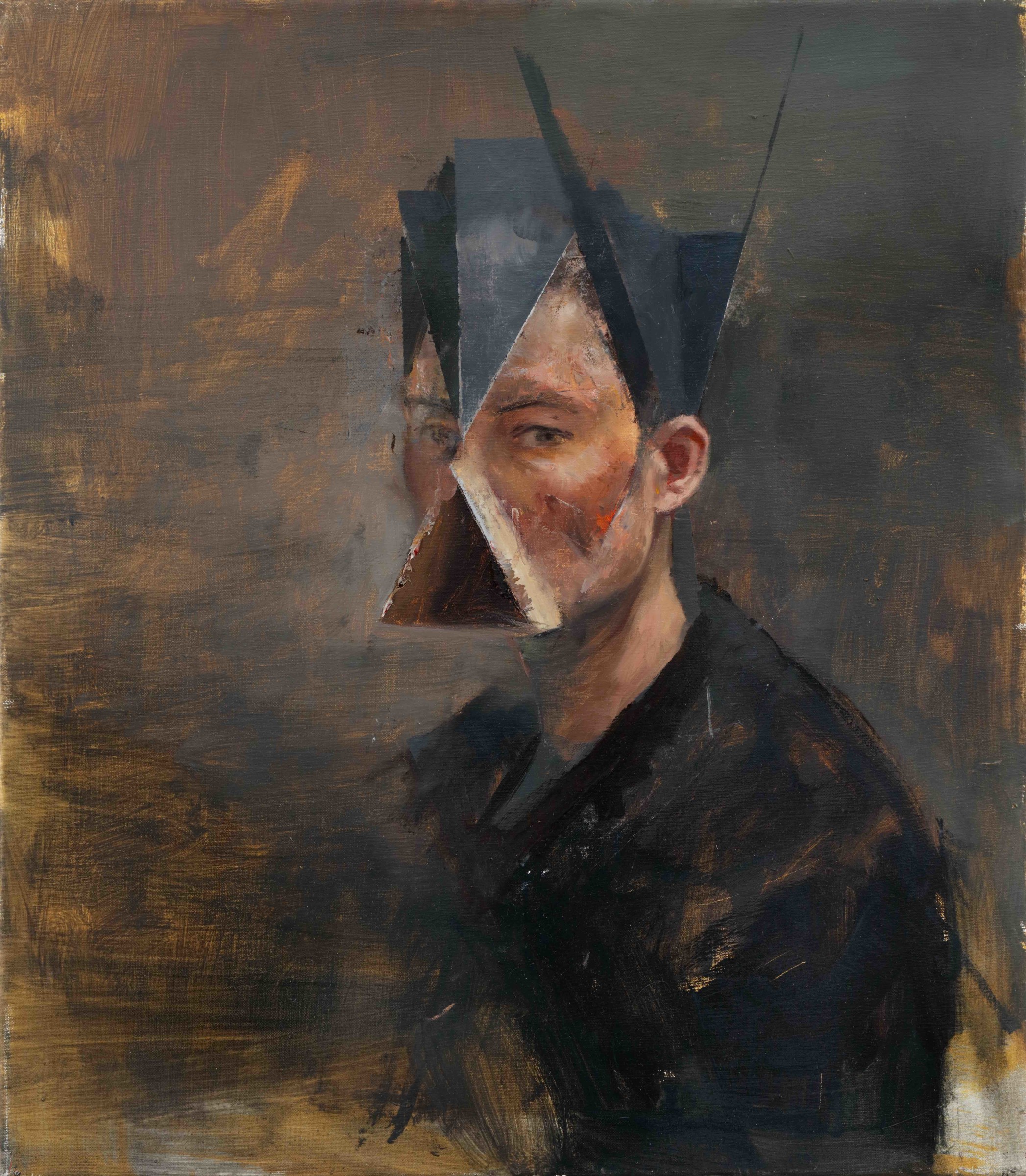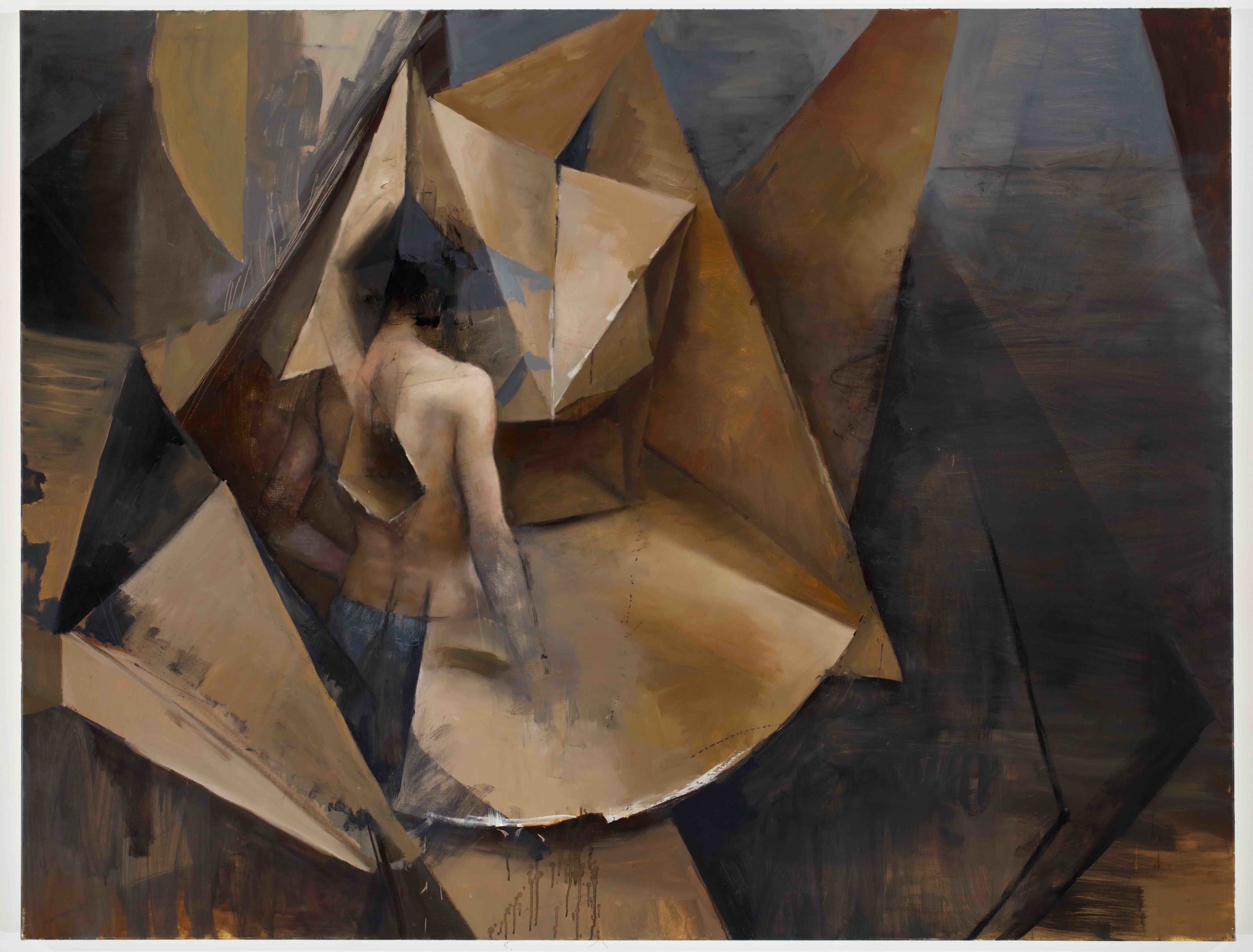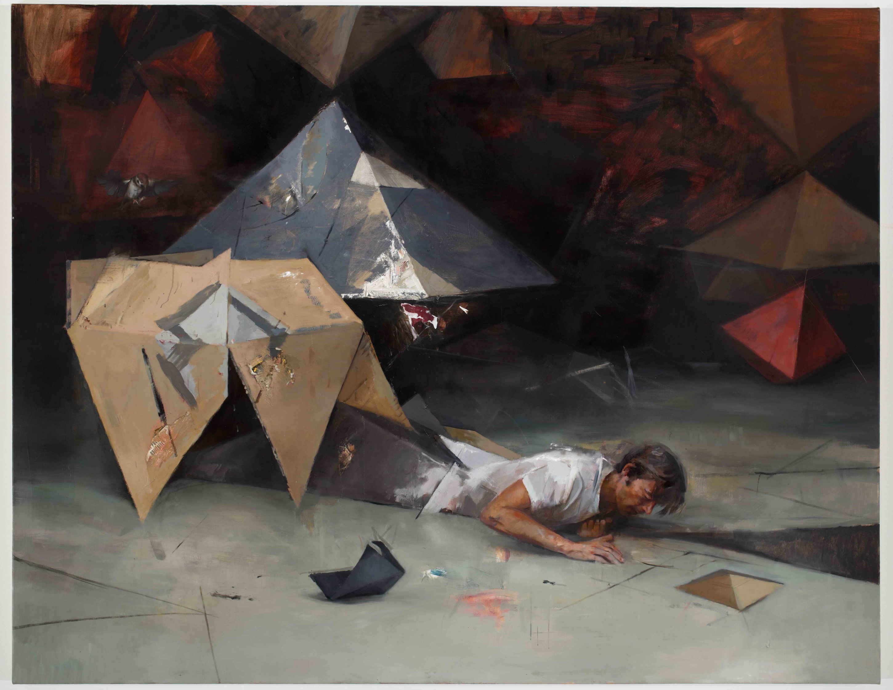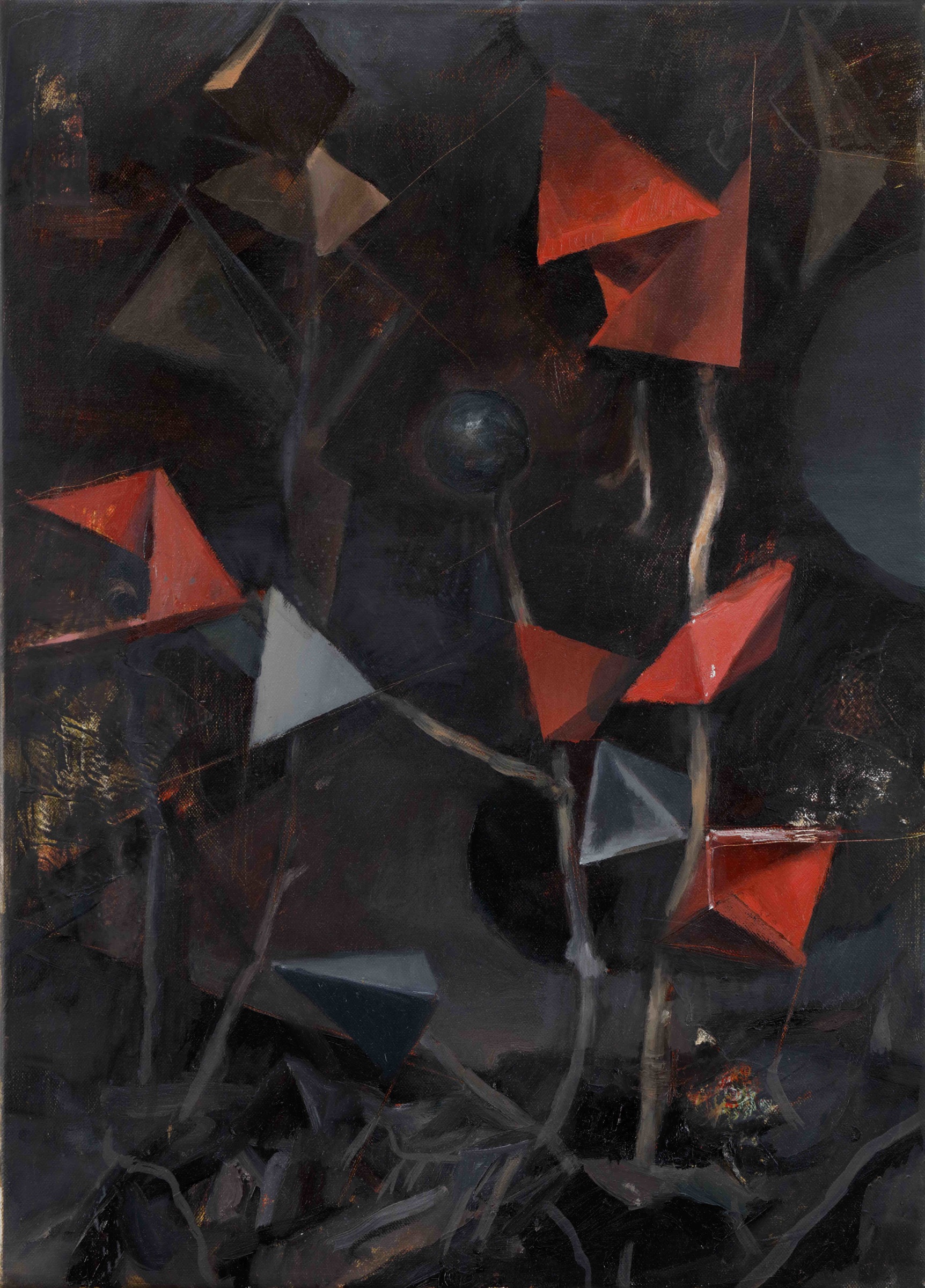 The paintings of Daniel Pitín are firmly holding on to the eternal distinction between light and darkness. Light, dispersed from an invisible and ungraspable source focuses on the surface of the canvas, piercing through it and finding its way around and reflecting through numerous forms folded into the composition of the image somewhere between architecture, scenography and a vivid inner space. The play of light and darkness is thus the key element of formation of the space, its moods and variability seemingly frozen in the static image on the canvas, yet still breathing with fresh inputs coming from its extraneous environment and ocular abilities of its viewers. The given matter, building blocks of the content stays in the constant flux of transfiguration, with shades of approaching light, through the light, as light itself. Pitín is thus touching field of prefigurations of his work, its main referential points in Czech avant-garde photography of František Drtikol, Jaromir Funke or Josef Sudek, in tradition of cubist painting and even deeper in history, as in baroque paintings through the technique of chiaroscuro, based on strong distinctions between tonal variations, therefore conceiving a dramatic, almost theatrical visual feeling.