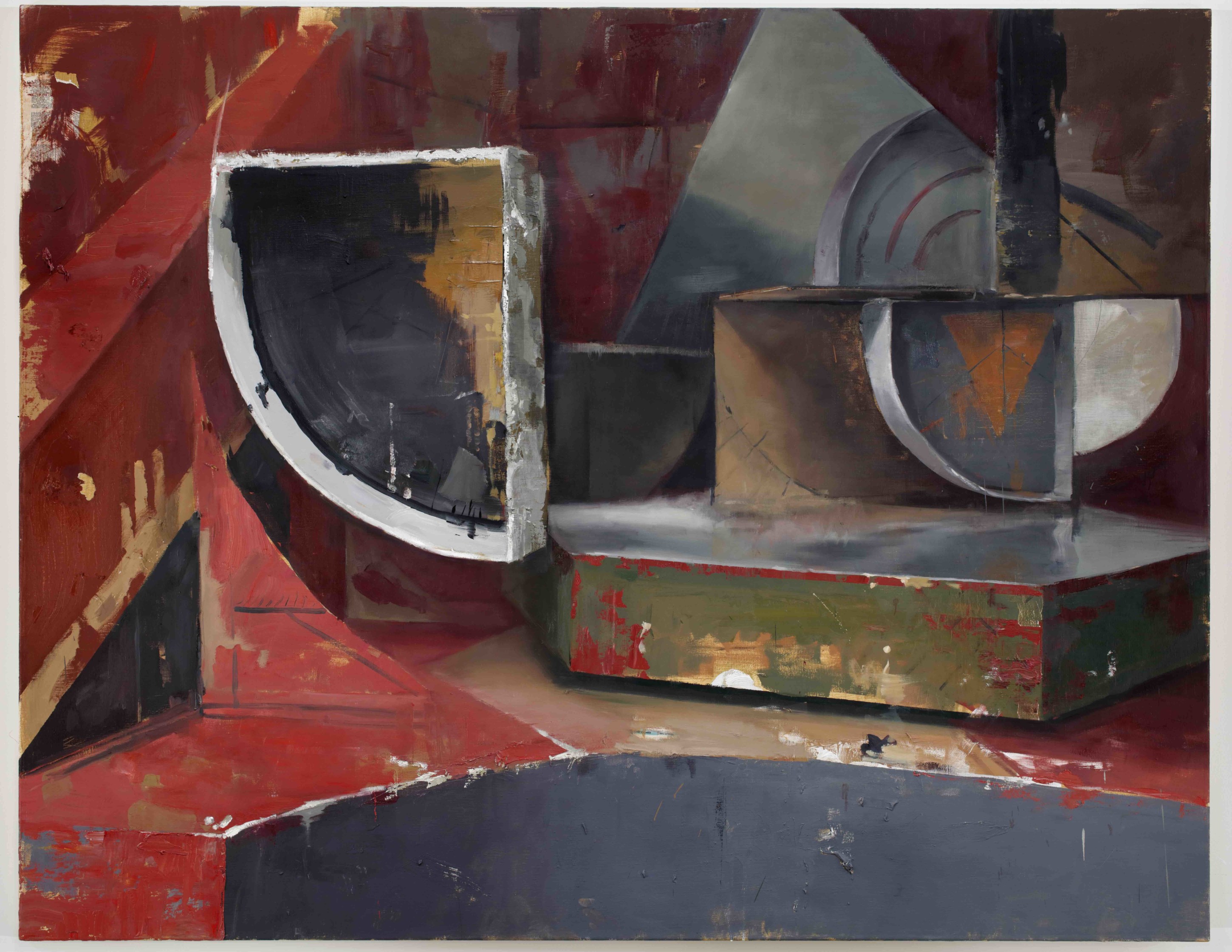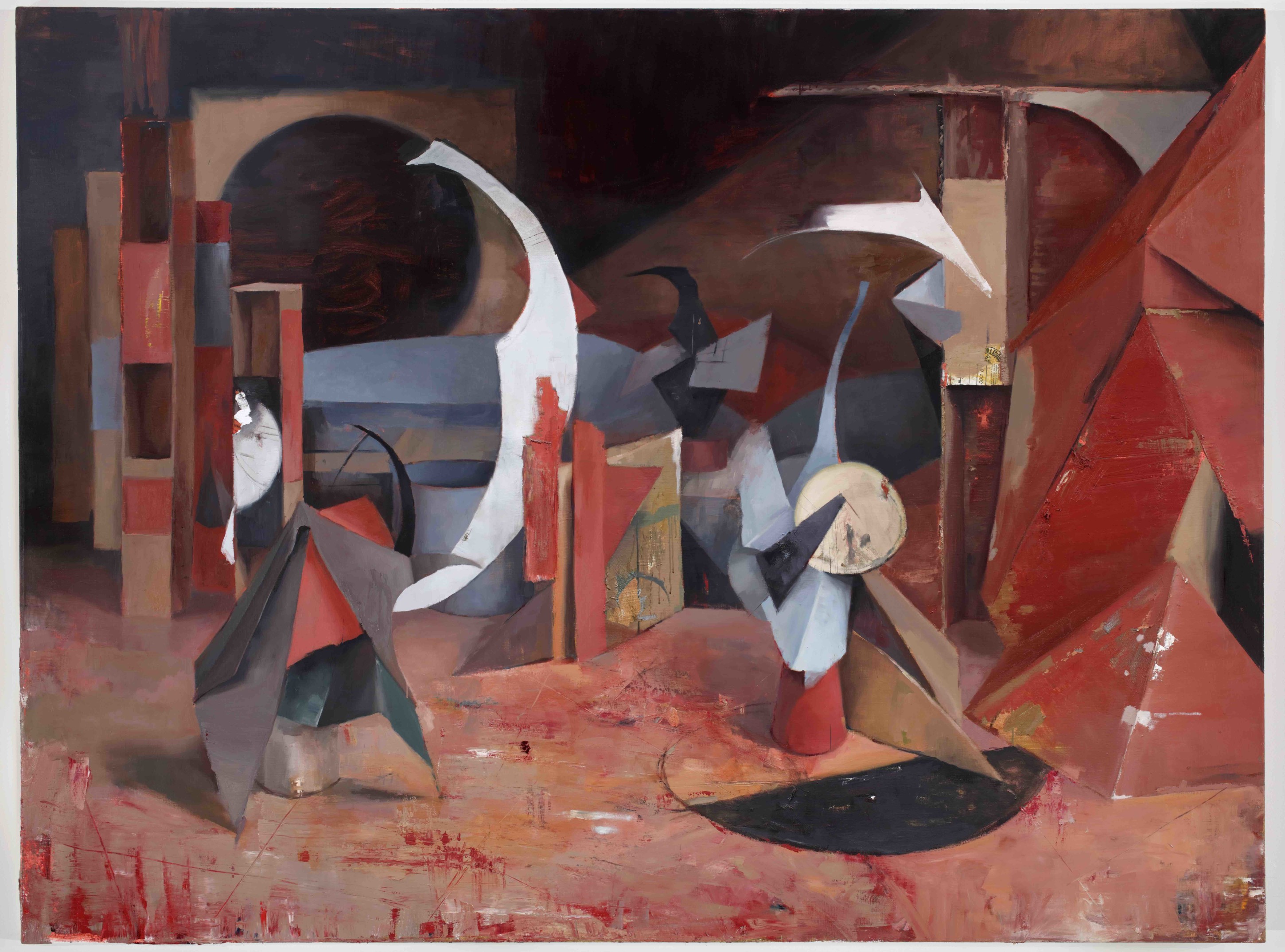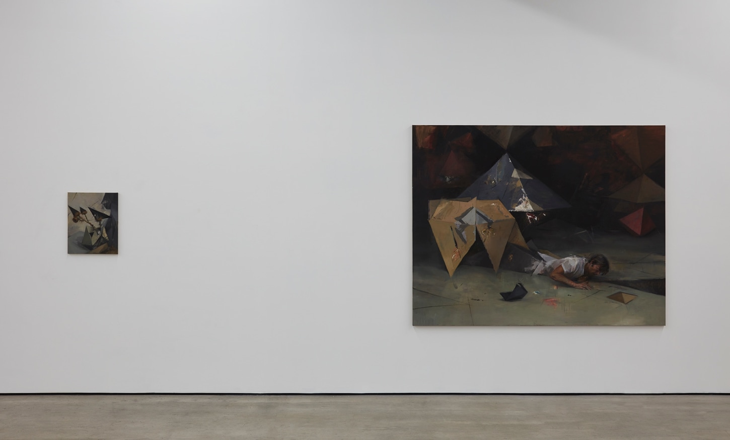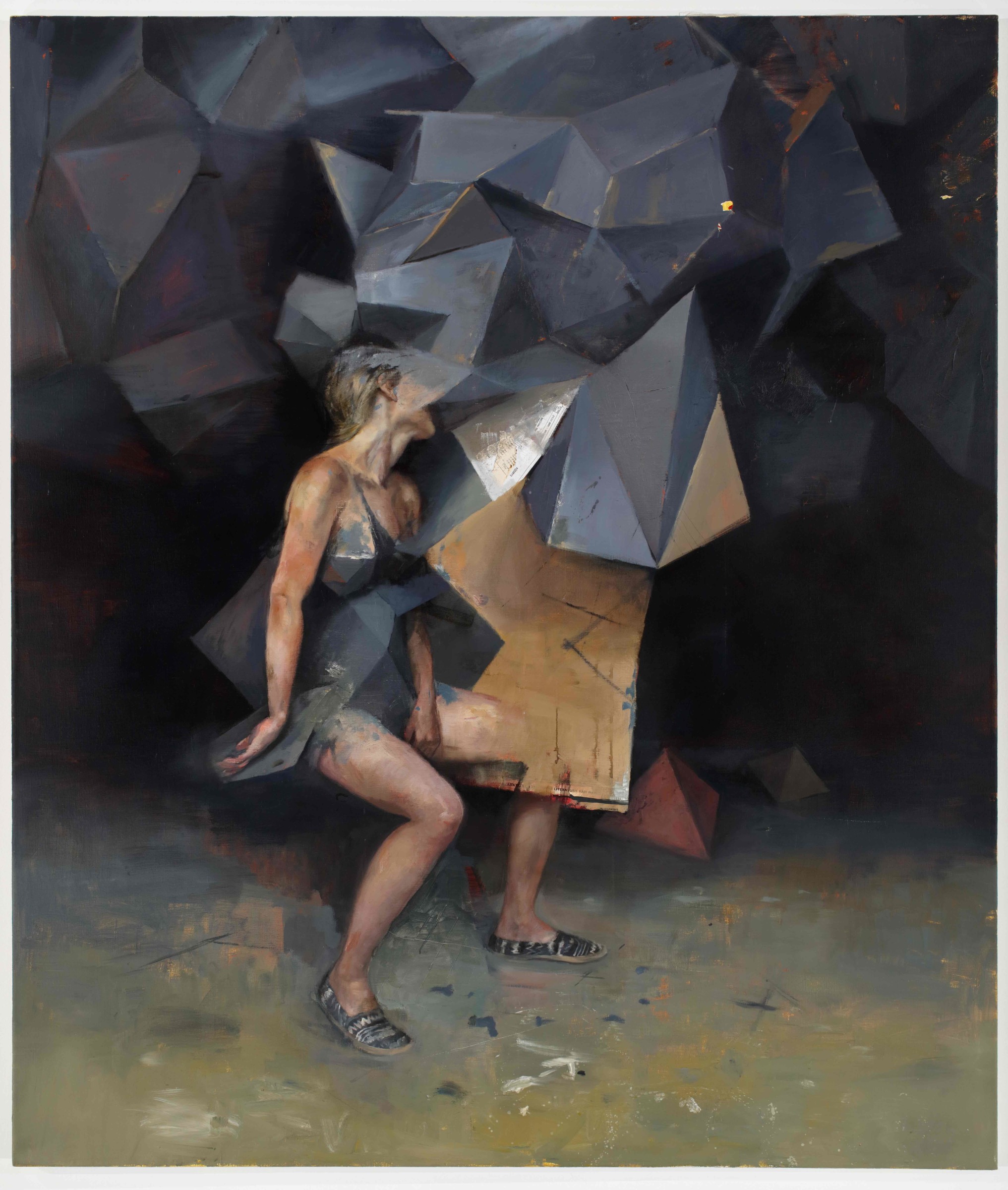 The paintings of Daniel Pitín are firmly holding on to the eternal distinction between light and darkness. Light, dispersed from an invisible and ungraspable source focuses on the surface of the canvas, piercing through it and finding its way around and reflecting through numerous forms folded into the composition of the image somewhere between architecture, scenography and a vivid inner space. The play of light and darkness is thus the key element of formation of the space, its moods and variability seemingly frozen in the static image on the canvas, yet still breathing with fresh inputs coming from its extraneous environment and ocular abilities of its viewers. The given matter, building blocks of the content stays in the constant flux of transfiguration, with shades of approaching light, through the light, as light itself. Pitín is thus touching field of prefigurations of his work, its main referential points in Czech avant-garde photography of František Drtikol, Jaromir Funke or Josef Sudek, in tradition of cubist painting and even deeper in history, as in baroque paintings through the technique of chiaroscuro, based on strong distinctions between tonal variations, therefore conceiving a dramatic, almost theatrical visual feeling.
