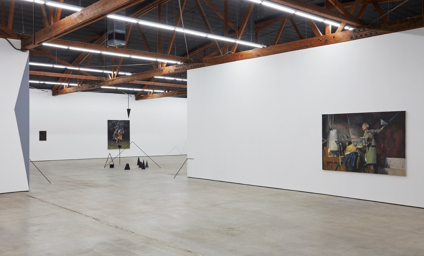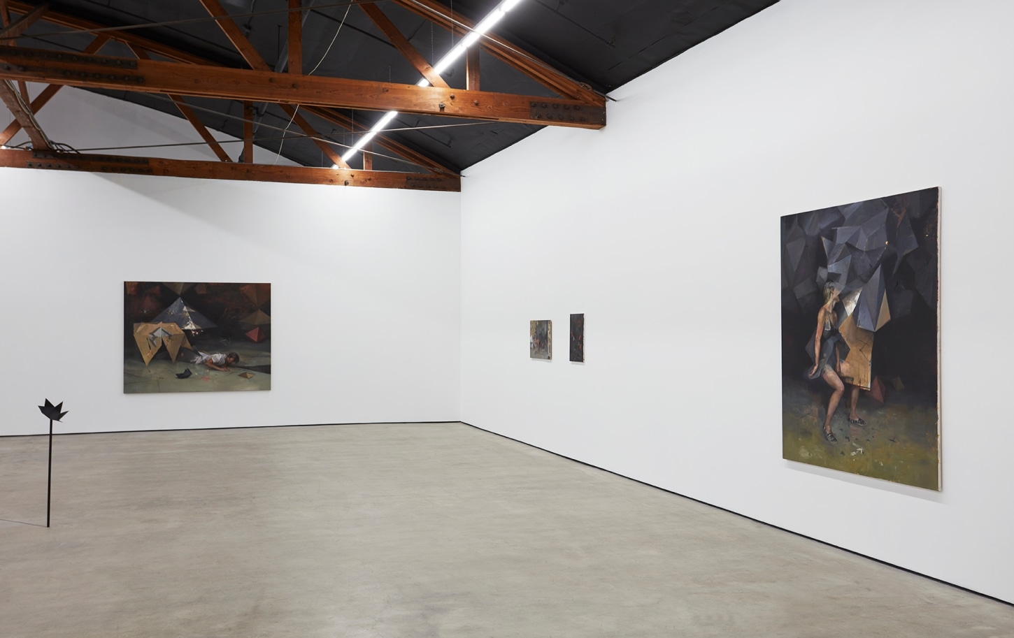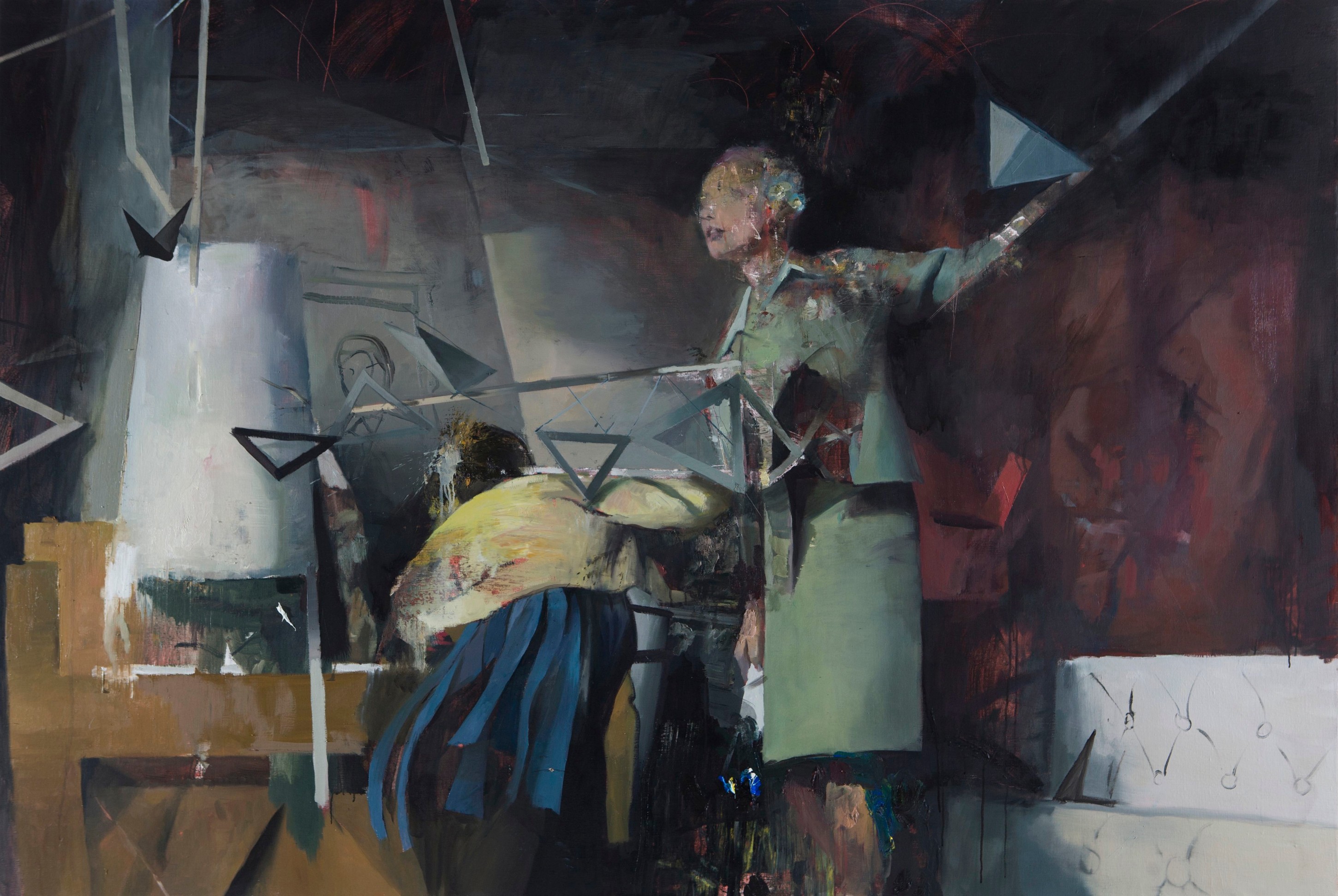 A significant shift in terms of Pitín’s painting technique is the fact that he has been for the first time using real life models for the depiction of figures on his canvases. This shift from the creation of post-representational image out of an already existing representation by the medium of photography or film shows a necessity to emphasize the humanity, its physical presence, its materiality and dimensions. Not only the figures are painted on the bases of real people, also every scenographic or architectural element has its basis in physical precursors. Such a development of painterly attitude demonstrates a certain fatigue from the digitally induced disconnection of our era of the mass virtual reproduction.