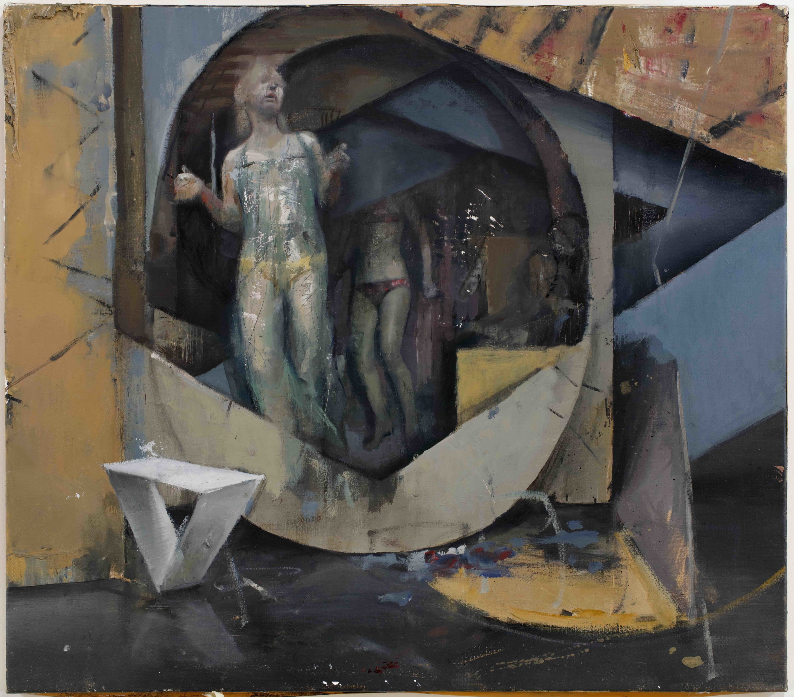 Daniel Pitín (1977, CZ) graduated from the Academy of Fine Arts in Prague in the studio of classical painting and afterwards in the studio of conceptual media. Pitín is creating visually complex paintings with thick imagery and subtle references to canonical art works, architecture and aesthetics of late modernism while using techniques known to history of art from baroque painting to its reconfiguration by the language of avant-garde movements of the early 20th century. The dark scale of his palette, etheric figures and surreal structures, which are simultaneously hiding and revealing its actors is filling his oeuvre with moodiness and a breath of unsaid contents. He describes his paintings as fragments of narratives and dreams through which he explores the “personal and collective memory of known places”. Principles formulating his painterly work are also manifested through the media of collage, video and film, found material playing an essential role in this process, encompassing the family archive and as well as internet sources, same as historic film material, specifically with references to the work of Alfred Hitchcock, film noir and Czech new wave films from 60s. His interest shifts in between the humanity and its creation, between structures and their content.