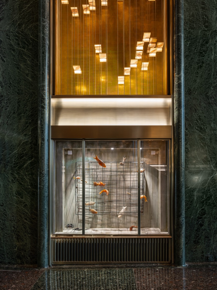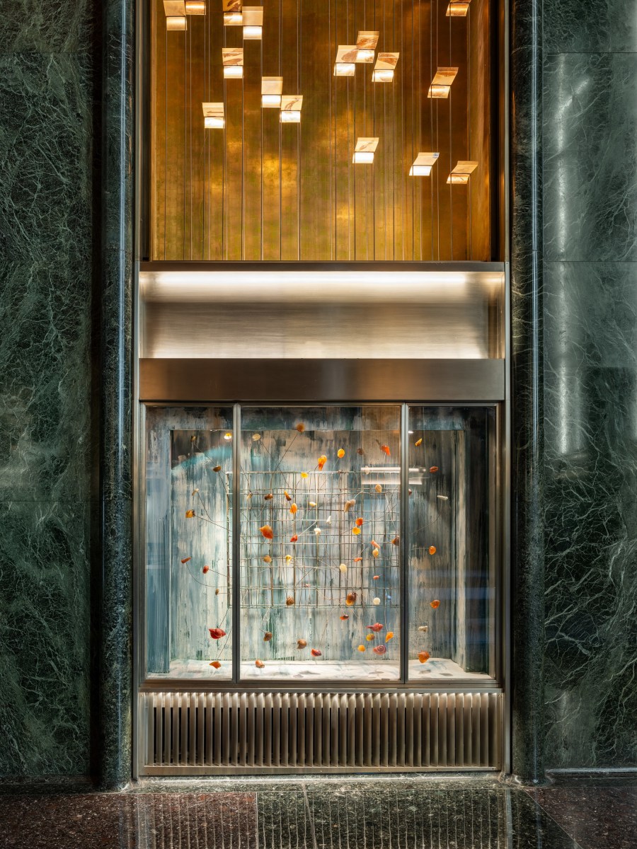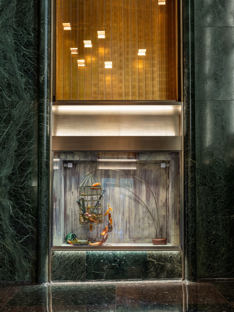 The vitrine spaces at 45 Rockefeller Plaza showcase three sculptural installations. Interwoven within the artworks are recurring motifs of floraand persistent thematic elements central to Fung's artistic explorations. These elements collectively narrate a tale of voyaging through uncharted territories, from the depths of an ocean dark as the night, through troubled waters washing softly onto the shores of a land of infinite possibilities.