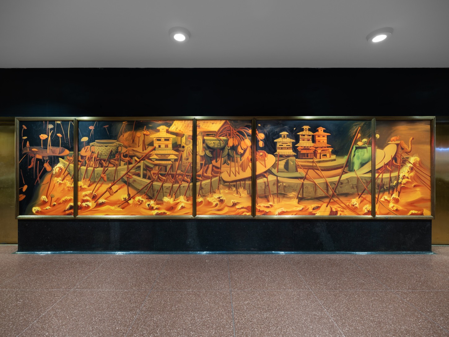 As a focal point of her Art in Focus commission for Art Production Fund and Rockefeller Center, Dominique Fung imagined an all-encompassing yet open-ended epic odyssey. Located at the concourse of 45 Rockefeller Plaza, traditionally painted scrolls unfold to tell a story otherwise ungraspable as a whole. Spanning 125ft in length and created in the studio as a single multi-panel painting at ⅔ scale, the scene creates a connection between the palpable physical place in which it lives and the ethereal subconscious plane it unfolds for its viewer. Instilled with life, artifacts from the Shang and Tang Dynasties meet Ama women and quaint fishing figures in abstracted landscapes of seashell flowers, tree corals, and wide-casting nets.