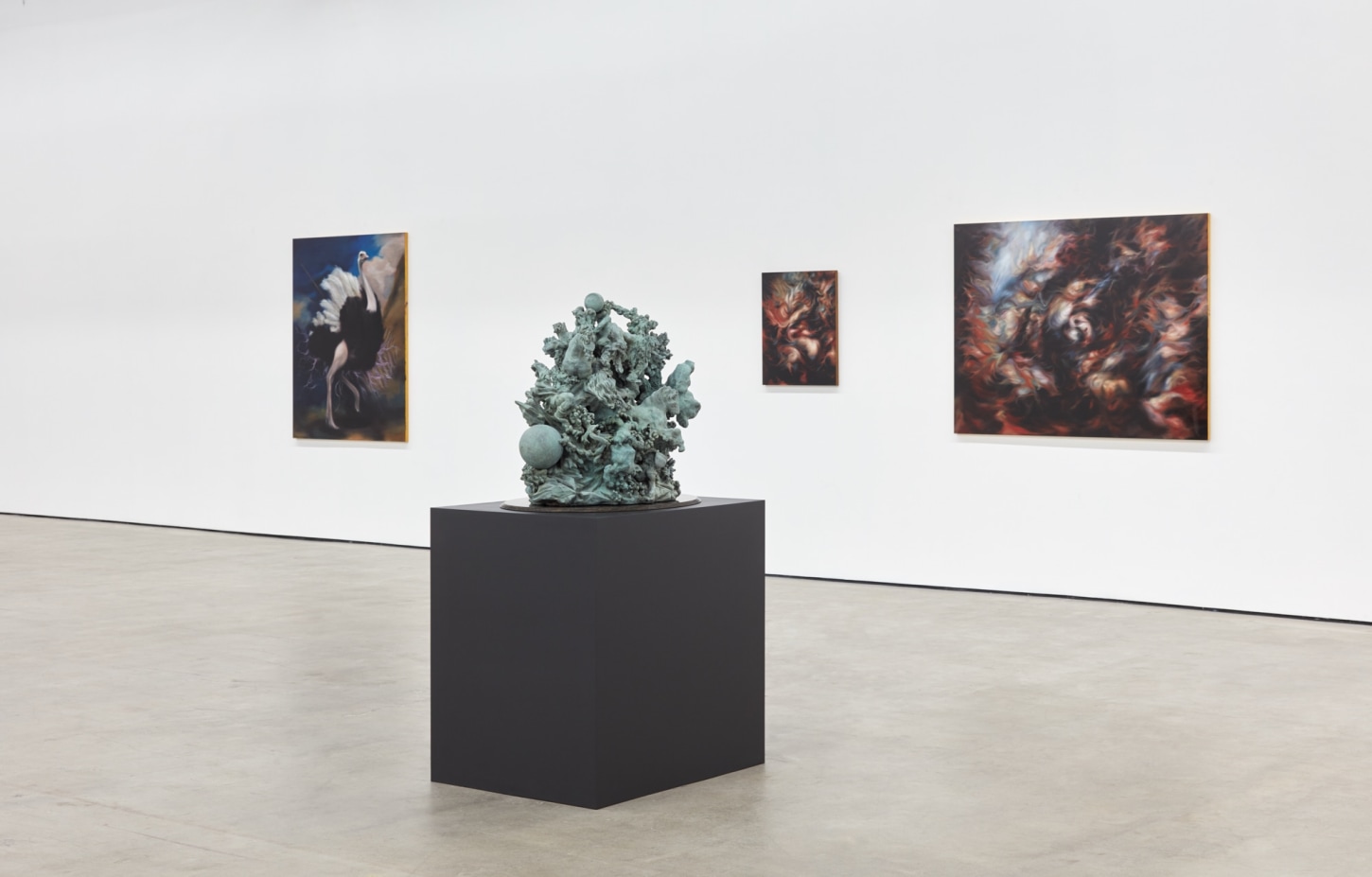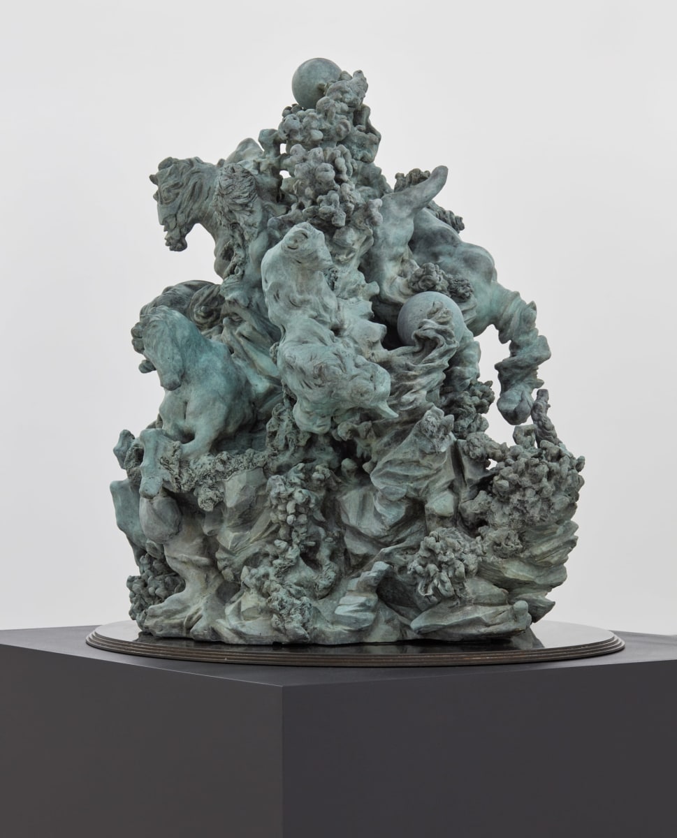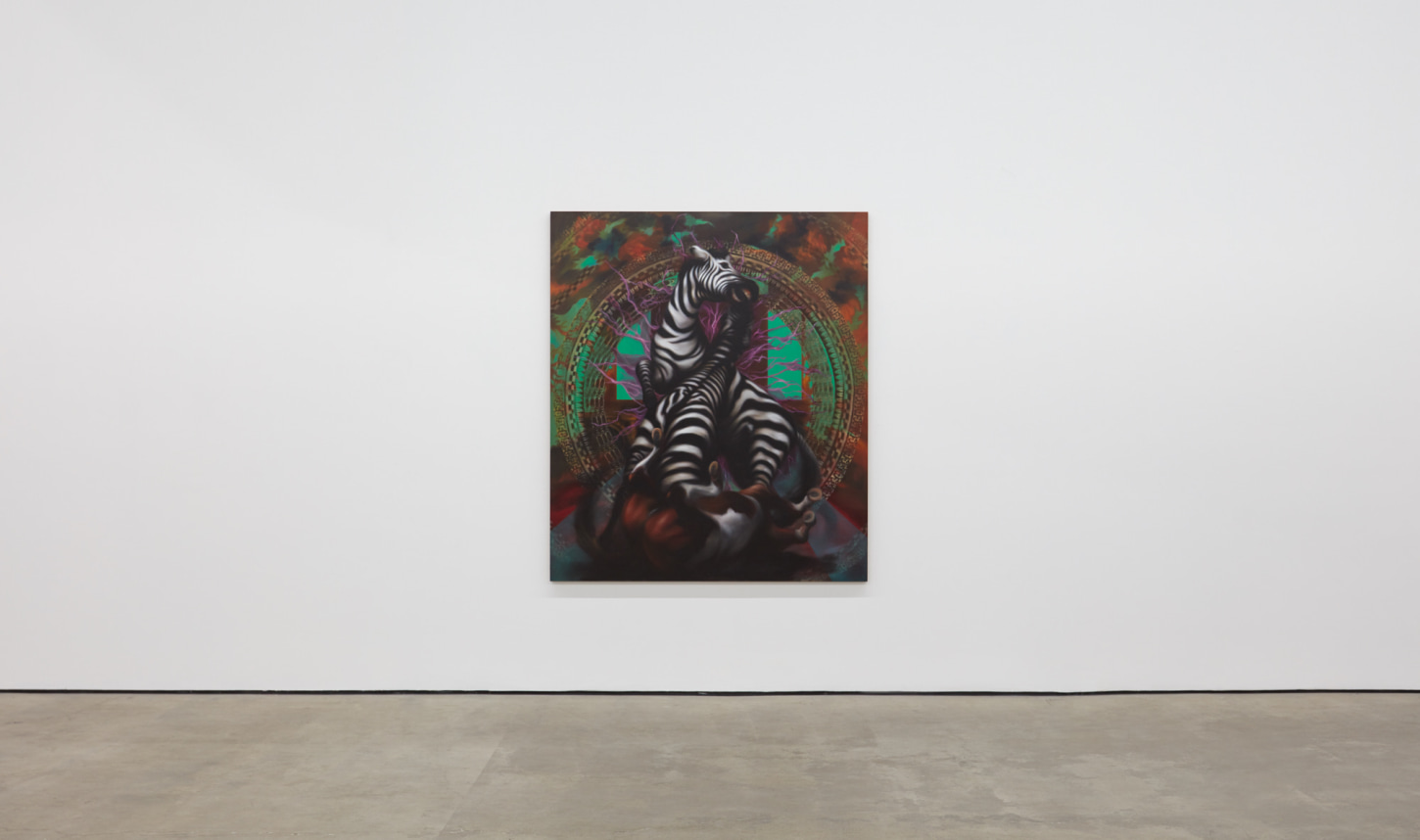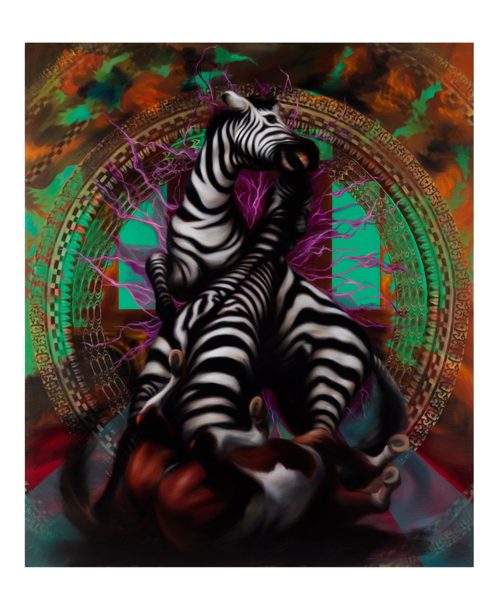 To Hugo Wilson, animals are mirrors of human consciousness. We project our desires, hopes, and impulses onto the animal, and the animal reflects, refracts, and hurls them back to us. Unlike the Old Masters he references in his paintings and bronzes, however—George Stubbs, Peter Paul Rubens, Nicolas Poussin—Wilson’s menagerie is not beneath the human on the food chain or emblematic of the love of Christ. These creatures are Gods themselves, emerging from turbulent clouds of divine ether, meme warfare, and YouTube clips with agendas all their own, radiating their sentience in neon geometric yantras.