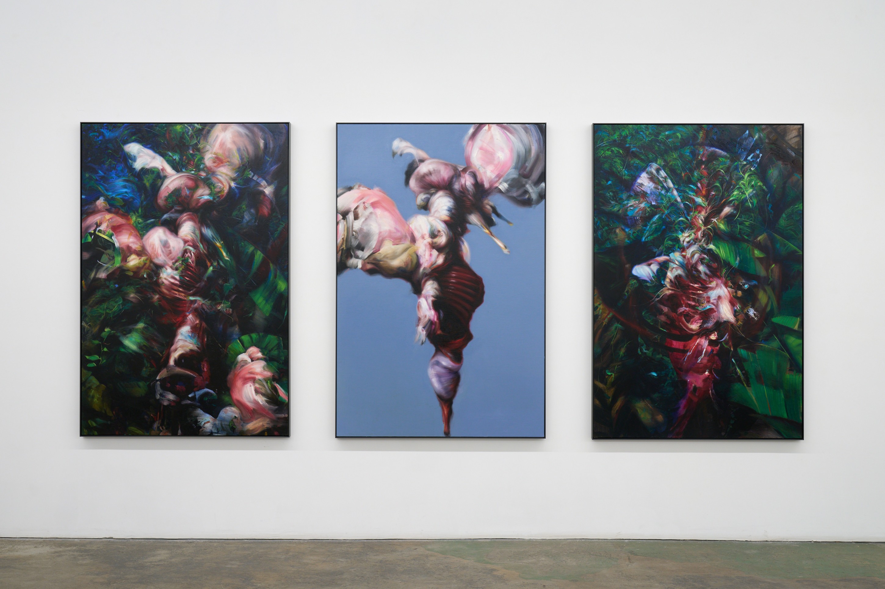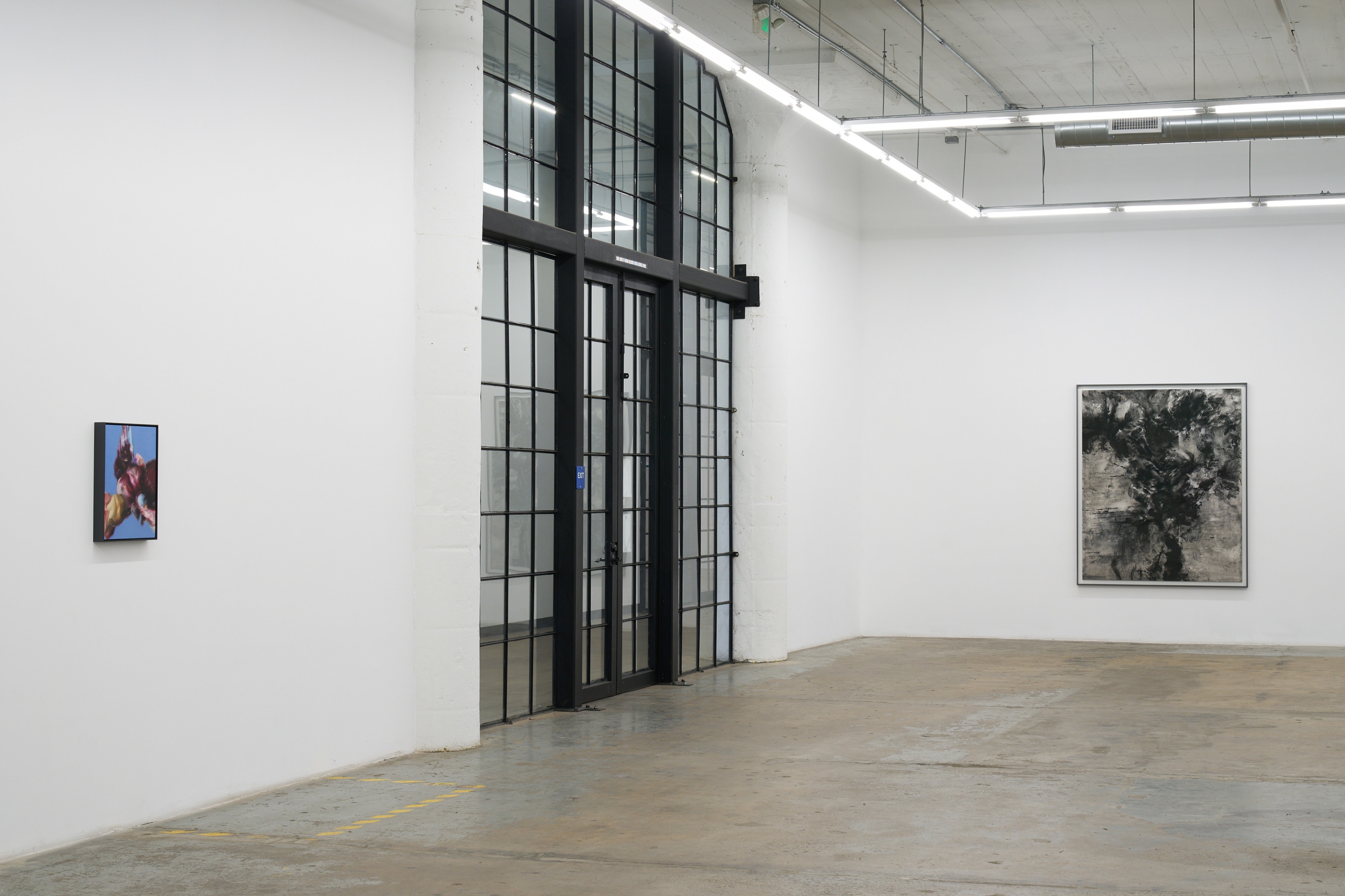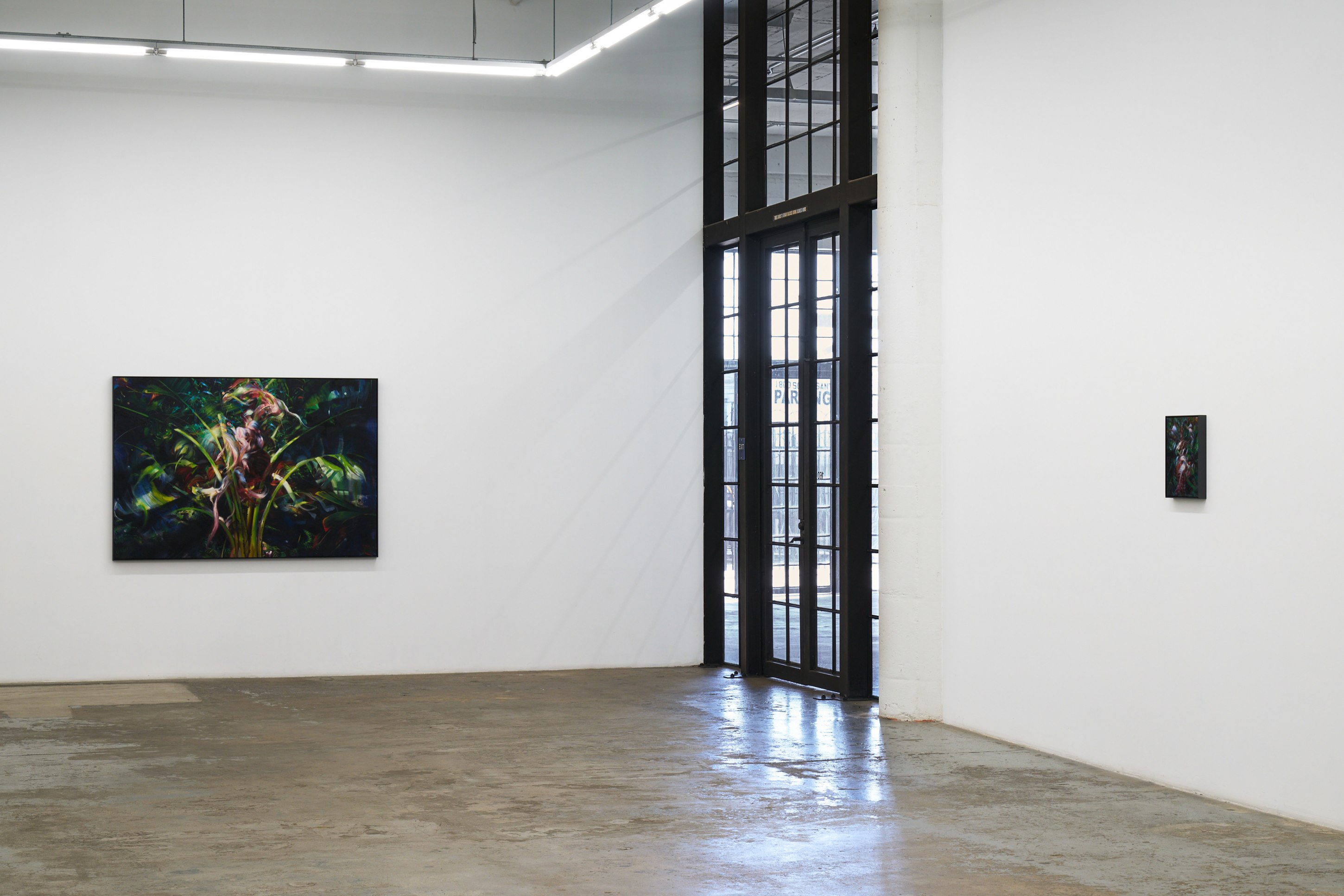 Carnal Agreement, Hugo Wilson’s third solo exhibition with Nicodim, views the cycle of life, death, and everything before and after in a spiritual vacuum. This body of work actively undermines hierarchies implemented by one’s tribal affiliation, choice of newspapers, and other carnal agreements initiated prior to conception by geographic and socio-political constructions. Within Wilson’s three large-scale works on paper, black-and-white monoprint massaged by ink, charcoal, and watercolor pastel gives rise to parallel galaxies completely untethered from predetermination. His canvases discover organic bodies in vibrant color: “Carnal Agreement 2,” 2021, is a big bang of open possibility with feathers, fern, and other night fruits finding form; “Carnal Agreement 3,” 2021, is a tsunami of meat and flesh either stripped from the bone or affixing itself to a central ribcage as it awaits divination; “Figment,” 2022, offers a window to a reality in which imagined composites of vanished, sinister avian species are very much alive and well. The viewer is divorced from their body, omnipresent and nowhere in a panopticon with a vantage point that stretches mega-annum. Each piece is a portal beyond the violent carnal agreements that dictate existence as we understand it.