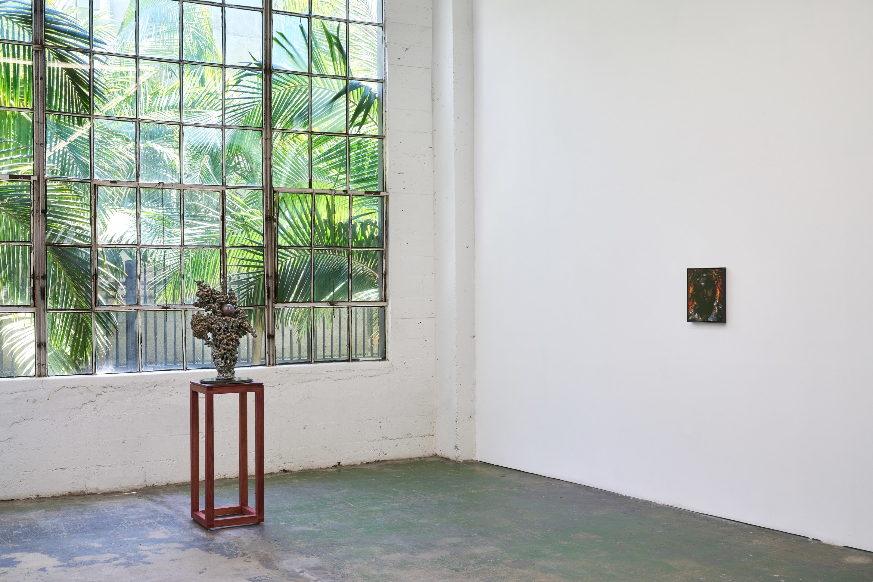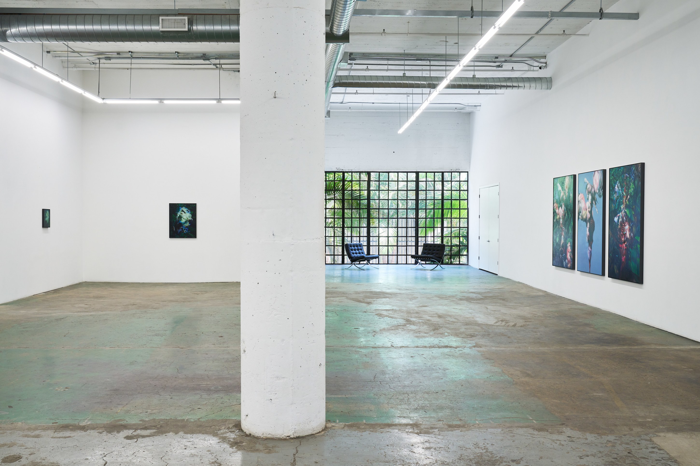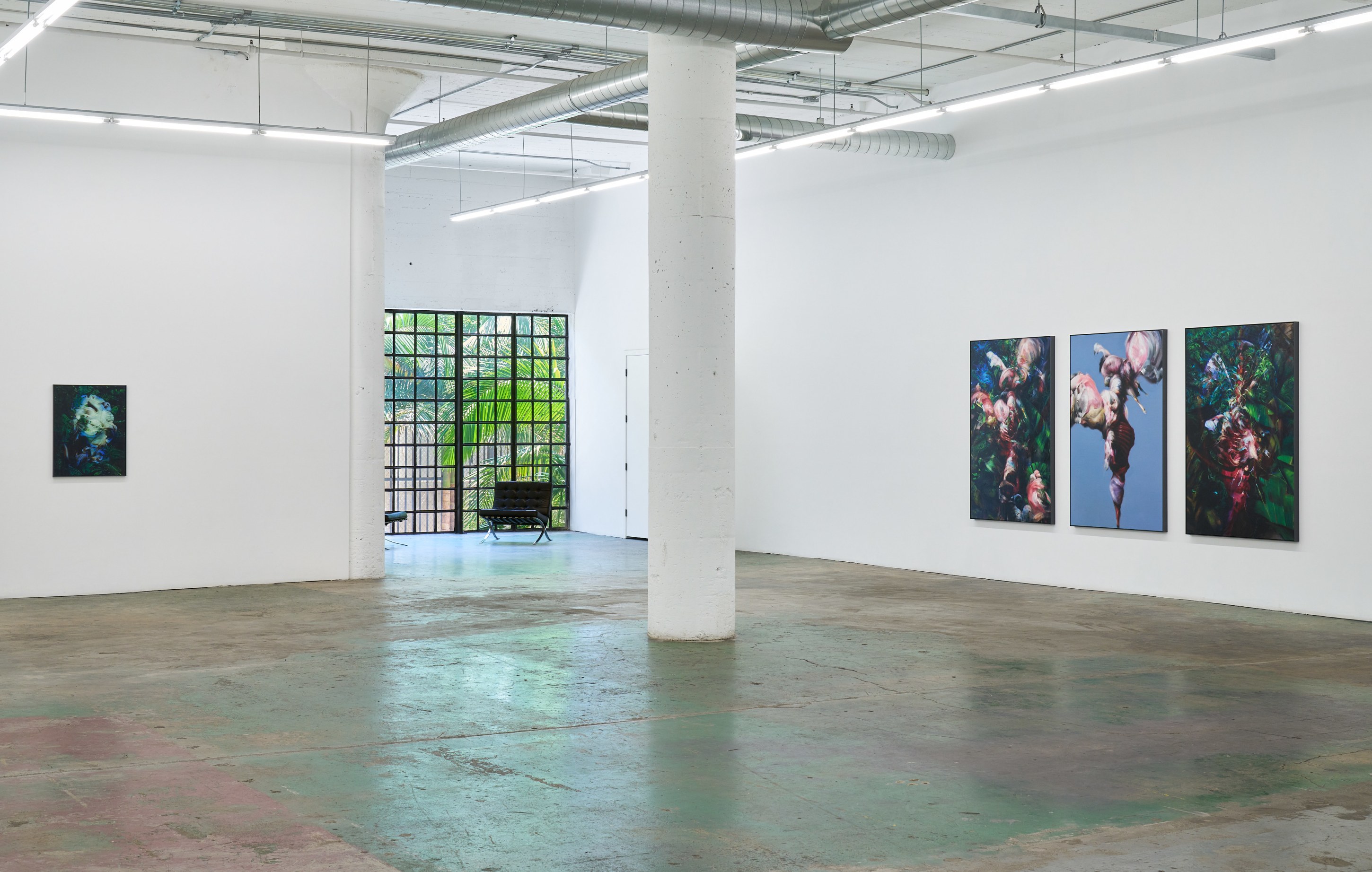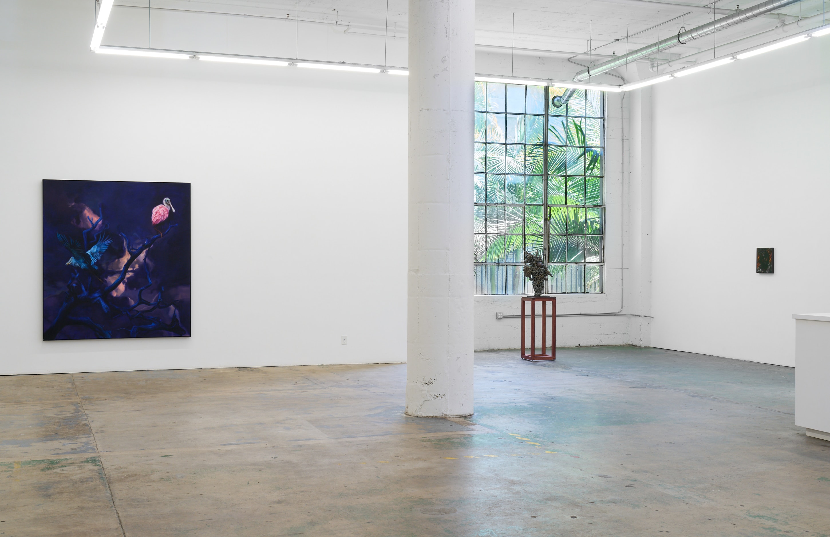 Carnal Agreement, Hugo Wilson’s third solo exhibition with Nicodim, views the cycle of life, death, and everything before and after in a spiritual vacuum. This body of work actively undermines hierarchies implemented by one’s tribal affiliation, choice of newspapers, and other carnal agreements initiated prior to conception by geographic and socio-political constructions. Within Wilson’s three large-scale works on paper, black-and-white monoprint massaged by ink, charcoal, and watercolor pastel gives rise to parallel galaxies completely untethered from predetermination. His canvases discover organic bodies in vibrant color: “Carnal Agreement 2,” 2021, is a big bang of open possibility with feathers, fern, and other night fruits finding form; “Carnal Agreement 3,” 2021, is a tsunami of meat and flesh either stripped from the bone or affixing itself to a central ribcage as it awaits divination; “Figment,” 2022, offers a window to a reality in which imagined composites of vanished, sinister avian species are very much alive and well. The viewer is divorced from their body, omnipresent and nowhere in a panopticon with a vantage point that stretches mega-annum. Each piece is a portal beyond the violent carnal agreements that dictate existence as we understand it.