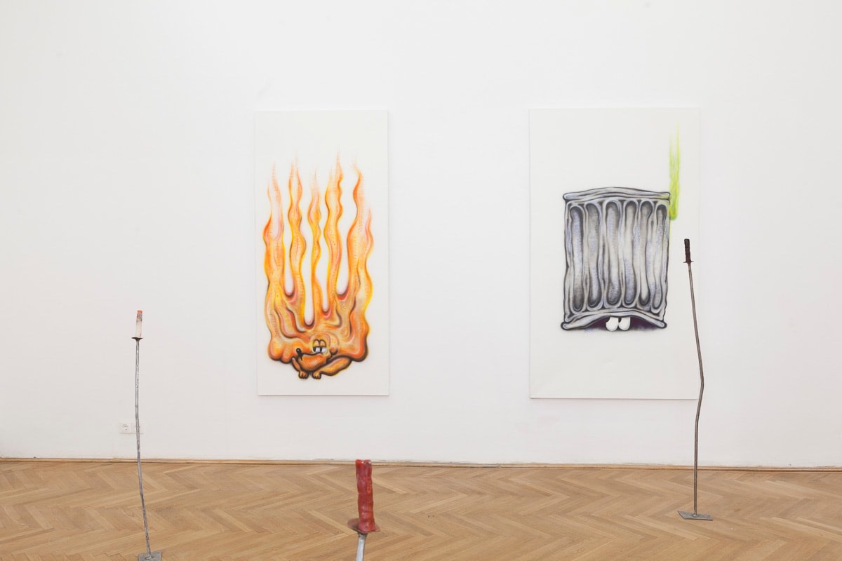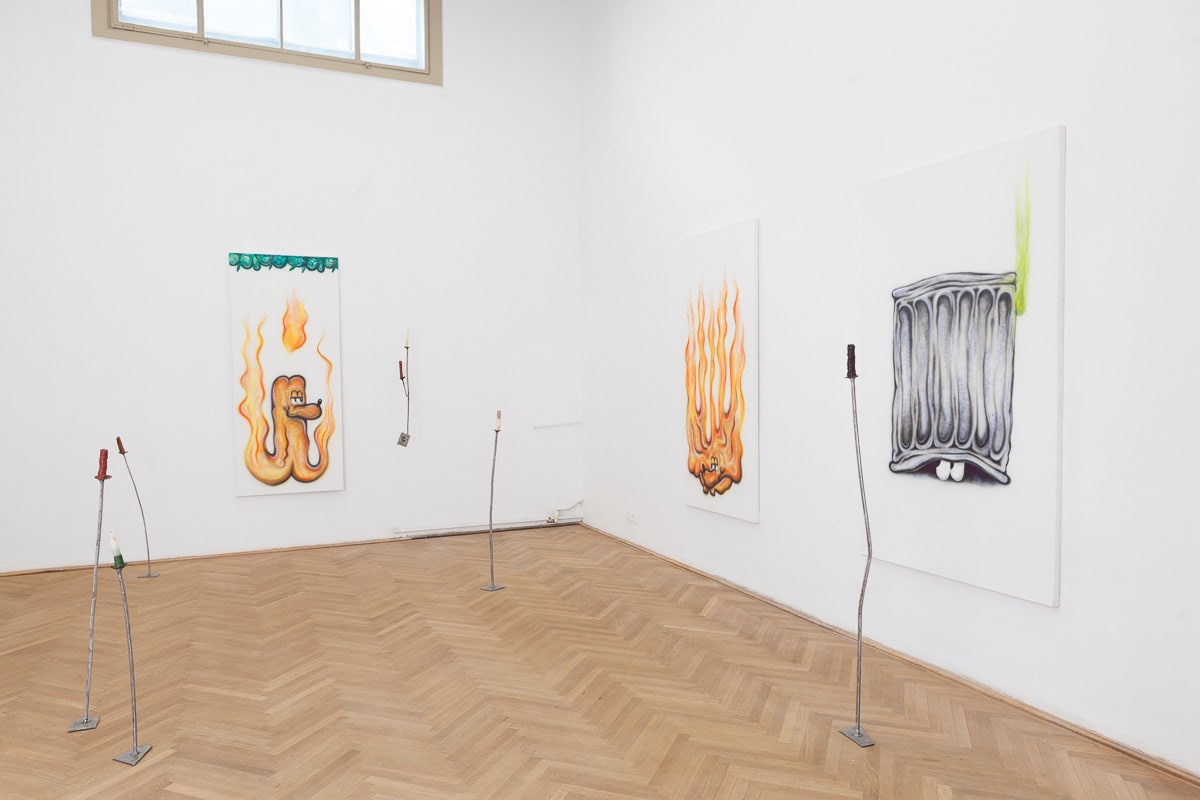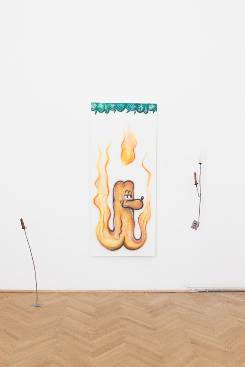 Rathbone’s somatic figurations leap from canvas and cloth to flame and text, medium-hopping hobos never fully at home in any medium. His cosmology of characters refuse the confines of narrative and slough pretense of meaning in favor of absolute presence, junking up the ur-space of the canvas with toxic skins and flaming locks.