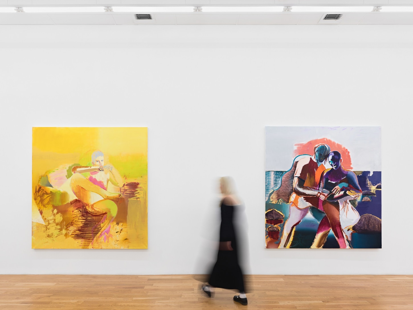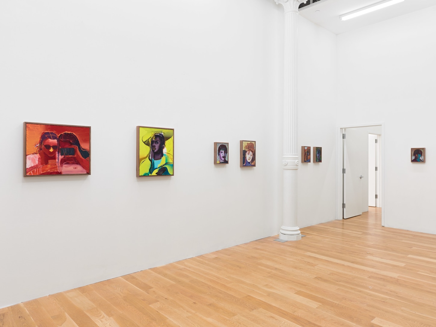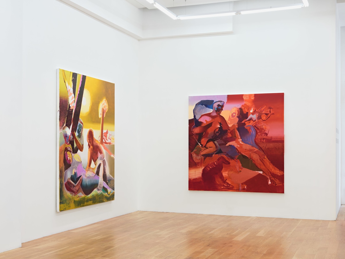 In Prayers, Divinations, Katherina Olschbaur’s fourth solo exhibition with Nicodim, the Austrian-born Los Angeles-based artist combines small portraits with large-scale paintings in her signature surrealist oeuvre, blending figuration and abstraction with sweeping gestural marks. Her drawings, though never included in an exhibition, are integral to Olschbaur’s practice, and form the backdrop of her fascination with Renaissance and Baroque-style paintings where themes of religious authority often take center stage. Leaning towards the freedom found in rebellion, she recenters our gaze giving grace and reverence to her figures. Colorful sketches reveal illuminating compositions in luscious oils. Abstract bodies leap off canvases and traverse into dark shadows in a series of electrifying hues. An ensemble of worlds collides where figures blend and reemerge in faraway landscapes only to be unearthed in the recesses of vivid imaginings. The narratives of each work are open ended suggesting layers of memory, lapses in time, and fleeting moments recaptured.