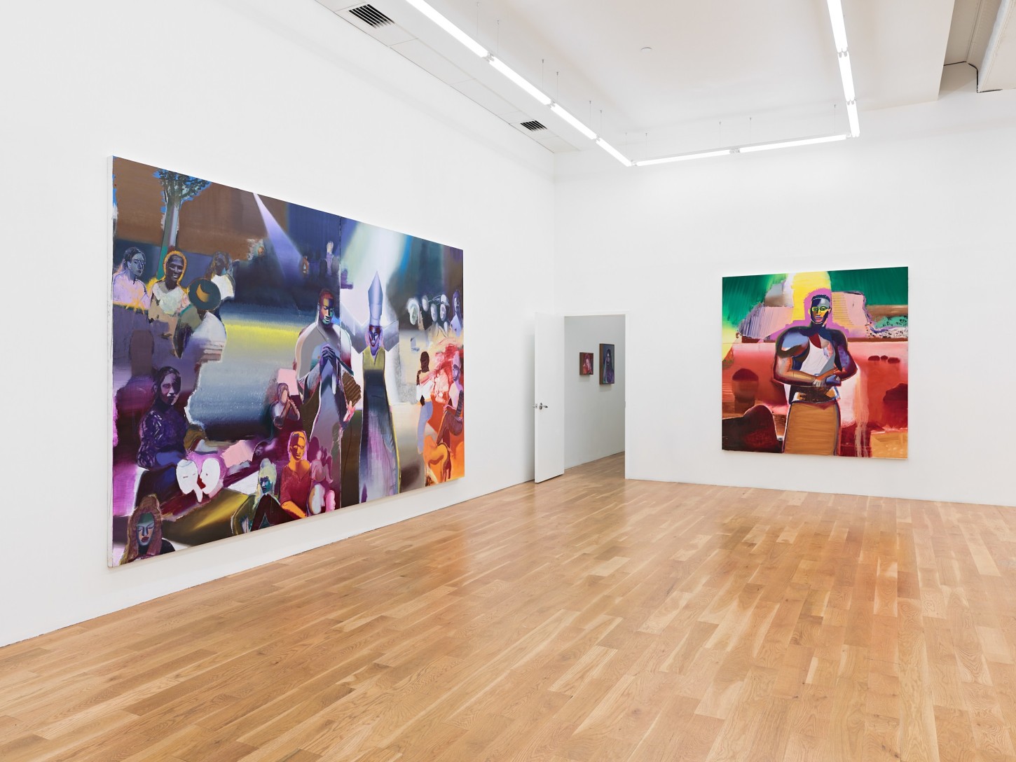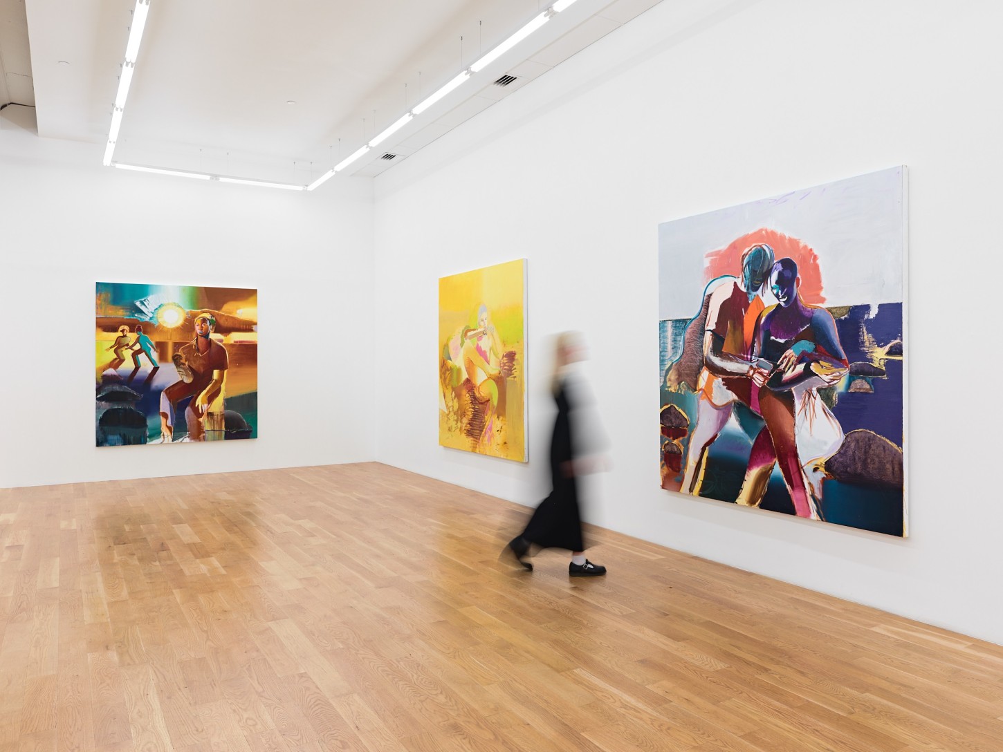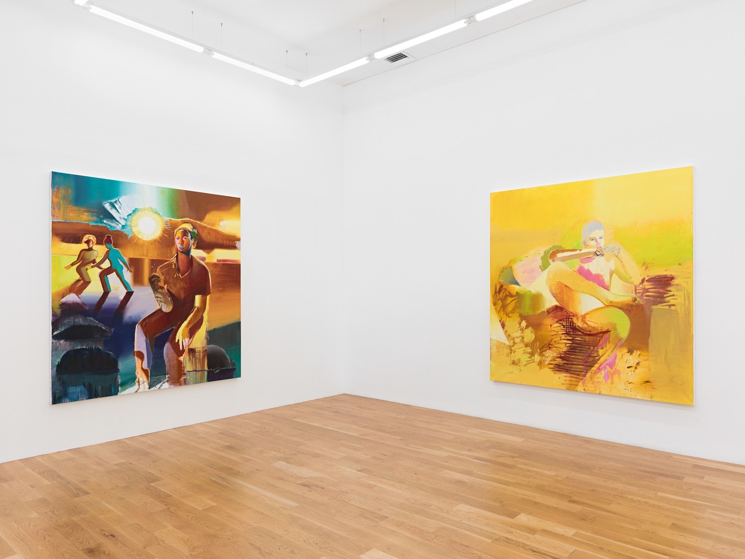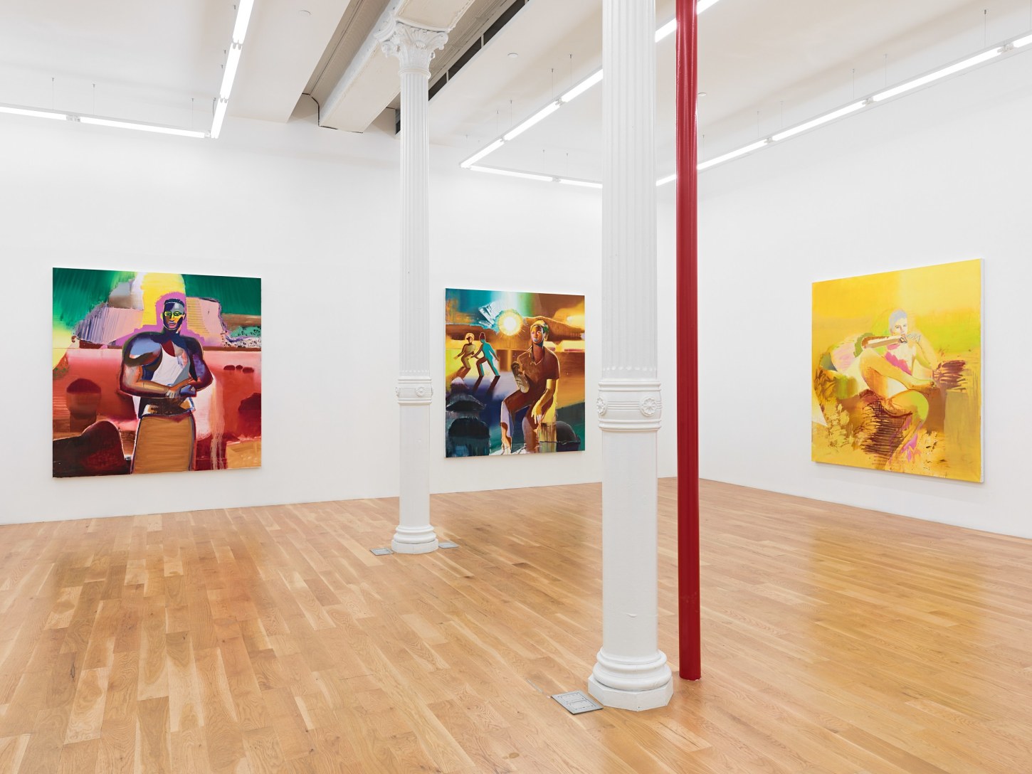 In Prayers, Divinations, Katherina Olschbaur’s fourth solo exhibition with Nicodim, the Austrian-born Los Angeles-based artist combines small portraits with large-scale paintings in her signature surrealist oeuvre, blending figuration and abstraction with sweeping gestural marks. Her drawings, though never included in an exhibition, are integral to Olschbaur’s practice, and form the backdrop of her fascination with Renaissance and Baroque-style paintings where themes of religious authority often take center stage. Leaning towards the freedom found in rebellion, she recenters our gaze giving grace and reverence to her figures. Colorful sketches reveal illuminating compositions in luscious oils. Abstract bodies leap off canvases and traverse into dark shadows in a series of electrifying hues. An ensemble of worlds collides where figures blend and reemerge in faraway landscapes only to be unearthed in the recesses of vivid imaginings. The narratives of each work are open ended suggesting layers of memory, lapses in time, and fleeting moments recaptured.