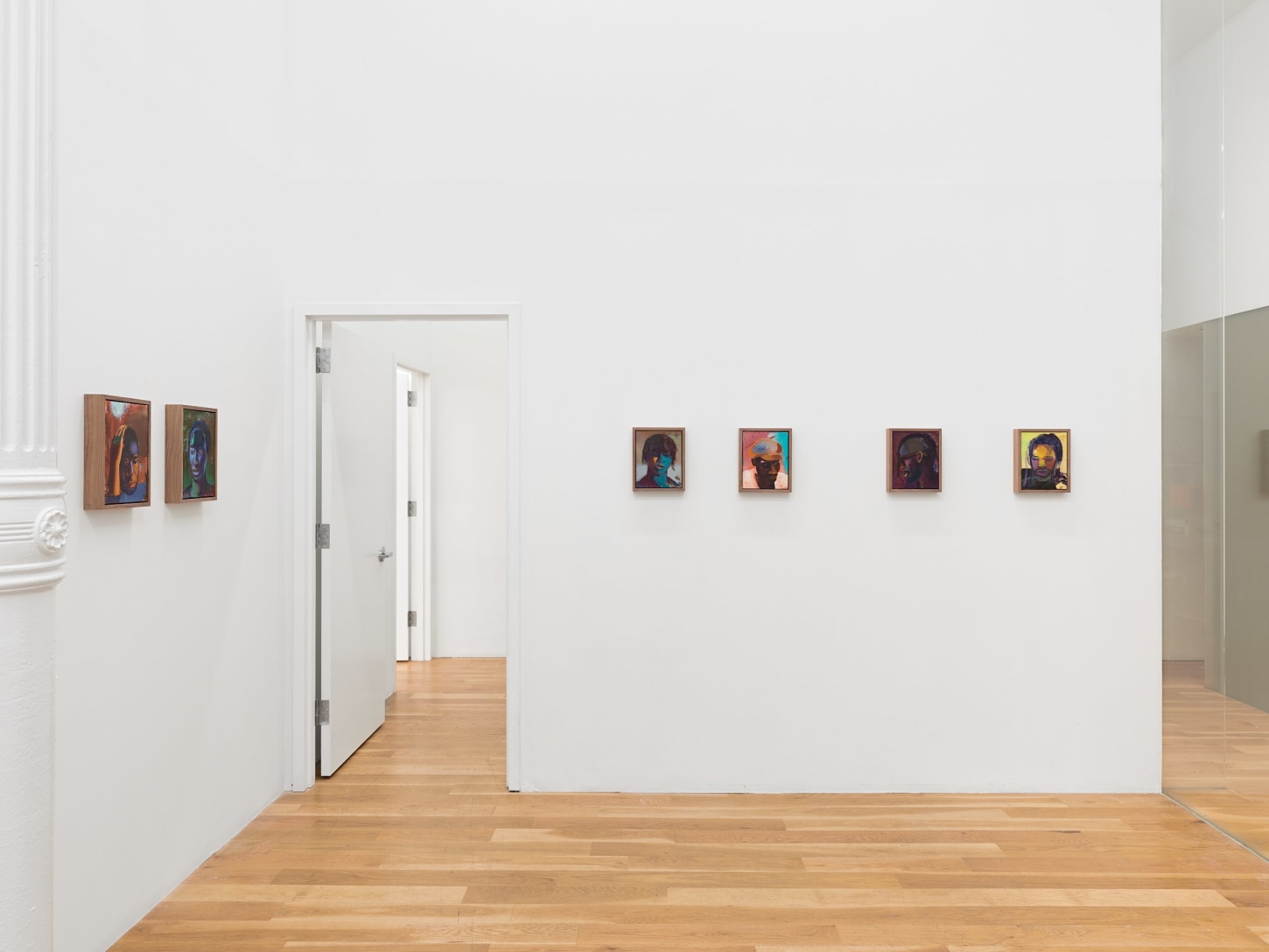 Lay down, beloved (2022), depicts three figures in the foreground and two smaller bodies lying close together farther afield. It’s a mythical scene where the emotionality of rich colors hurdles off the canvas and jumps out toward the viewer. The woman in the foreground is flanked by two male sisters who discover her sleeping body under the shadow of a tree. Is she dying, or has she already transitioned? Since her grandmother passed on the last day of her 2021 residency at Black Rock in Dakar, Senegal, Olschbaur has been captivated by notions of death and the transition of life. Portraiture, place, and the ever-present gaze are explored throughout Prayers, Divinations. Deeply rooted in her personal experiences over the last two years the works presented are at once intimate and formal, questioning notions of selfhood and the responsibility of the artist when depicting someone else. For Olschbaur, portraiture is the ultimate prayer and in this exhibition, with which she begs a most pressing question: How can I capture the spirit of another person?