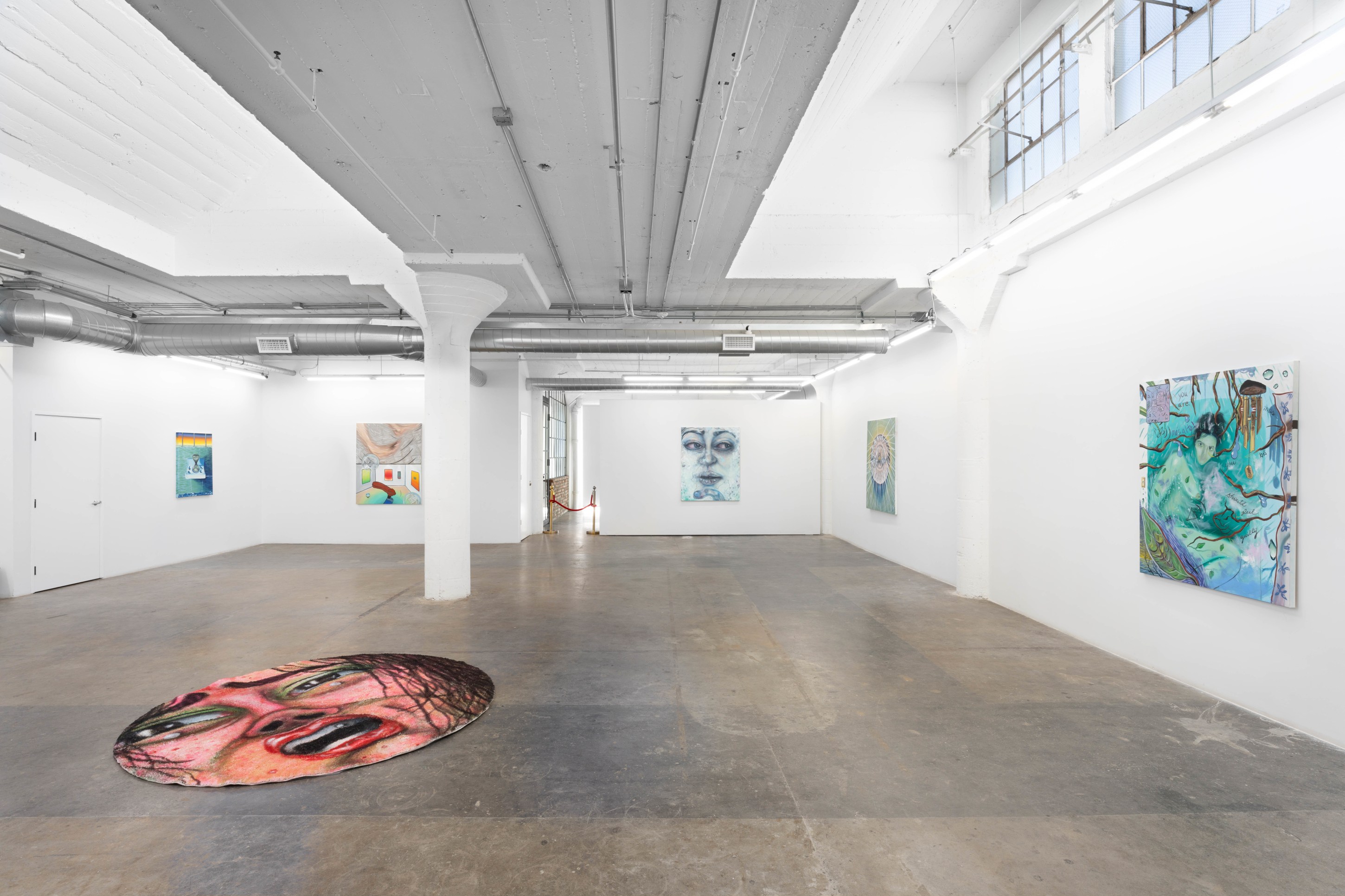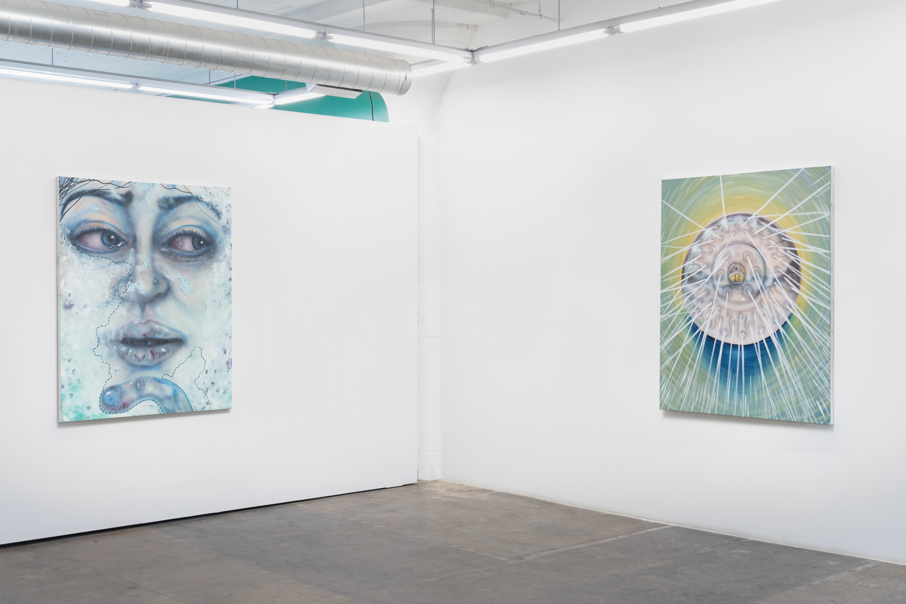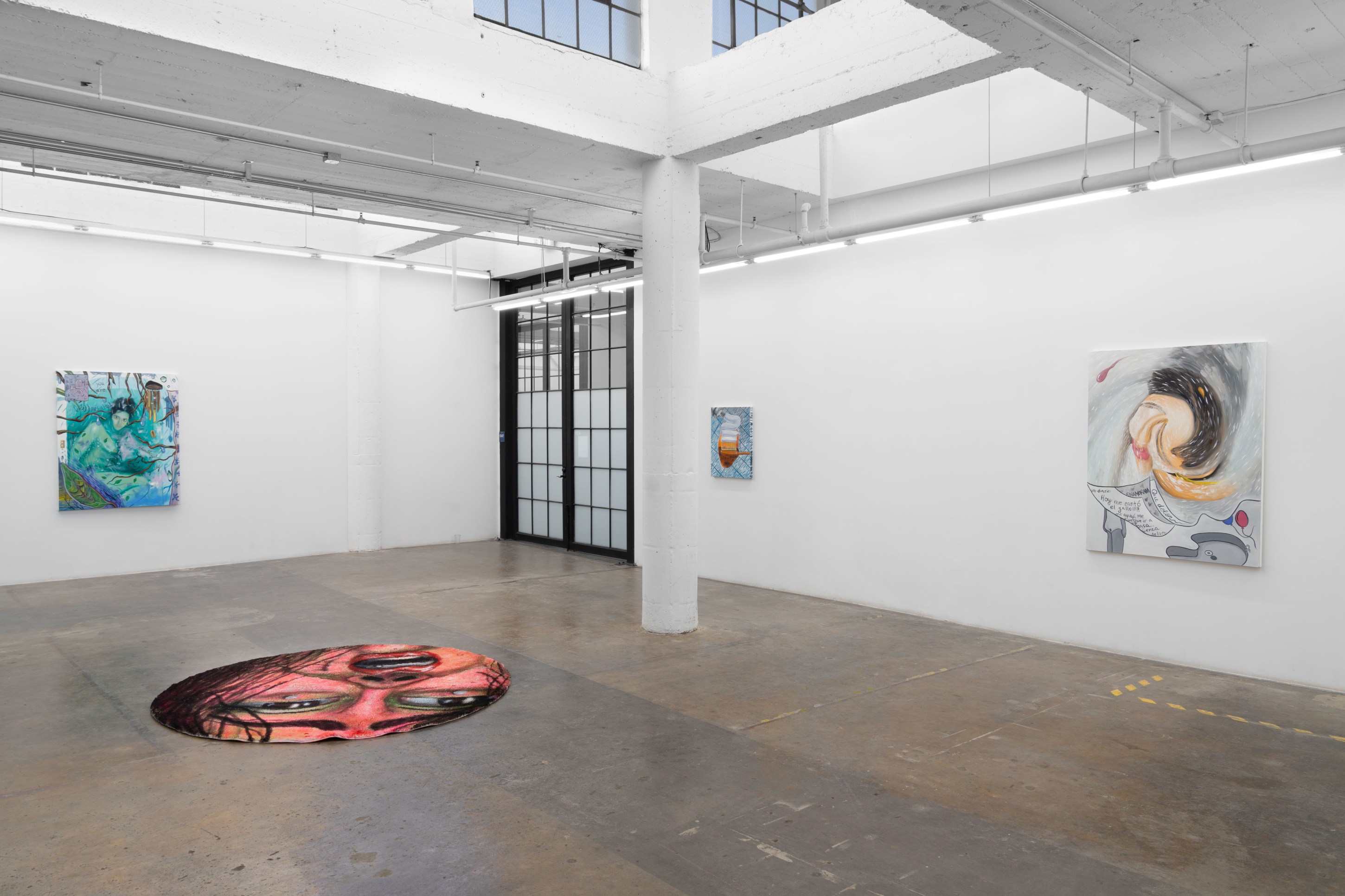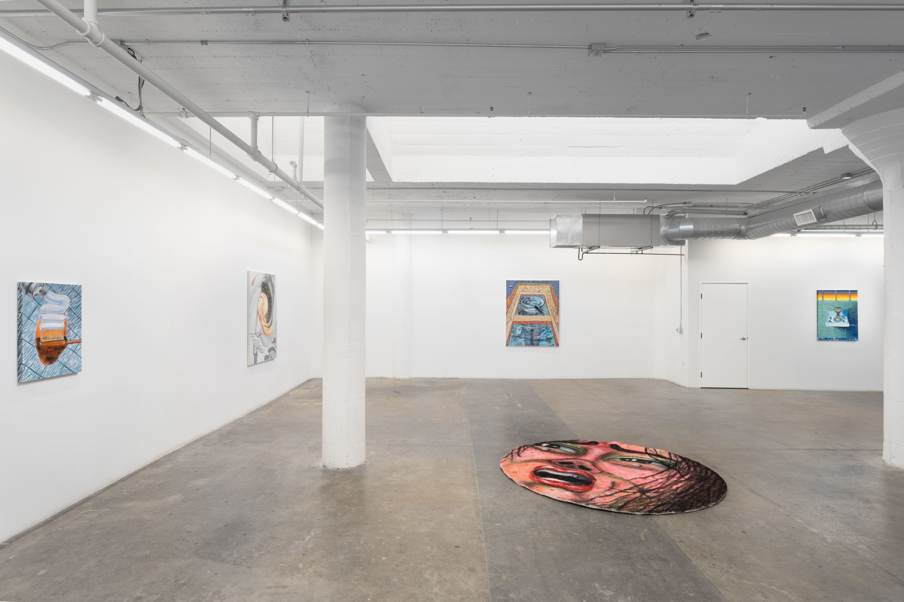 Las bellas no sufren (Pretty ones don’t suffer) is the artist’s first experimentation with textile. In this case, De Jesús Negrón paints a blemished, strained face on a round polyester rug, using her now-recognizable spray paint technique. This reference to domesticity physically centers viewers in the exhibition, marking the importance of one’s interior life. Returning to notions of the home was integral to the process of creating these works. In looking to the minutiae of her physical space, the artist uncovered new ways to deepen her relationship to her practice, privileging deliberate introspection over unchecked momentum. The universality of the themes underpinning Eso Pasa is a cohering force in the exhibition. De Jesús Negrón’s investigations into temporality and the preoccupation with forward motion tells a story not unique to the artist’s experience, but nevertheless grounded by her characteristic style that blends a dream-like whimsy with more sinister implications.