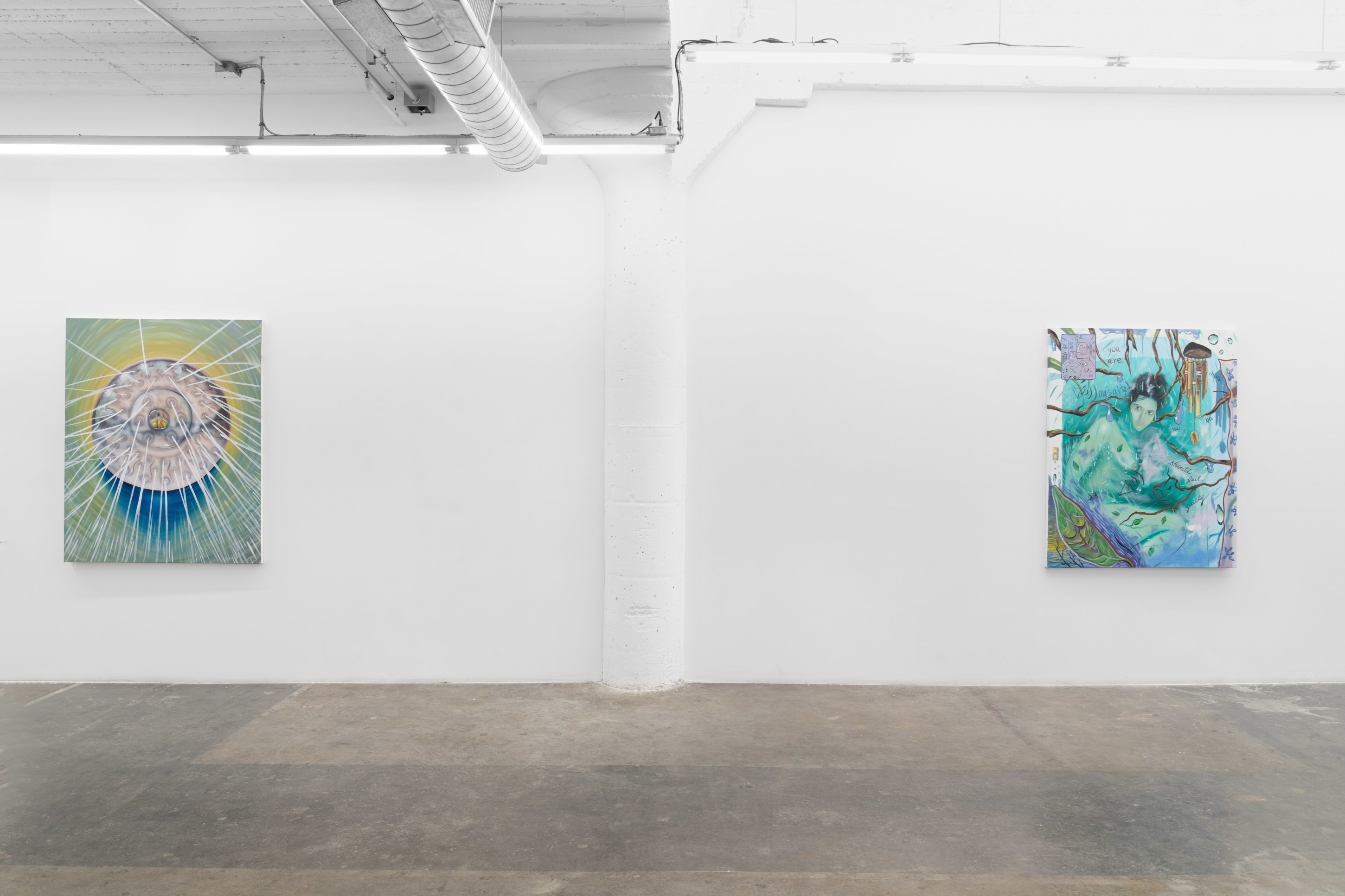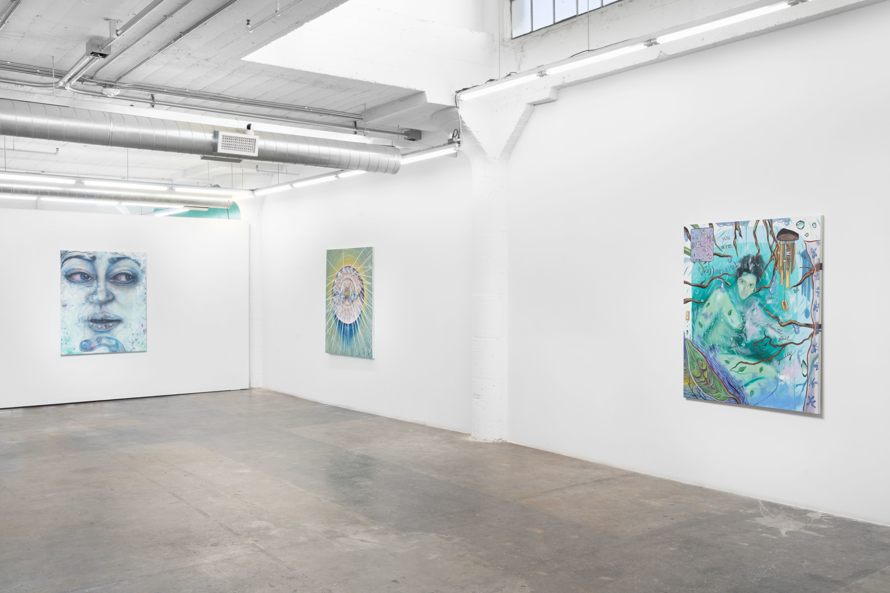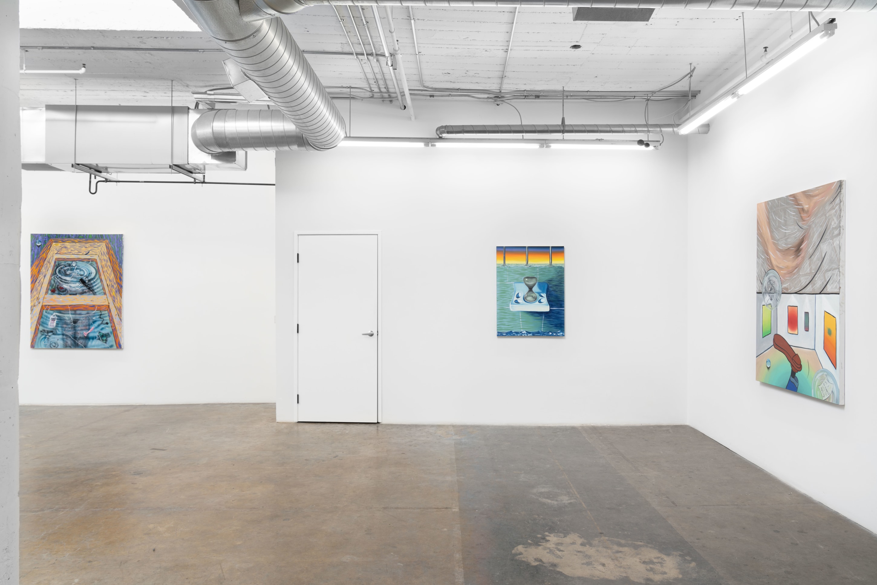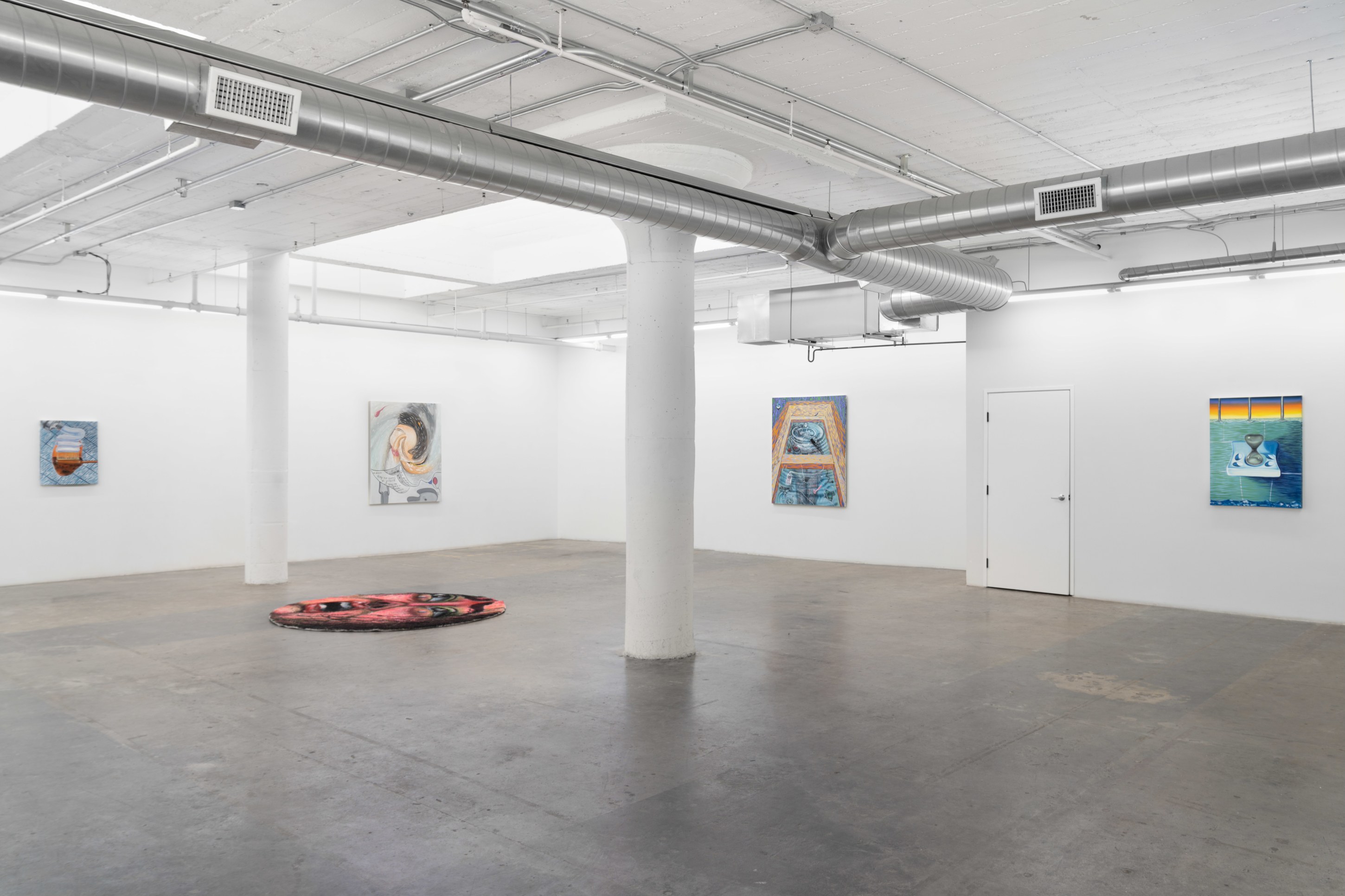 Las bellas no sufren (Pretty ones don’t suffer) is the artist’s first experimentation with textile. In this case, De Jesús Negrón paints a blemished, strained face on a round polyester rug, using her now-recognizable spray paint technique. This reference to domesticity physically centers viewers in the exhibition, marking the importance of one’s interior life. Returning to notions of the home was integral to the process of creating these works. In looking to the minutiae of her physical space, the artist uncovered new ways to deepen her relationship to her practice, privileging deliberate introspection over unchecked momentum. The universality of the themes underpinning Eso Pasa is a cohering force in the exhibition. De Jesús Negrón’s investigations into temporality and the preoccupation with forward motion tells a story not unique to the artist’s experience, but nevertheless grounded by her characteristic style that blends a dream-like whimsy with more sinister implications.