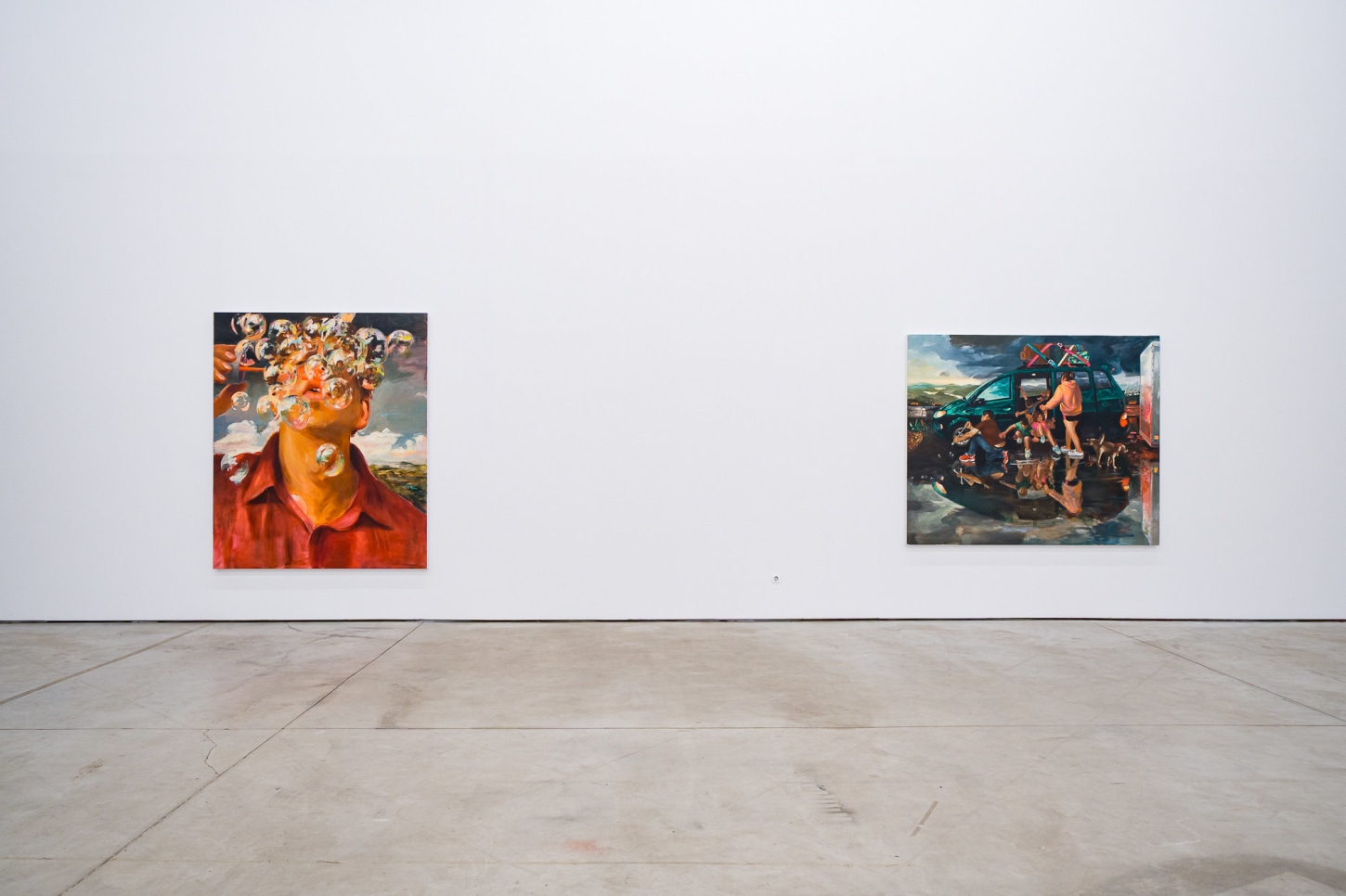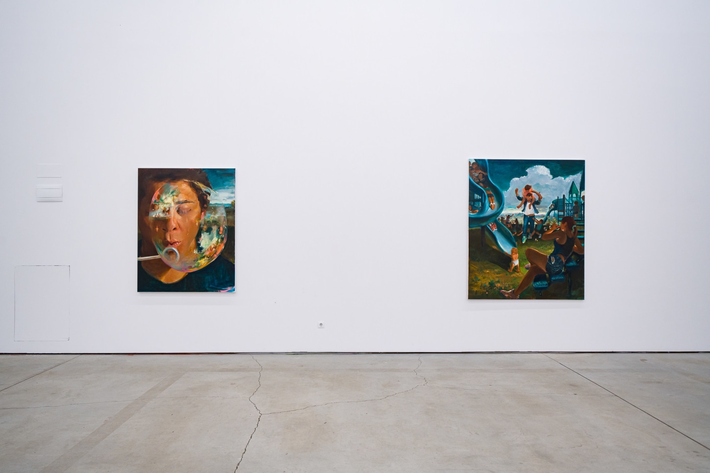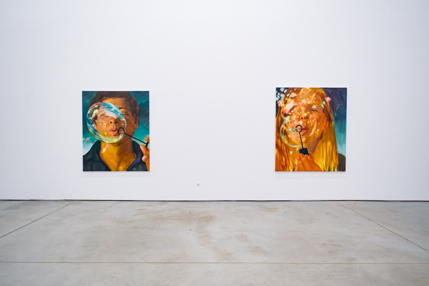 A recurring motif in the exhibition, bubbles have become important allegories for Madrigal as representing the transience of life and the ineffable experiences that he feels are increasingly overlooked as he ages. They highlight a contemplative interplay between the artist’s present moment and the inevitable outcomes of growth and the fleeting nature of childhood joy. Madrigal points to the 17th century notion of homo bulla, the Latin phrase meaning “man is a bubble.” In paintings from this period, bubbles were a metaphor for the brevity of existence and vanishing beauty. Rather than reminders of mortality, in works like Left With Only a Glimpse (2023) and Through the Flickering Present (2023), bubbles act as meditations between naivete and cynicism. Seen through the eyes of a child, bubbles uncover our innate proclivities towards things that glow and shimmer, and the simplicity of play comes to the fore.