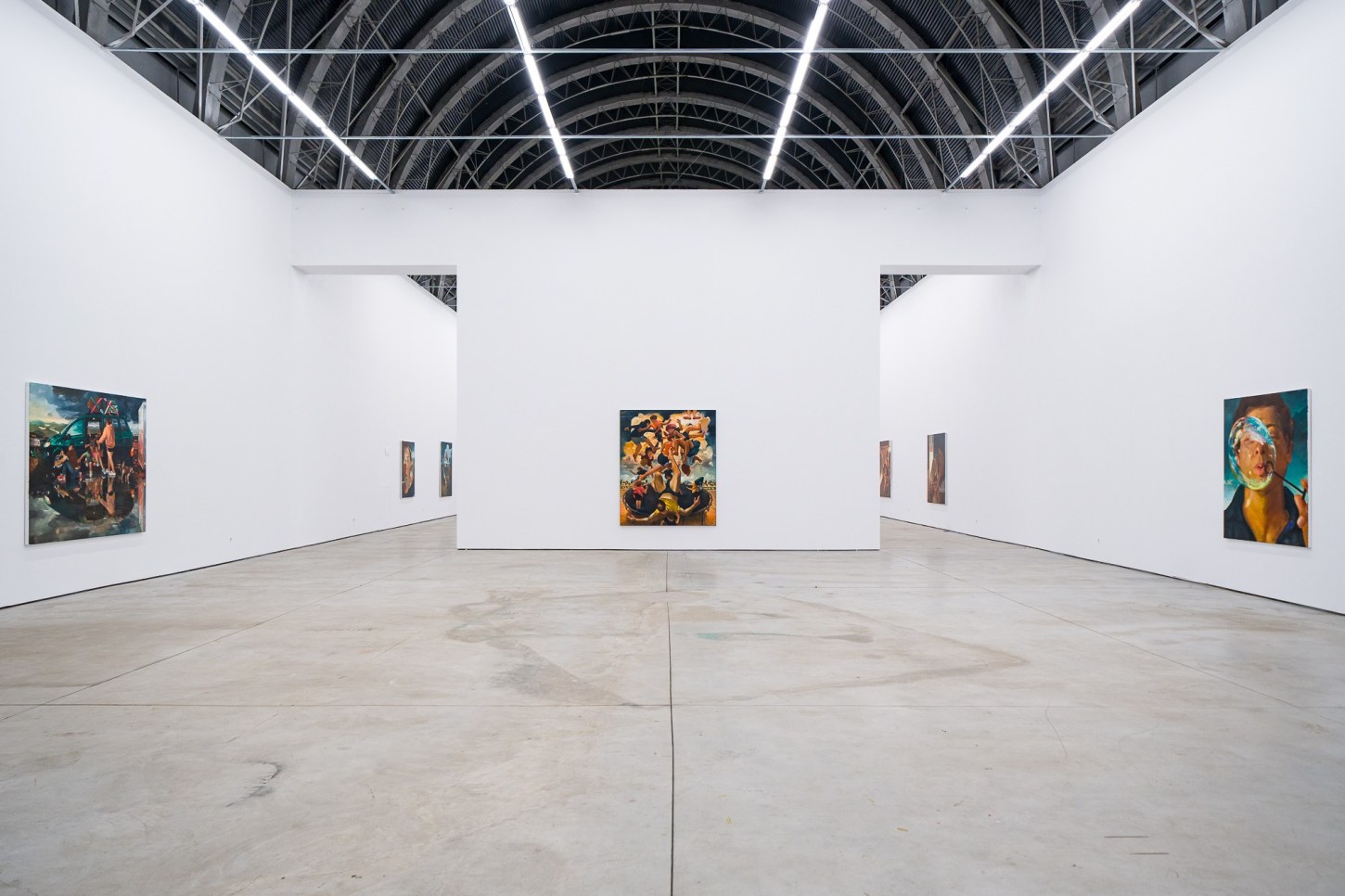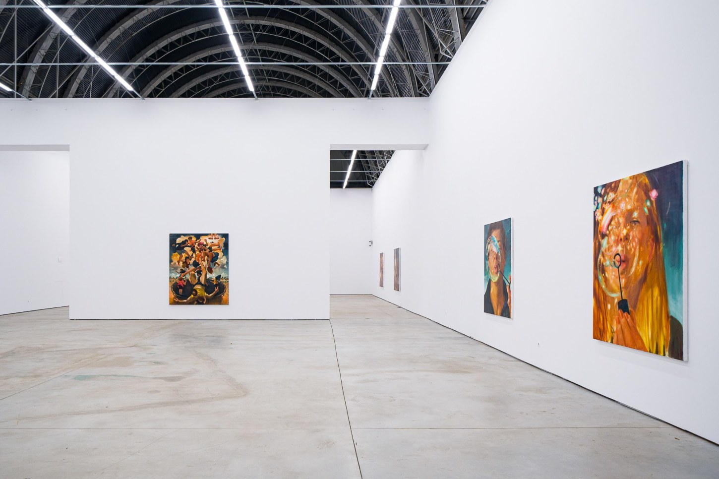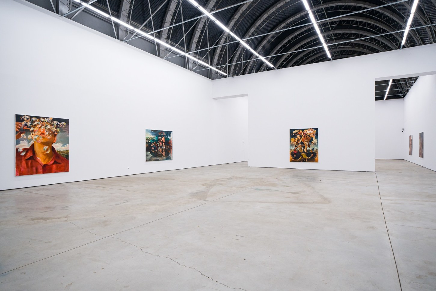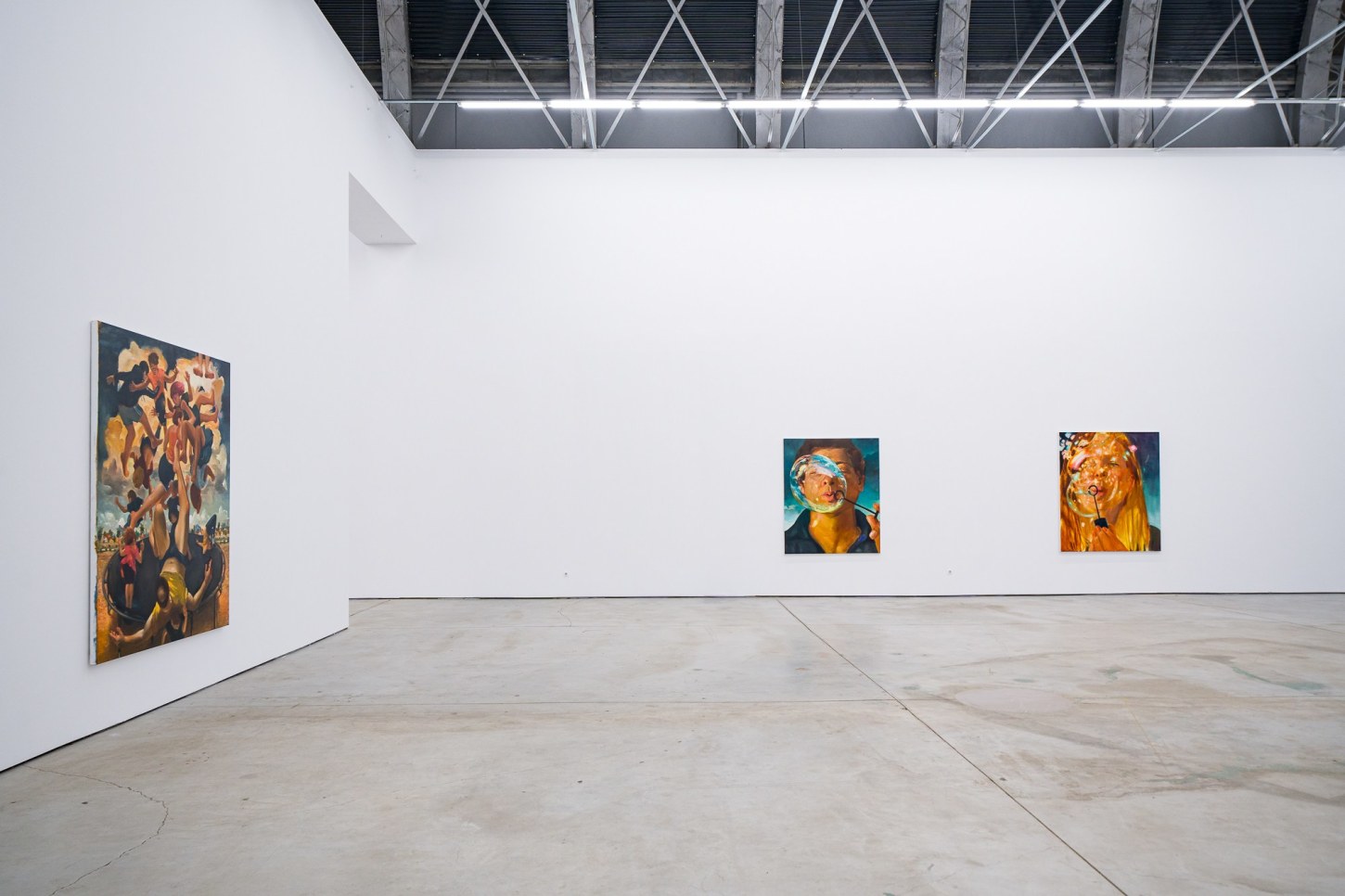 A recurring motif in the exhibition, bubbles have become important allegories for Madrigal as representing the transience of life and the ineffable experiences that he feels are increasingly overlooked as he ages. They highlight a contemplative interplay between the artist’s present moment and the inevitable outcomes of growth and the fleeting nature of childhood joy. Madrigal points to the 17th century notion of homo bulla, the Latin phrase meaning “man is a bubble.” In paintings from this period, bubbles were a metaphor for the brevity of existence and vanishing beauty. Rather than reminders of mortality, in works like Left With Only a Glimpse (2023) and Through the Flickering Present (2023), bubbles act as meditations between naivete and cynicism. Seen through the eyes of a child, bubbles uncover our innate proclivities towards things that glow and shimmer, and the simplicity of play comes to the fore.