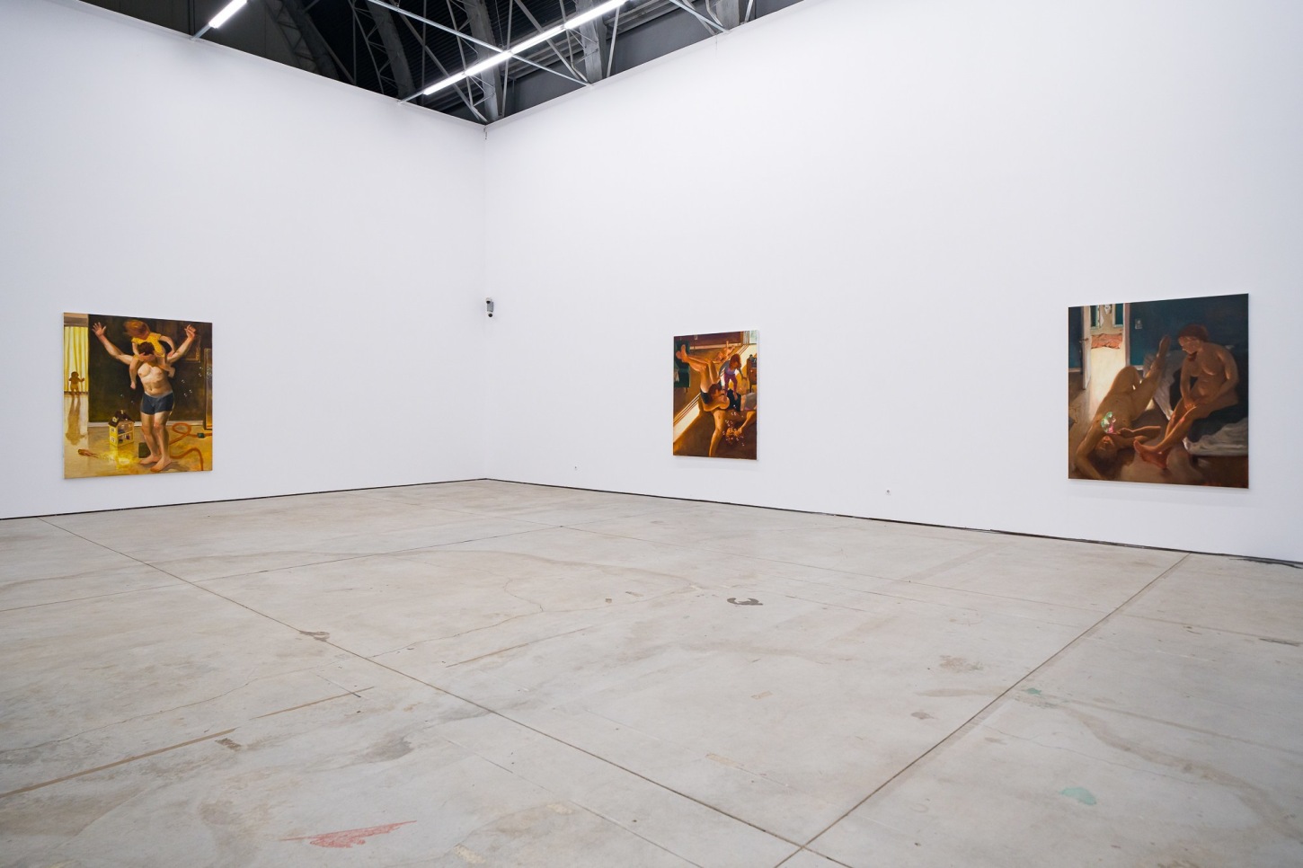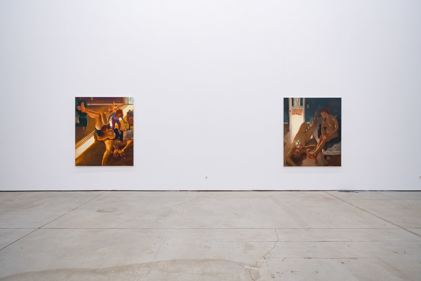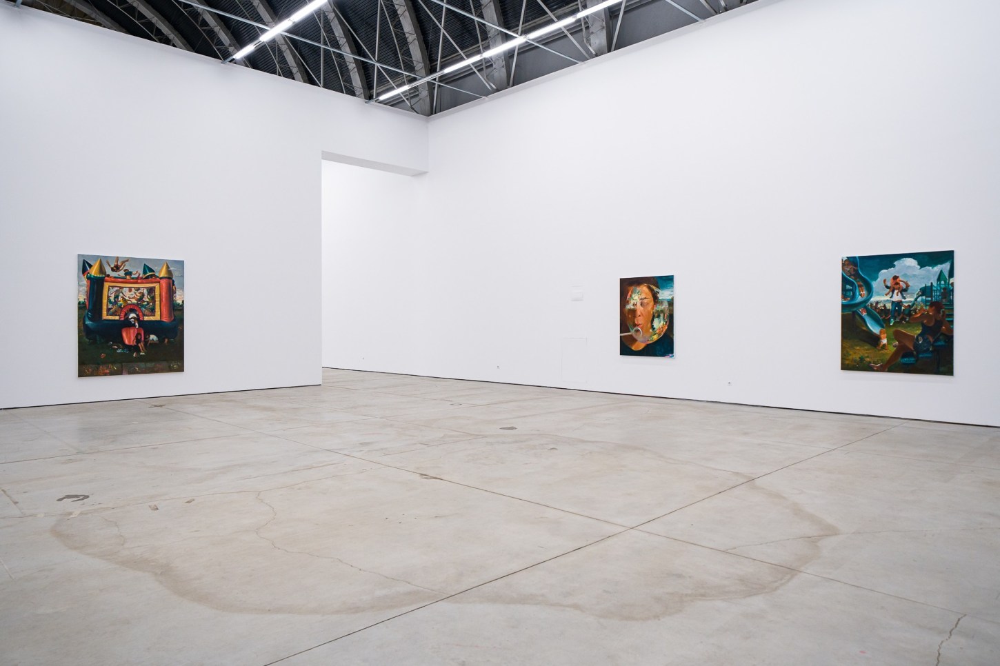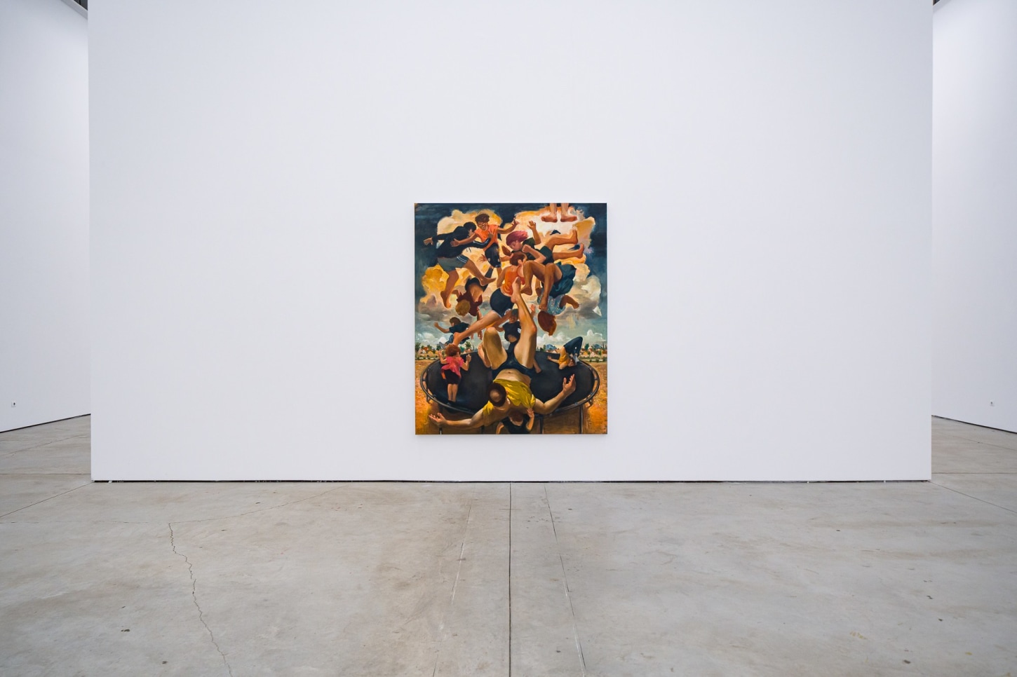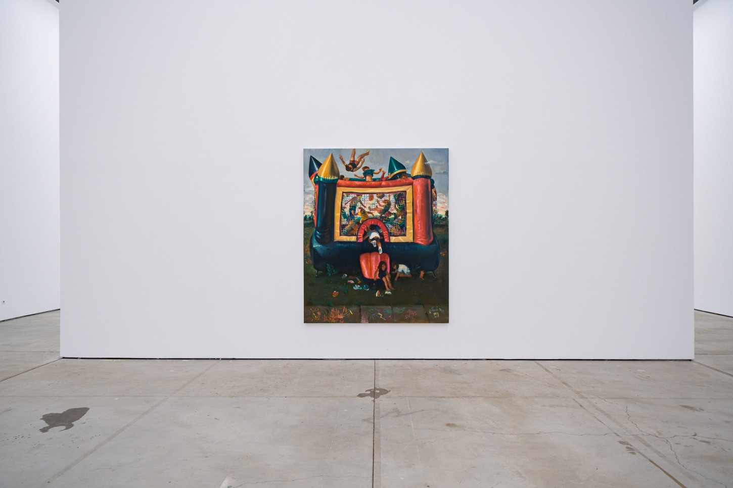 This frame of mind directly applies to Madrigal’s painting process and subject matter. The works feel concrete, yet forged from dreamlike memories of family life, fatherhood, and the everyday. A kindred spirit to painters like Norman Rockwell, Wayne Thiebaud, Jan Steen, and the pre-Raphaelites, Madrigal lingers in the periphery of the contemporary art world while capturing the imagination of the common person, along with the chaos and intimate details of quotidian life. A product of his environment, a signature of Madrigal’s practice is how he interweaves his immediate surroundings with larger cosmic questions. Playgrounds, children’s birthday parties, small kitchen fires, and the arid Arizona landscape act both as backdrops and main characters, symbolizing how domesticity can shift suddenly from the mundane to the extraordinary.