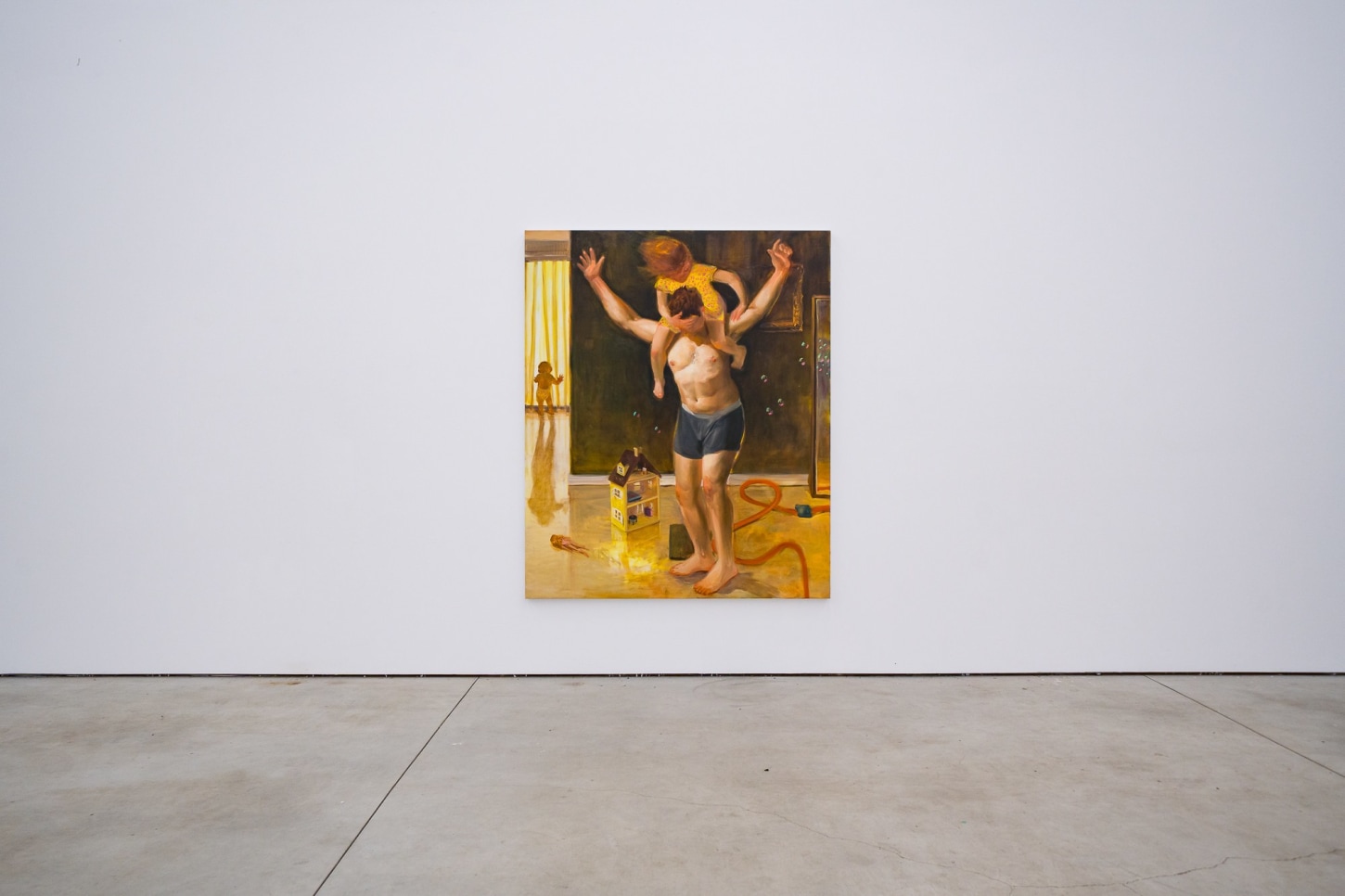 In contrast to this is a cynicism inherent to parenthood, aging, and suburban life that Madrigal has learned to live with. Dwelling in the tension between these two poles allows the artist to break open existential questions that are familiar to all parents, regardless of context—namely, is it possible to engage in the world with childhood optimism after so much human failure, especially our own? Within the last year in particular, the veil of cynicism has been a wrestling point for Madrigal, and these paintings were a way for him to see his immediate context through a different lens. As a mechanism for survival, and certainly in service to his children, family, and community, Madrigal dwells in the shimmering, ineffable qualities of existence, knowing that no matter where he chooses to live, he and his family will never be void of awe. A romantic at heart living a practical lifestyle in the suburbs, Madrigal ignites routine elements of daily life like an anthropologist. By doing so in a way that legitimizes our relationship to normalcy and elevating it with an air of sophistication and urgency, Madrigal underscores universal anxieties about parenthood, banality, and the nature of complacency. In his words, “At the end of the day, no matter where I am, I am still in this mysterious, amazing endeavor. So who’s to say that what’s happening thirteen billion lightyears away is any more beautiful than doing the dishes?”