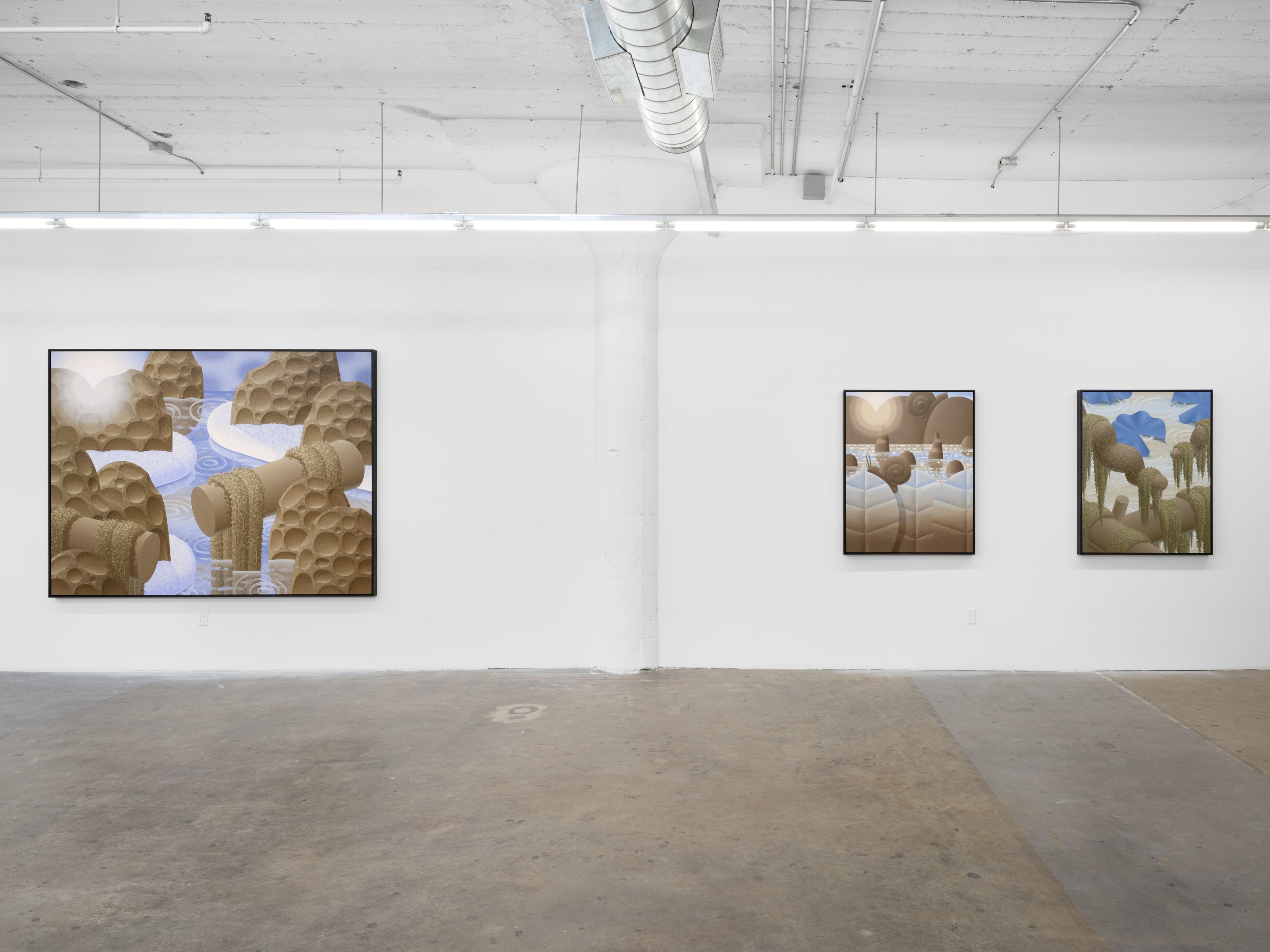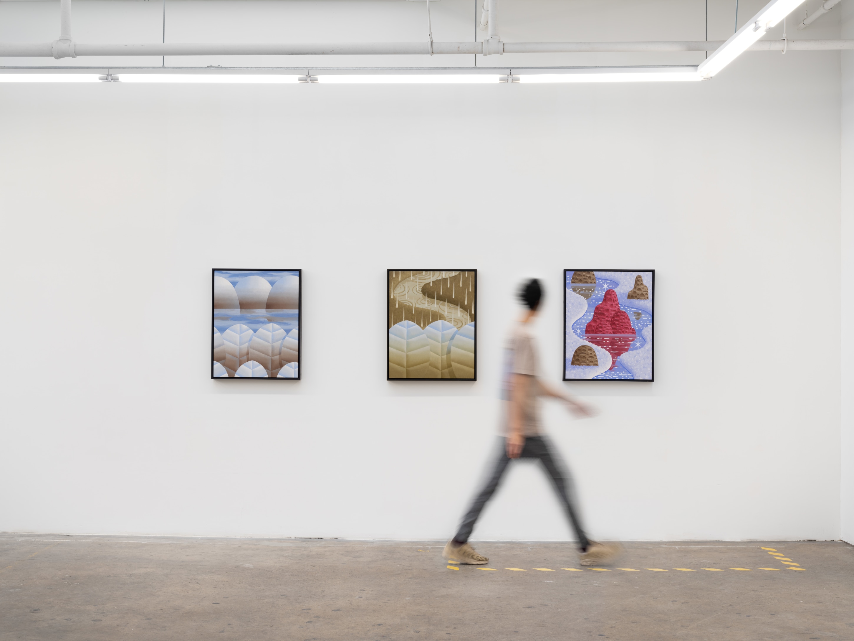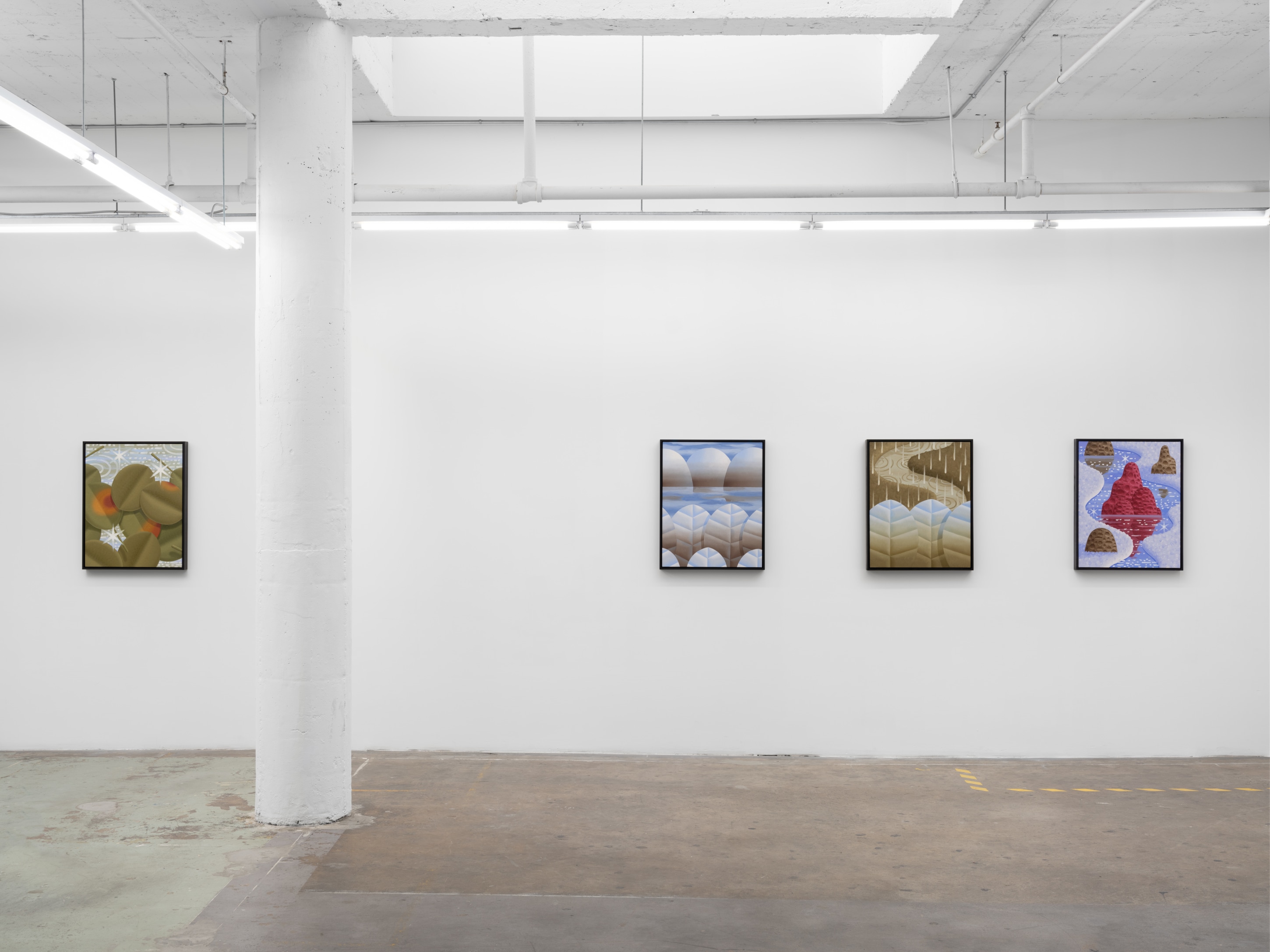 When it finally stopped raining, he walked home through the city park on a route he takes everyday. The sunset light sparkled on a nearby pond. He carried the way the water reflected the pinks and purples from the sky and the light leaks from the clouds with him back to the studio the next day. Sunnier, brighter environments overtook his canvases in the days following.