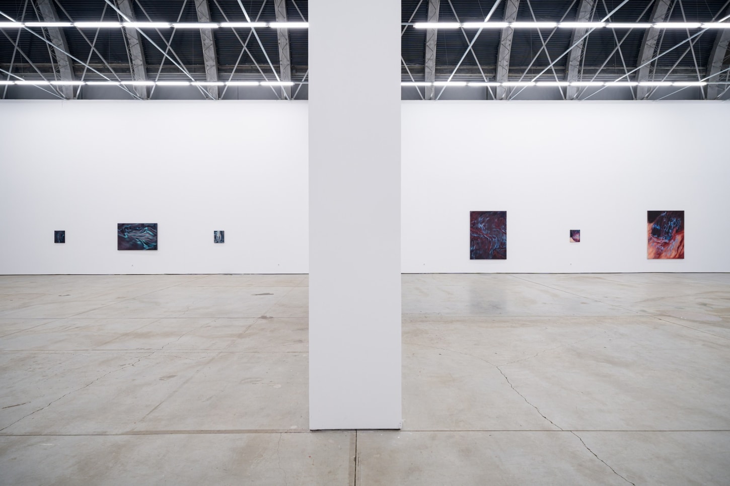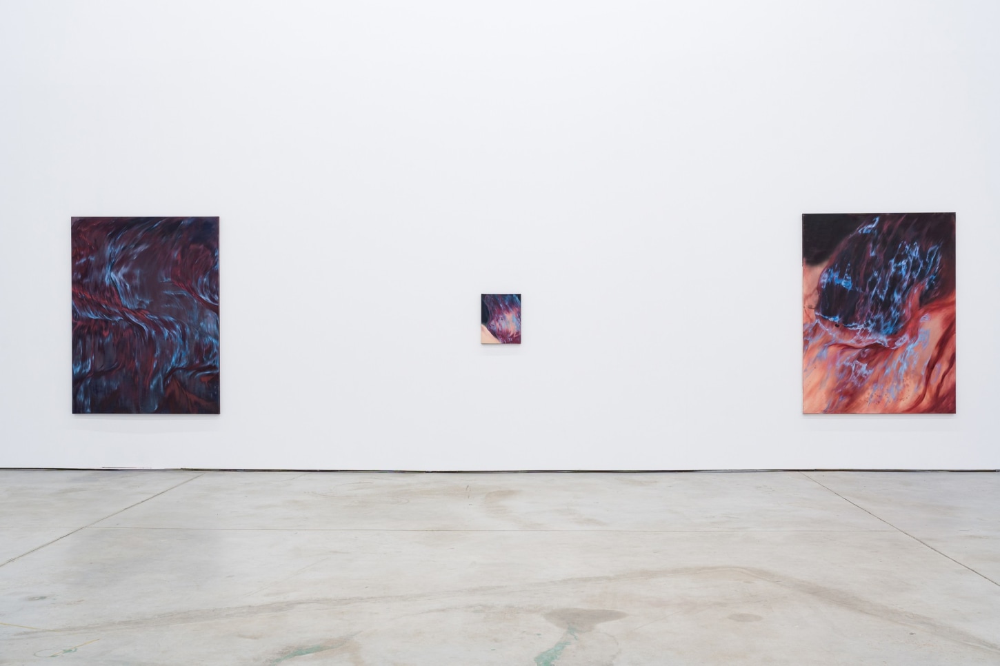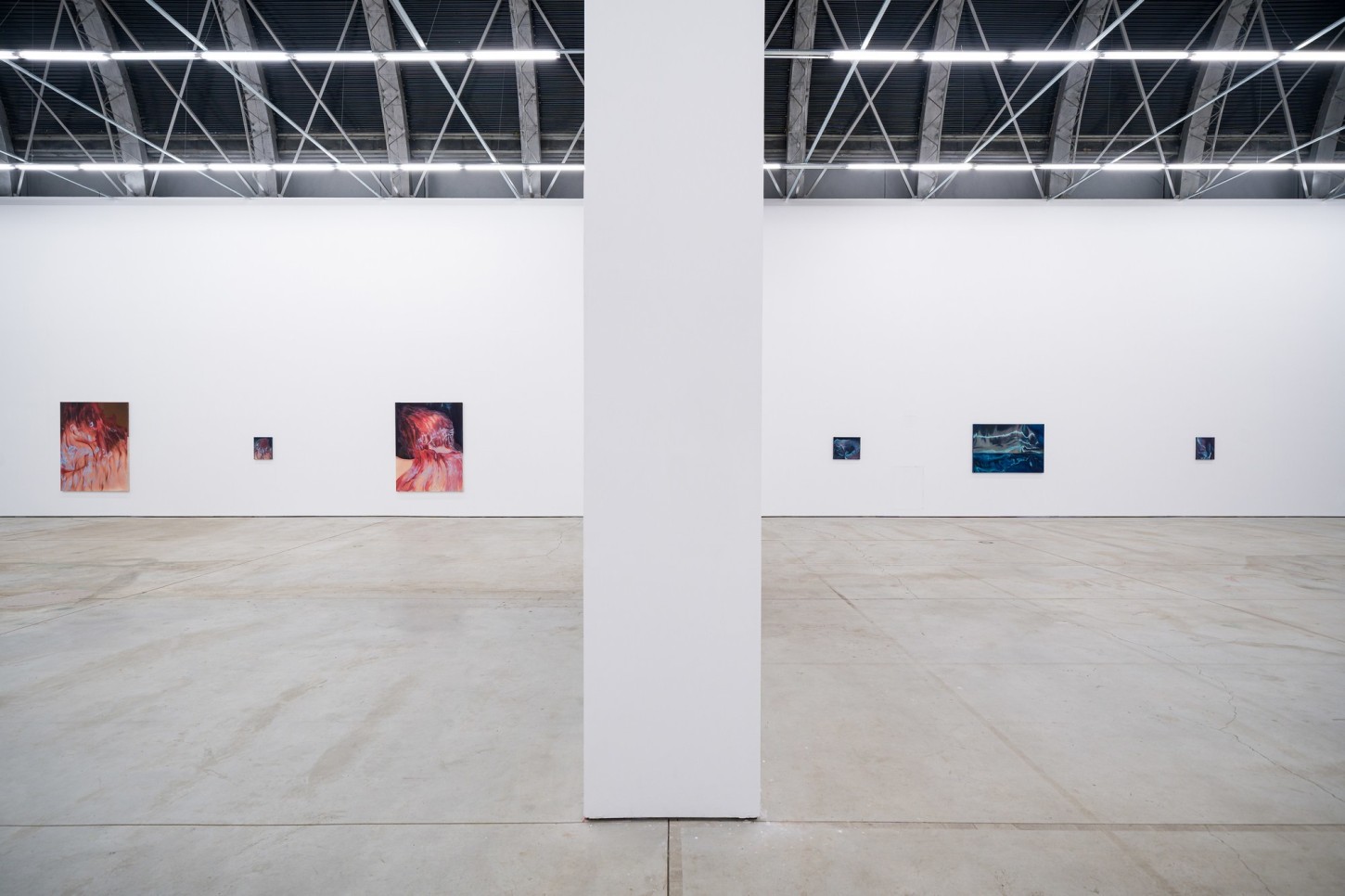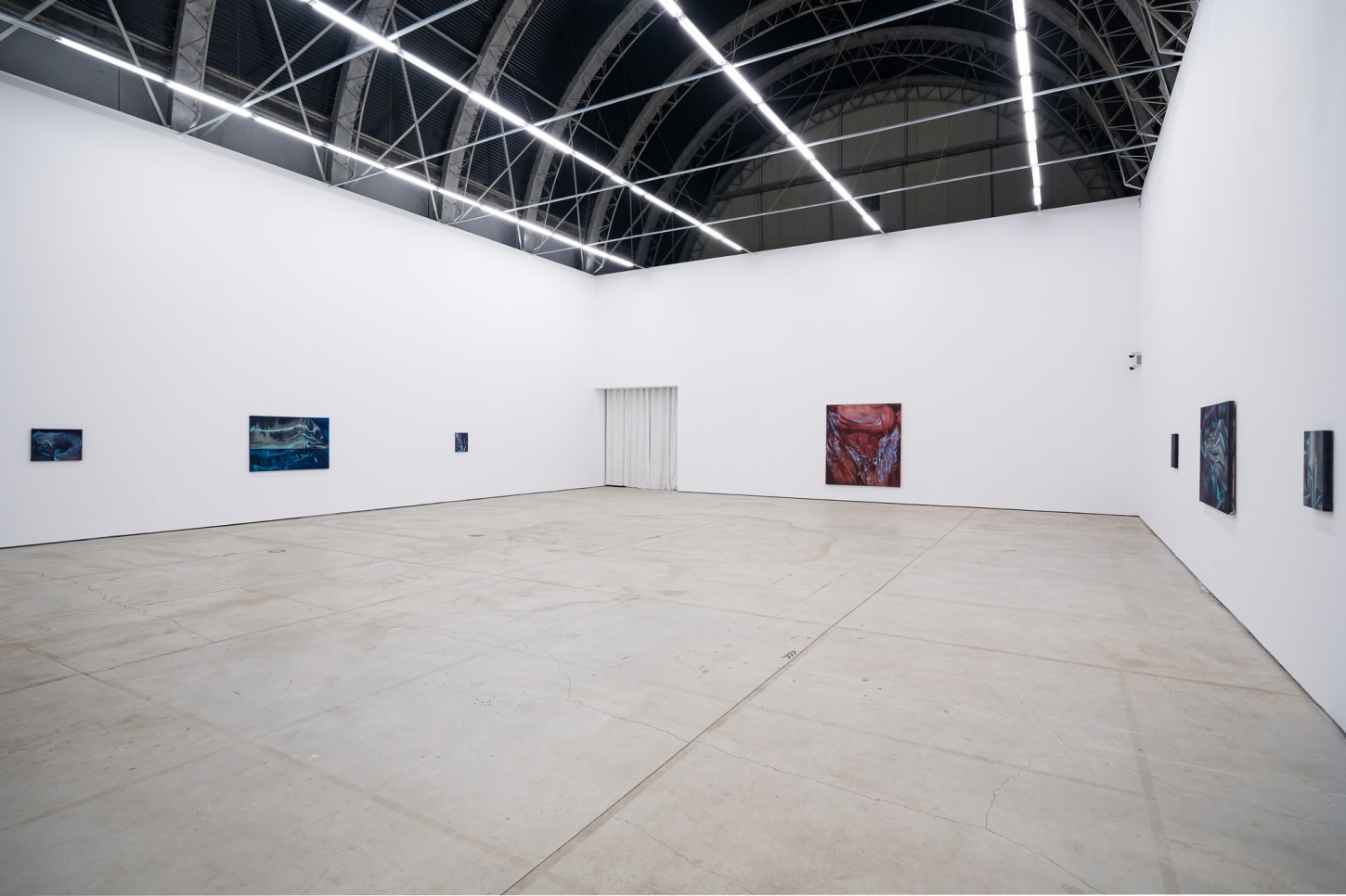 付亮的创作中存在着更多的二元性,艺术家将可见与不可见、存在与缺席混合在一起。 通过油与水性矿物颜料的相互作用,哑光和光泽共同唤起轮廓的层次,在流动的波动中模糊与再现。 胭脂红,《潮汐与星辰的残留》中的胭脂色,既暗示着裸露的身体,也暗示着隐藏在其下的内脏活力。