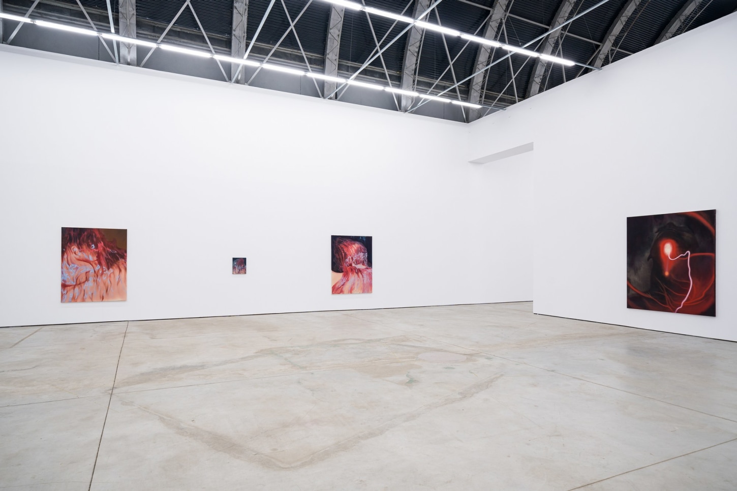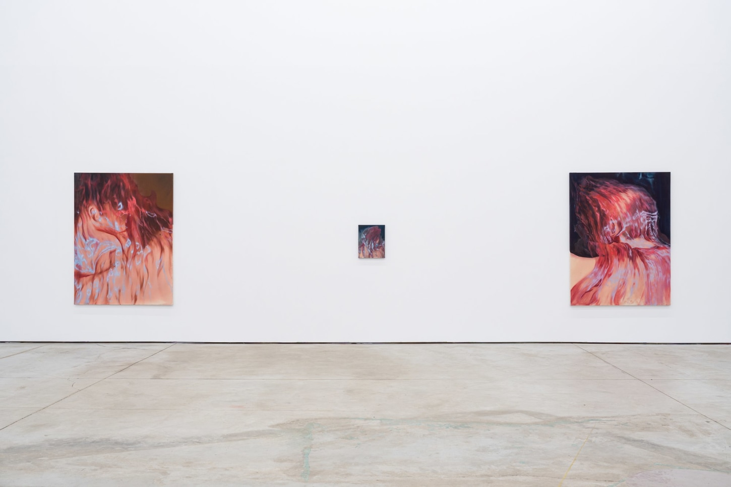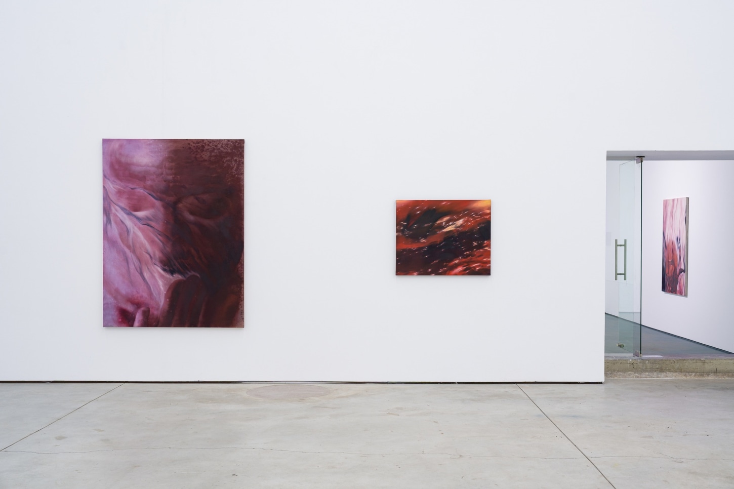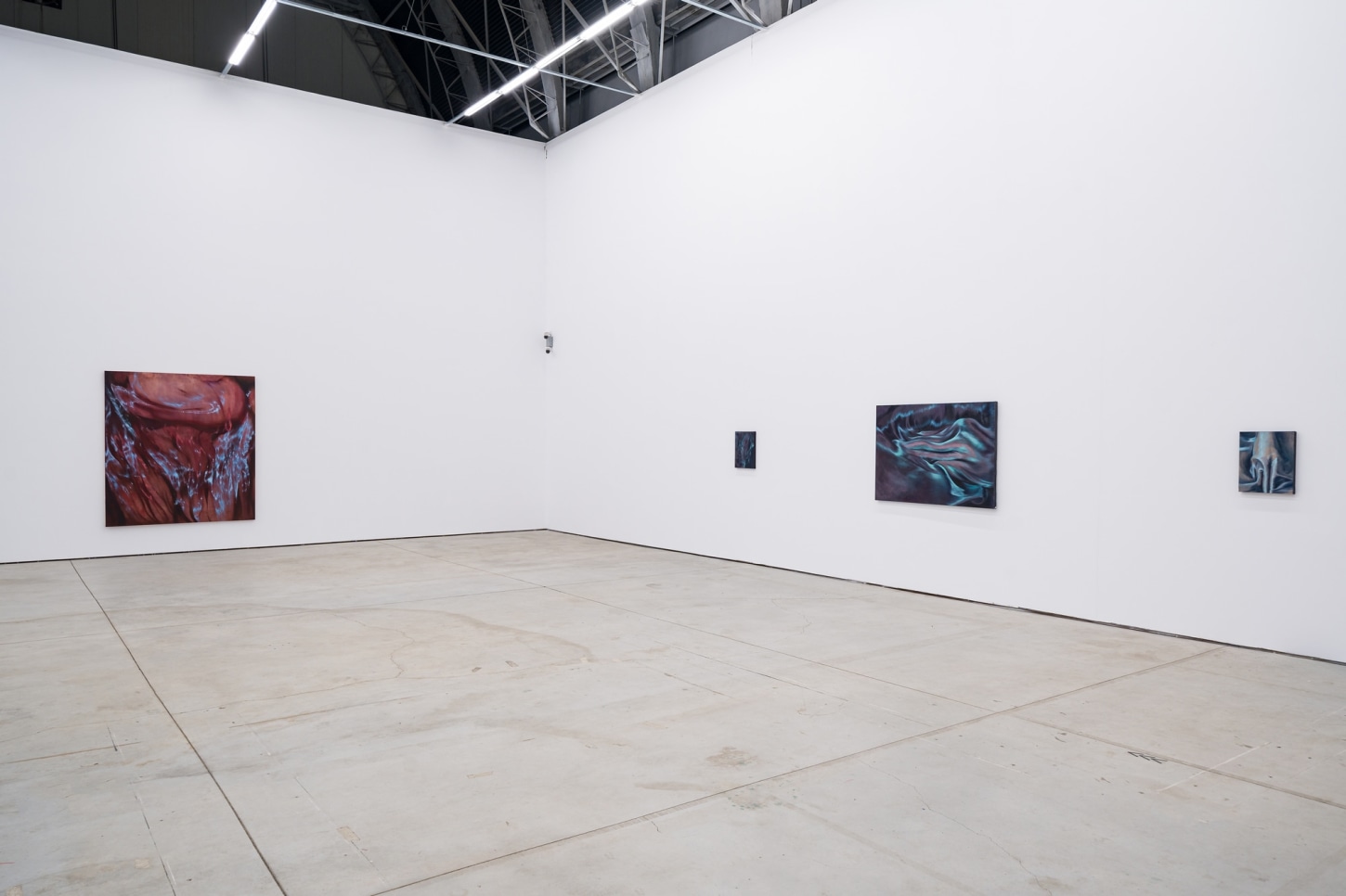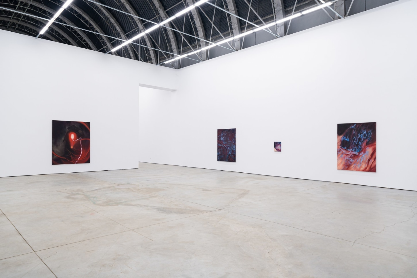 付亮的创作中存在着更多的二元性,艺术家将可见与不可见、存在与缺席混合在一起。 通过油与水性矿物颜料的相互作用,哑光和光泽共同唤起轮廓的层次,在流动的波动中模糊与再现。 胭脂红,《潮汐与星辰的残留》中的胭脂色,既暗示着裸露的身体,也暗示着隐藏在其下的内脏活力。