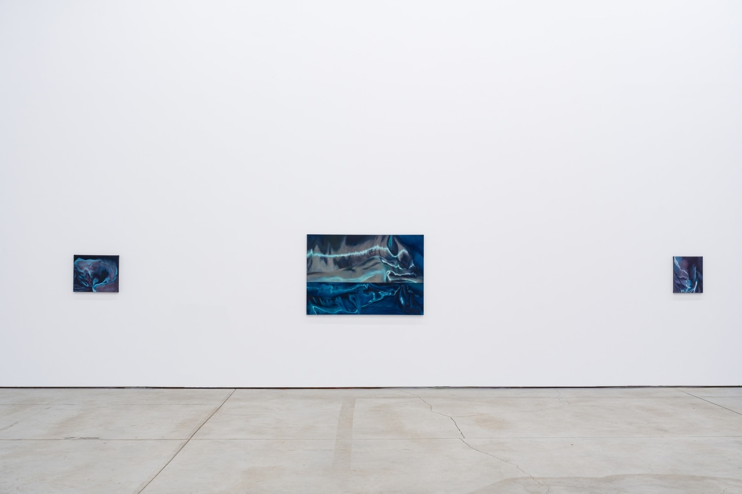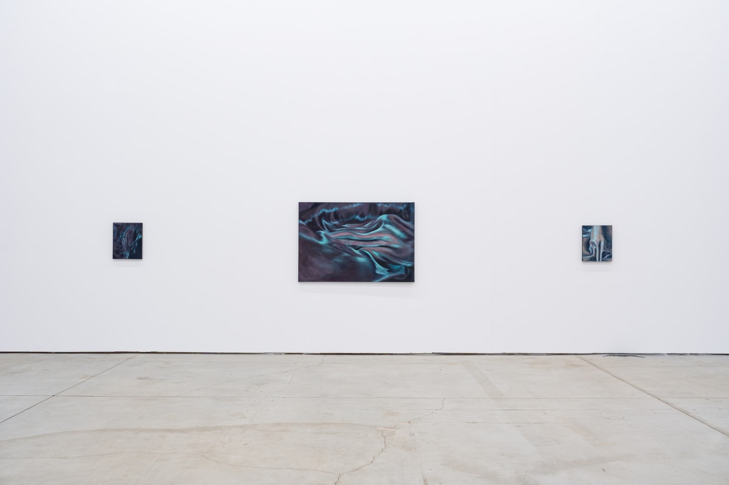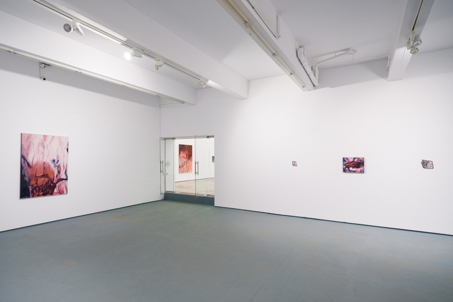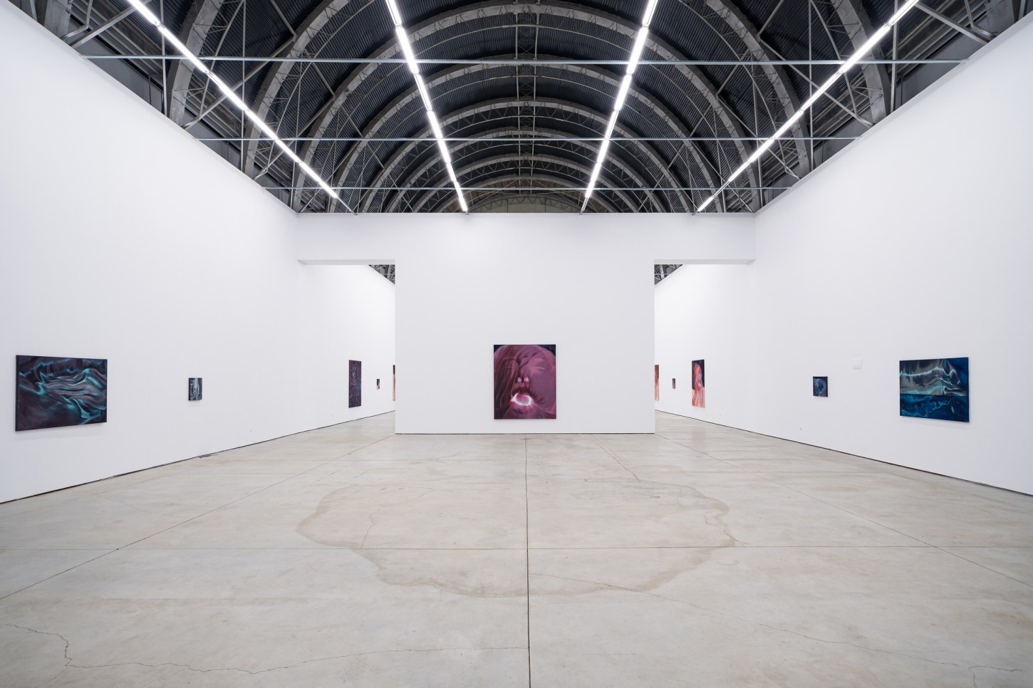 付亮的创作中存在着更多的二元性,艺术家将可见与不可见、存在与缺席混合在一起。 通过油与水性矿物颜料的相互作用,哑光和光泽共同唤起轮廓的层次,在流动的波动中模糊与再现。 胭脂红,《潮汐与星辰的残留》中的胭脂色,既暗示着裸露的身体,也暗示着隐藏在其下的内脏活力。
