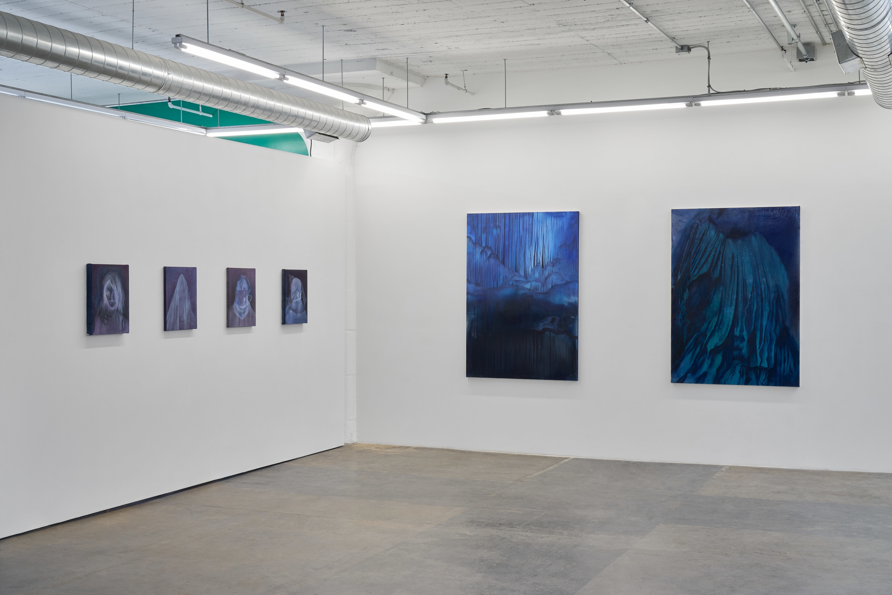 Liang Fu’s compositions stem from a drop of water. Using pigments on unprimed canvas, he begins with a diffusion of colors, figures, and forms. The figurative dimensions of Fu’s subjects are blurred, blending interior and exterior, visible and nonvisible, presence and absence. What emerges in his paintings may appear to be landscapes, or figures, or ghosts as they dissipate into the background. The viewer’s understanding of the image oscillates, remaining elusive and ever-changing. Fu notes, "It may feel as if the picture is watching the viewer, forcing them to continuously adapt." Water, as weightless as it may seem, is what causes the pigment to pervade and transform the thickness of Fu’s canvases.