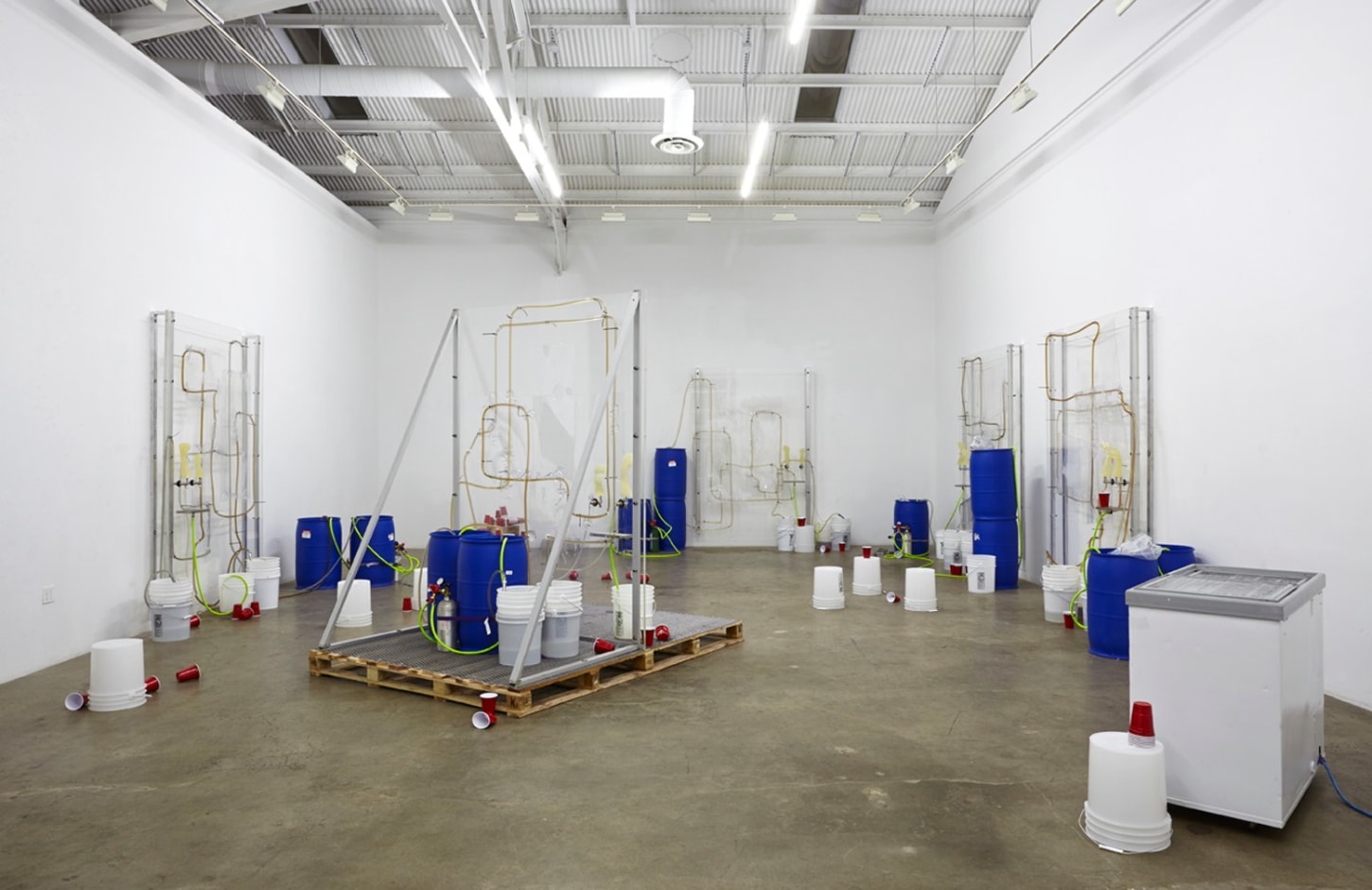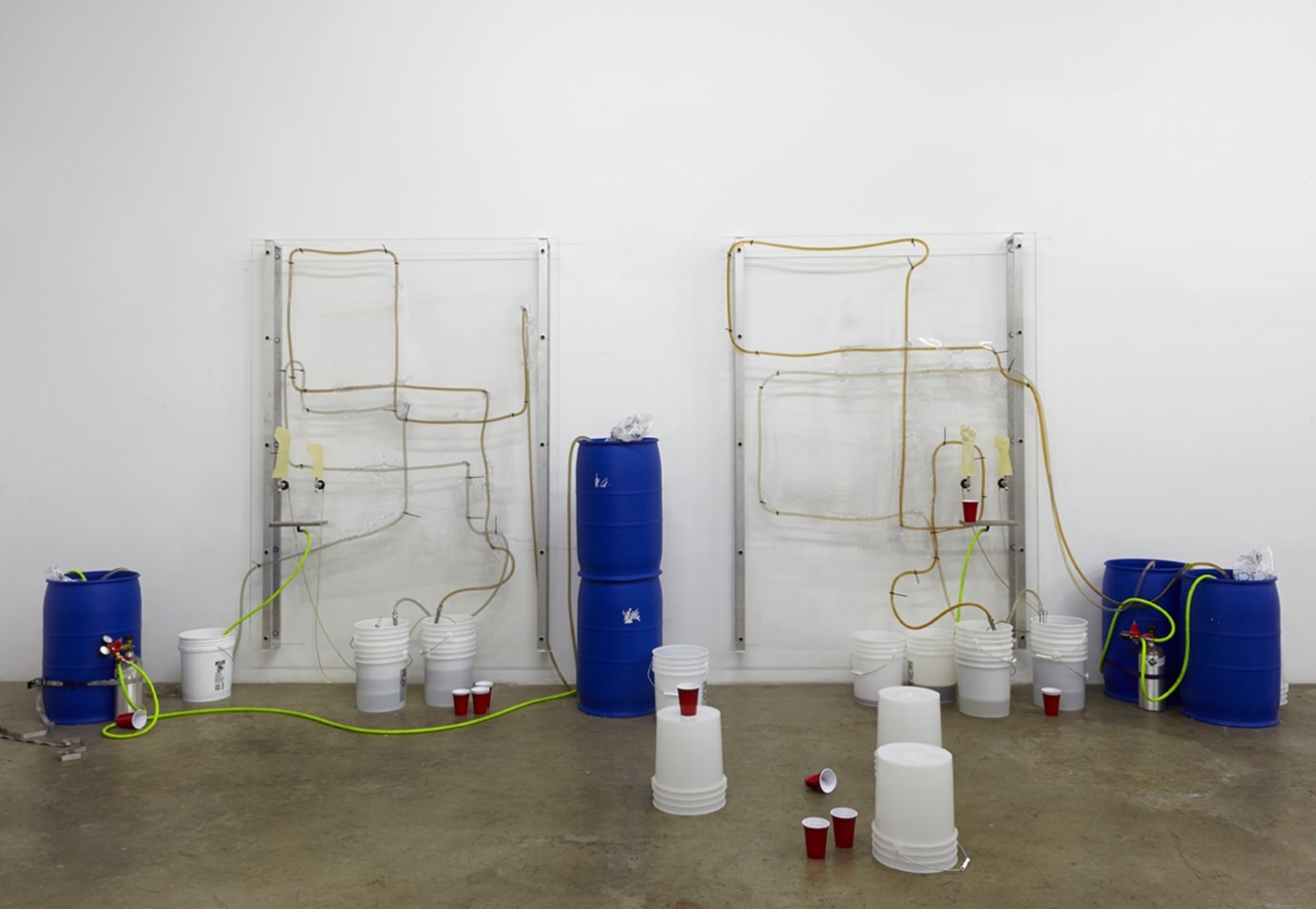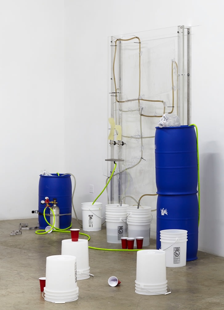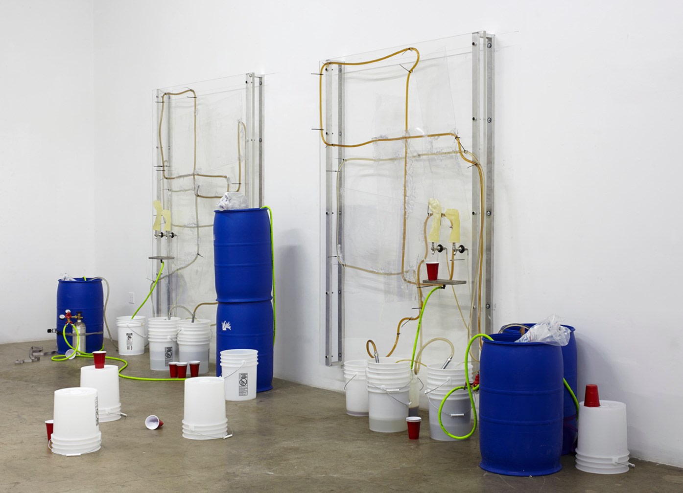 Ceulers describes the work as ‘paintings on life support’. Literally. Rigged with plastic tubing, sutures and stomas, the sculptures’ intestinal mazes feign a functional path through the ‘body’ of the work; however, their clinical function subscribes more to the pictorial than biological. Similar conceptual tensions give the exhibition an errant hopefulness: sincerity, self-effacing irony, ambition and ego are all sadly philosophized in unfalteringly comedic grandeur. High production value meets raw assemblage as remnant beer escapes the tap into blue, commercial vats (evocative of super-sized colostomy bags) where it will wait to sour like bile. For Ceulers and Salvador, the metaphysical distance between themselves and the viewer is exaggerated by the pantomimed fraternity of their own relationship. Though the joke in end may self-consciously be on one another as Ceulers and Salvador present bro-mance and its puerile associations as the ultimate comedic tragedy.
