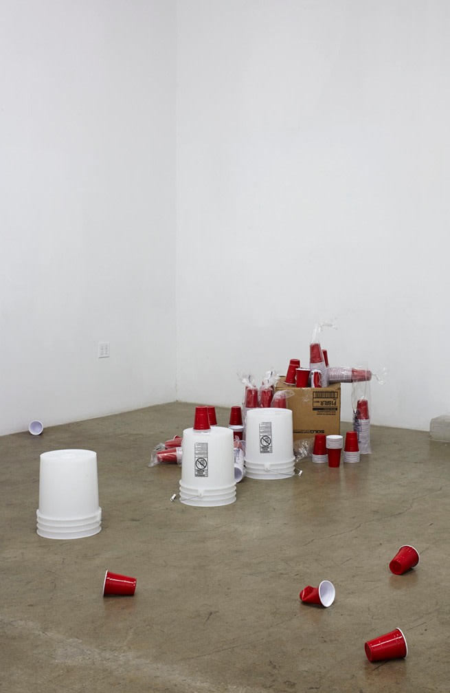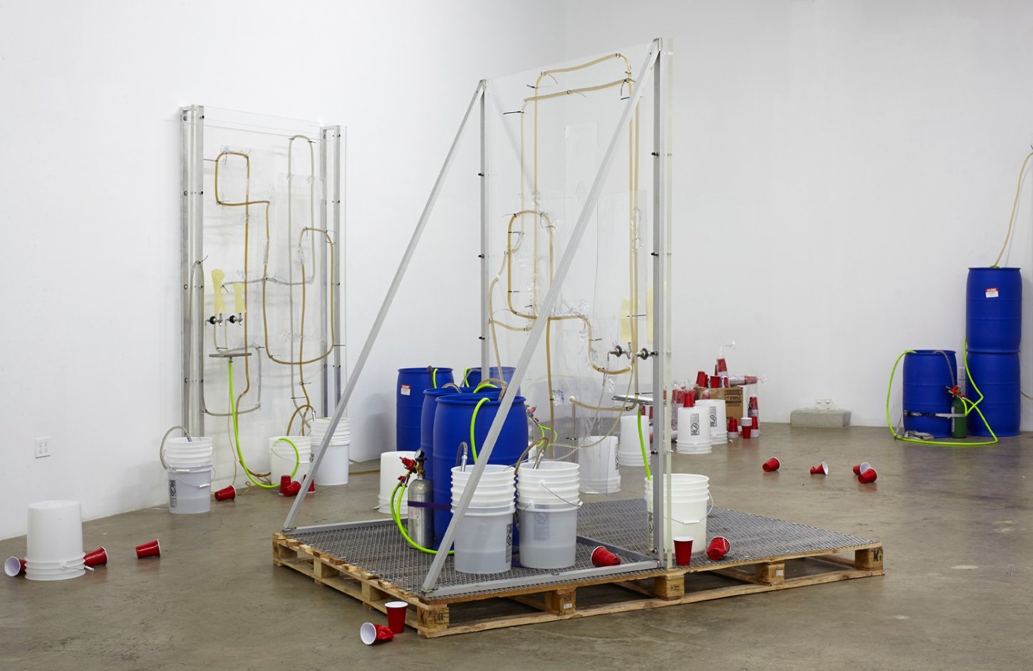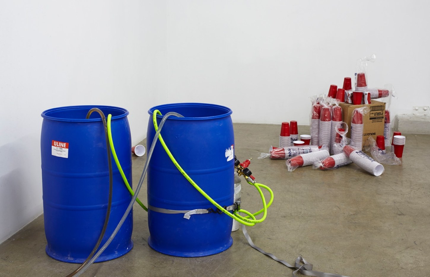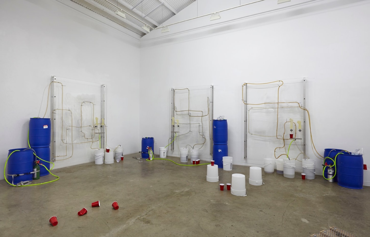 Ceulers describes the work as ‘paintings on life support’. Literally. Rigged with plastic tubing, sutures and stomas, the sculptures’ intestinal mazes feign a functional path through the ‘body’ of the work; however, their clinical function subscribes more to the pictorial than biological. Similar conceptual tensions give the exhibition an errant hopefulness: sincerity, self-effacing irony, ambition and ego are all sadly philosophized in unfalteringly comedic grandeur. High production value meets raw assemblage as remnant beer escapes the tap into blue, commercial vats (evocative of super-sized colostomy bags) where it will wait to sour like bile. For Ceulers and Salvador, the metaphysical distance between themselves and the viewer is exaggerated by the pantomimed fraternity of their own relationship. Though the joke in end may self-consciously be on one another as Ceulers and Salvador present bro-mance and its puerile associations as the ultimate comedic tragedy.