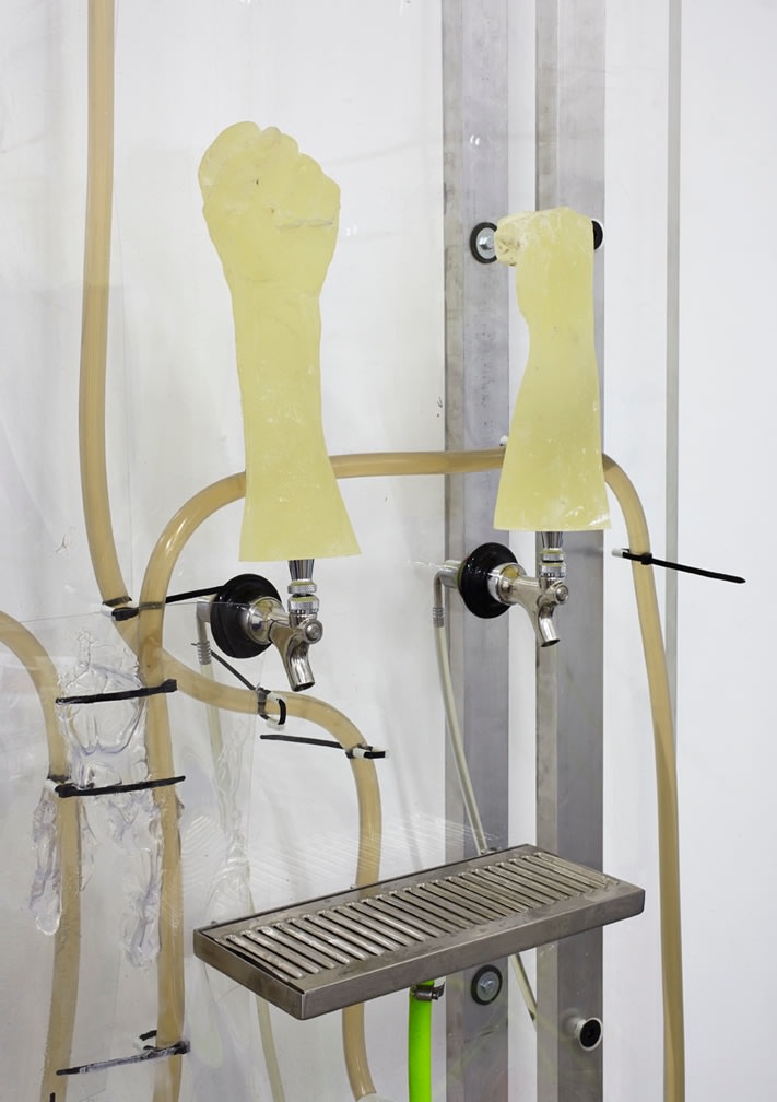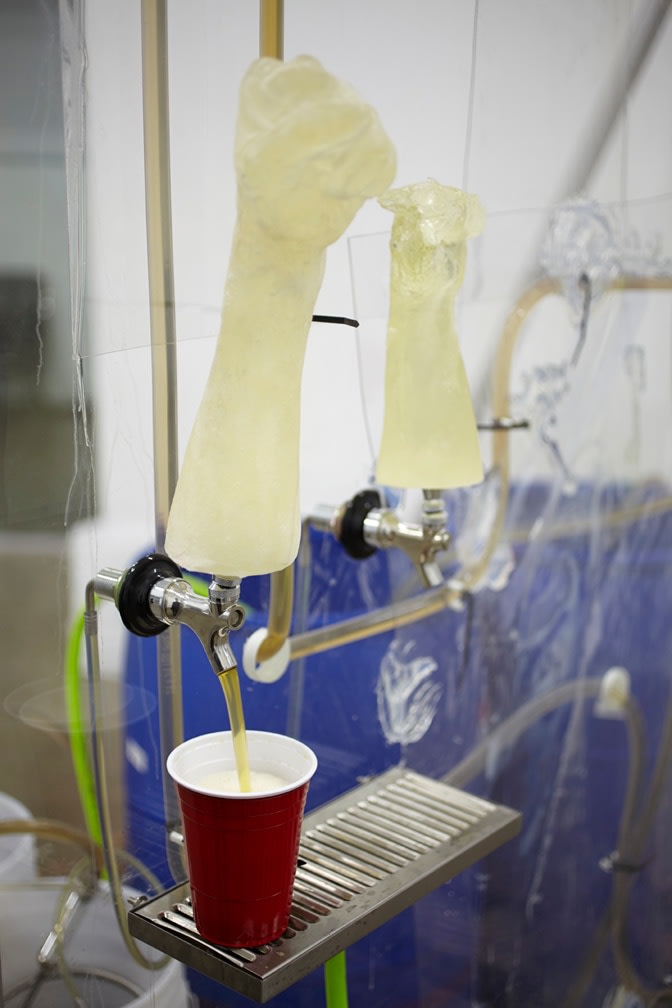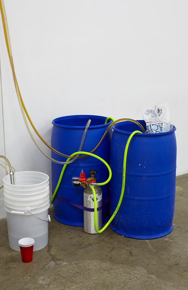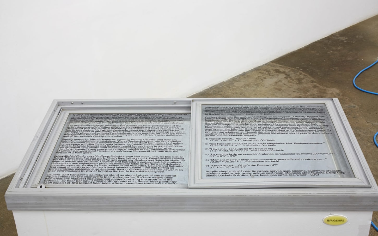 Ceulers’ and Salvador’s sculptures stand as almost physical and material equivocations for the answers to their pub-queries. It’s here where their conversations manifest into poignant comedy proving the proof is in the process....or beer per say. Almost anthropomorphic, these ‘beer paintings’ each consist of two tapped beer kegs whose hose-lines transverse a grid-like armature. Each is rigged with a fully functioning tap from which the viewer may help him or herself to one of the two beers on offer. The sculptures are as autobiographical as they are mimetic, each draught handle is a cast of one of the artists’ forearms, the coinciding beer relating dopily to that artist’s hometown or a personal anecdote in their friendship’s narrative. The result is a convergence of frat-boy with soothsayer, bathos with pathos.